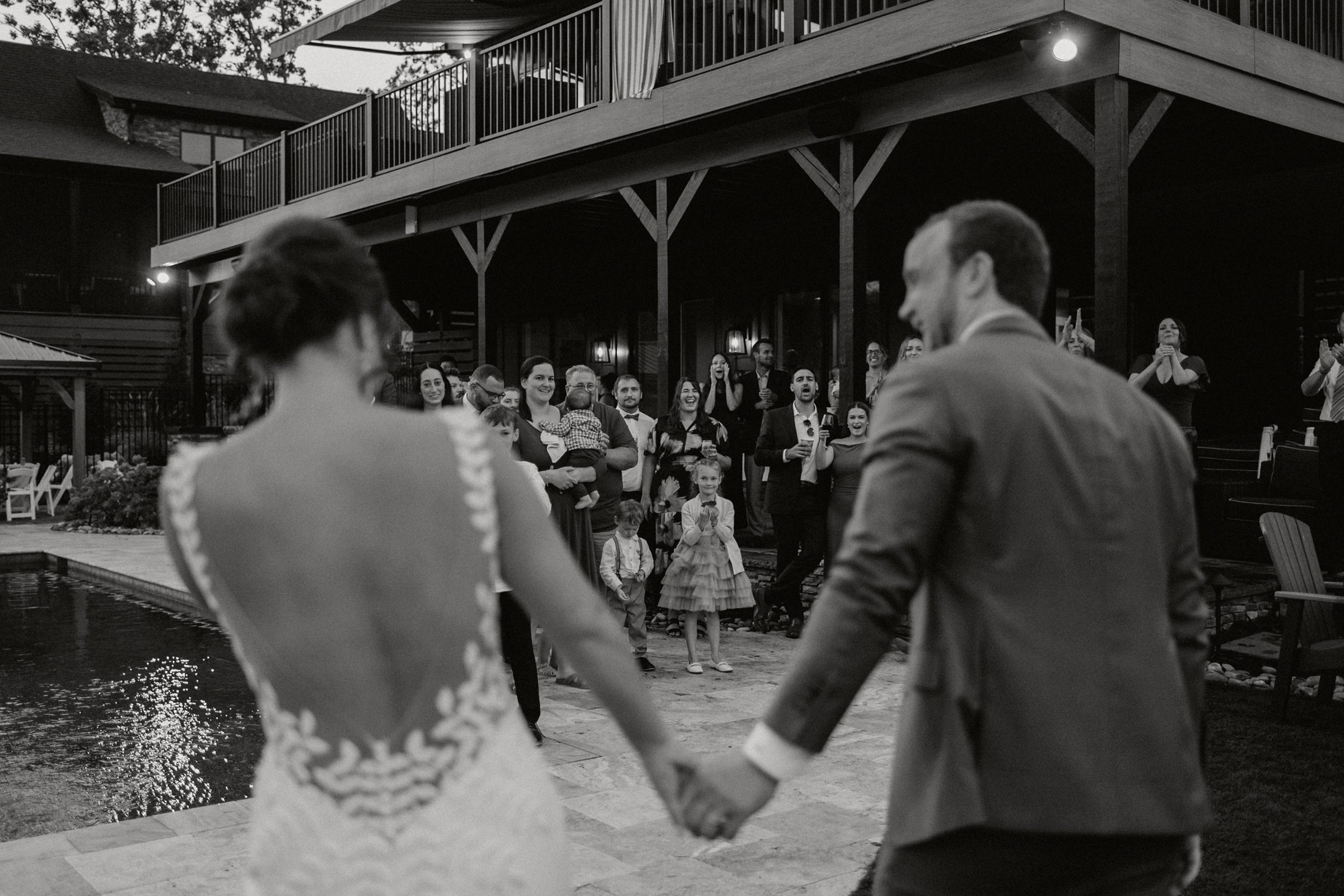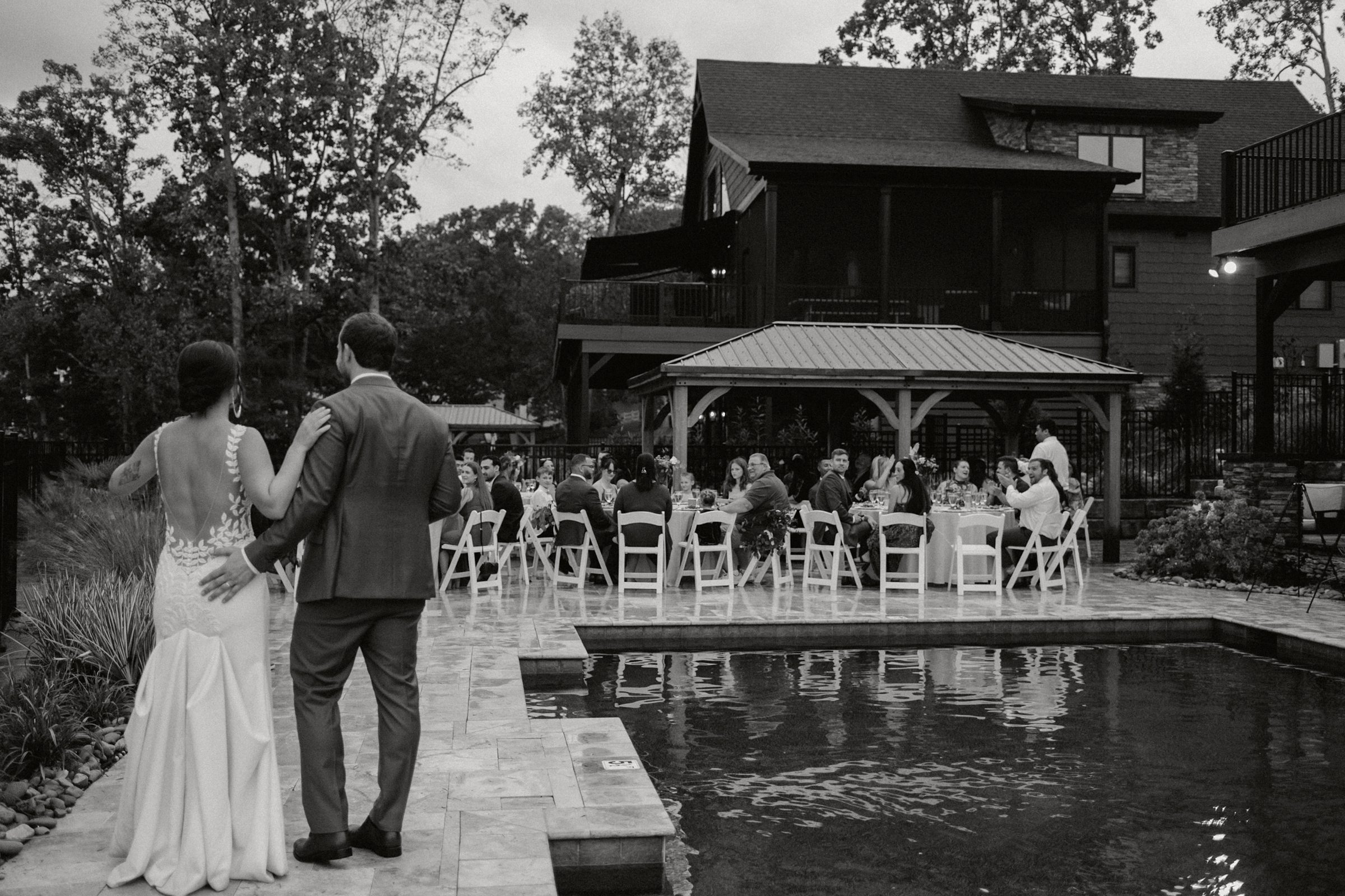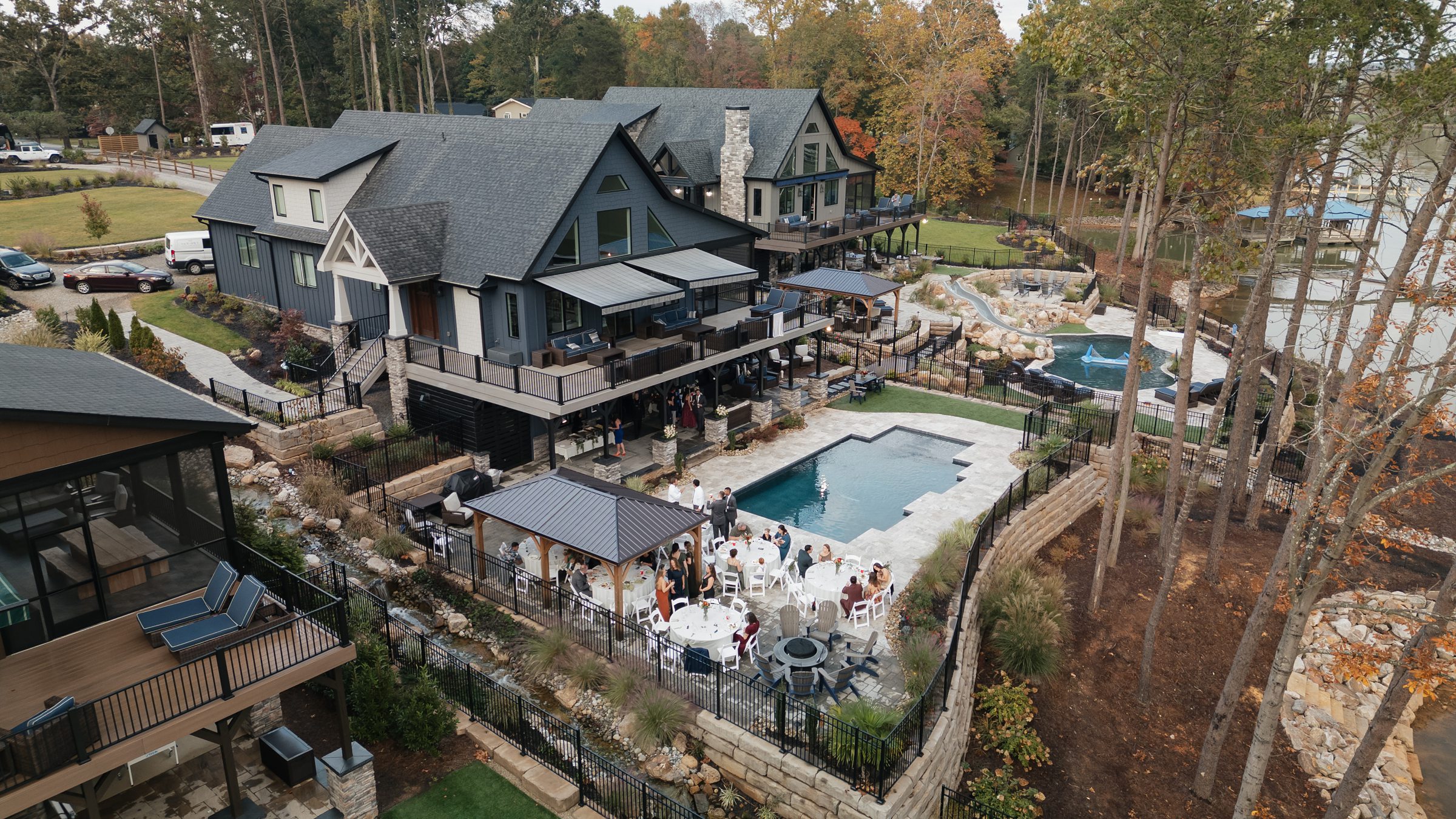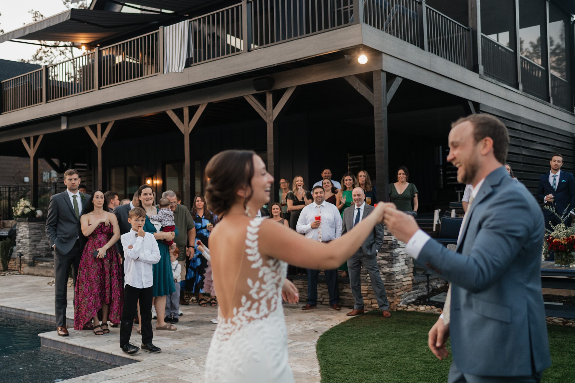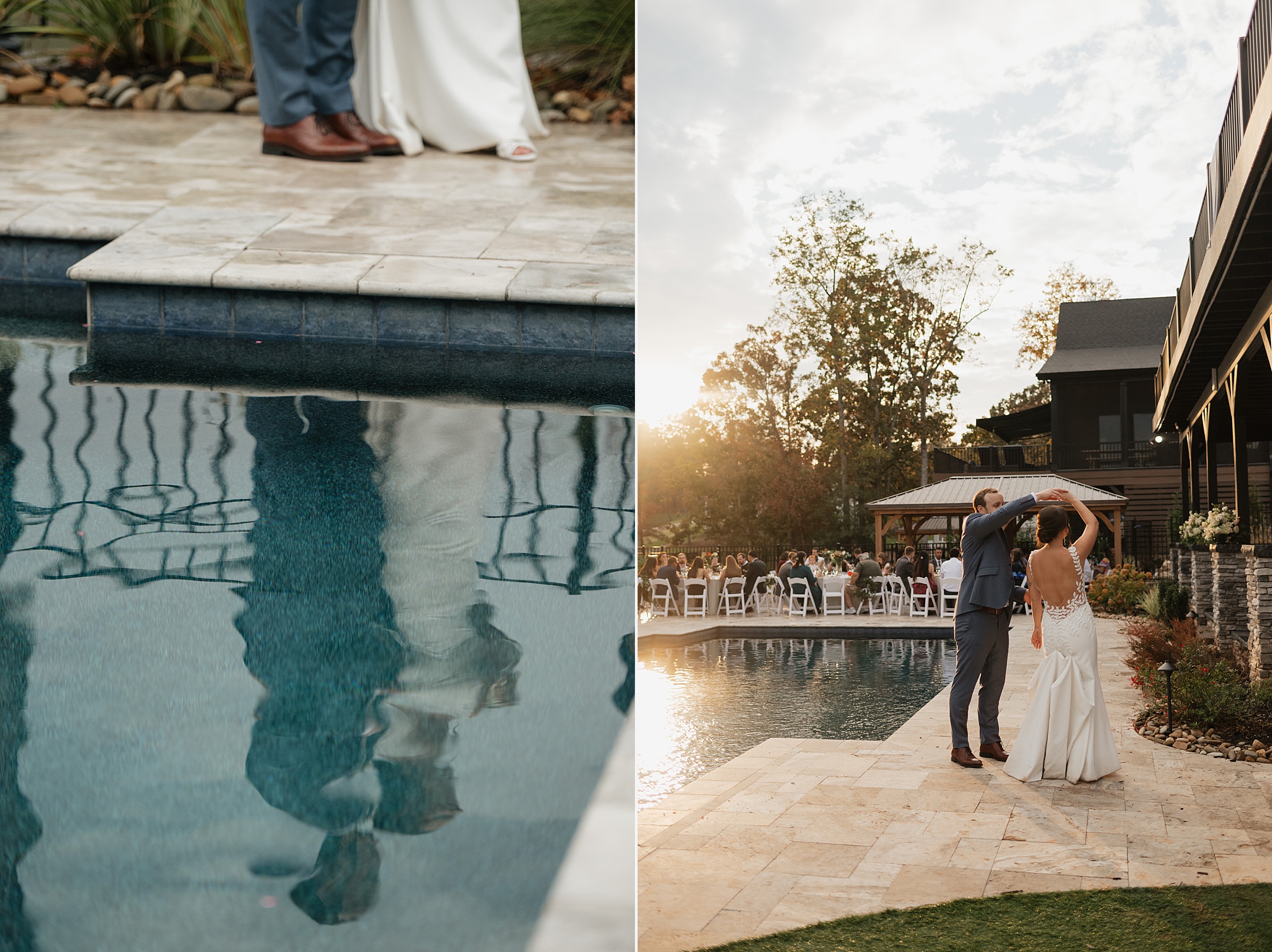Dinner being served around one of the home’s pools created a relaxed, and elegant vibe under the evening sky. We were able to get some great drone shots of their first dance while the sun set over the lake, painting the water in golden light.