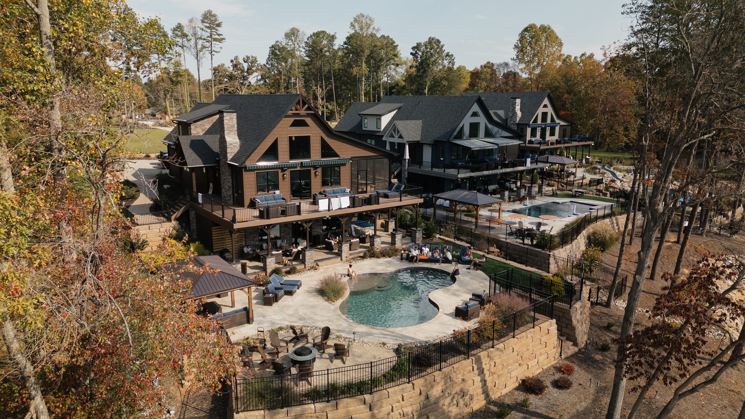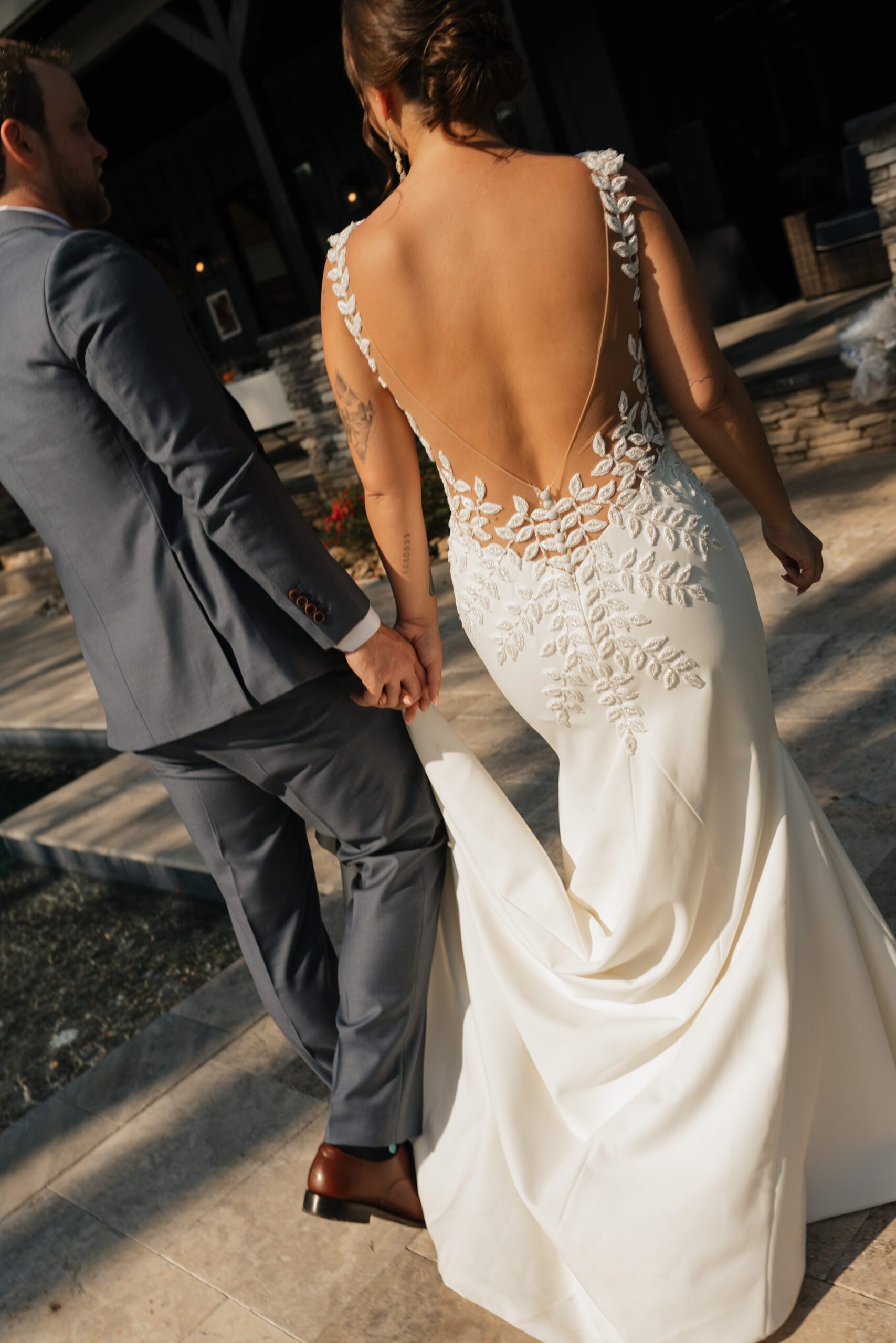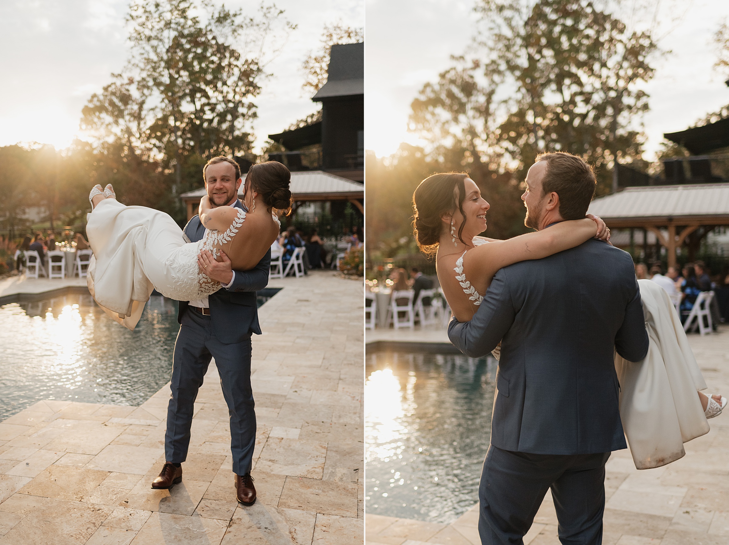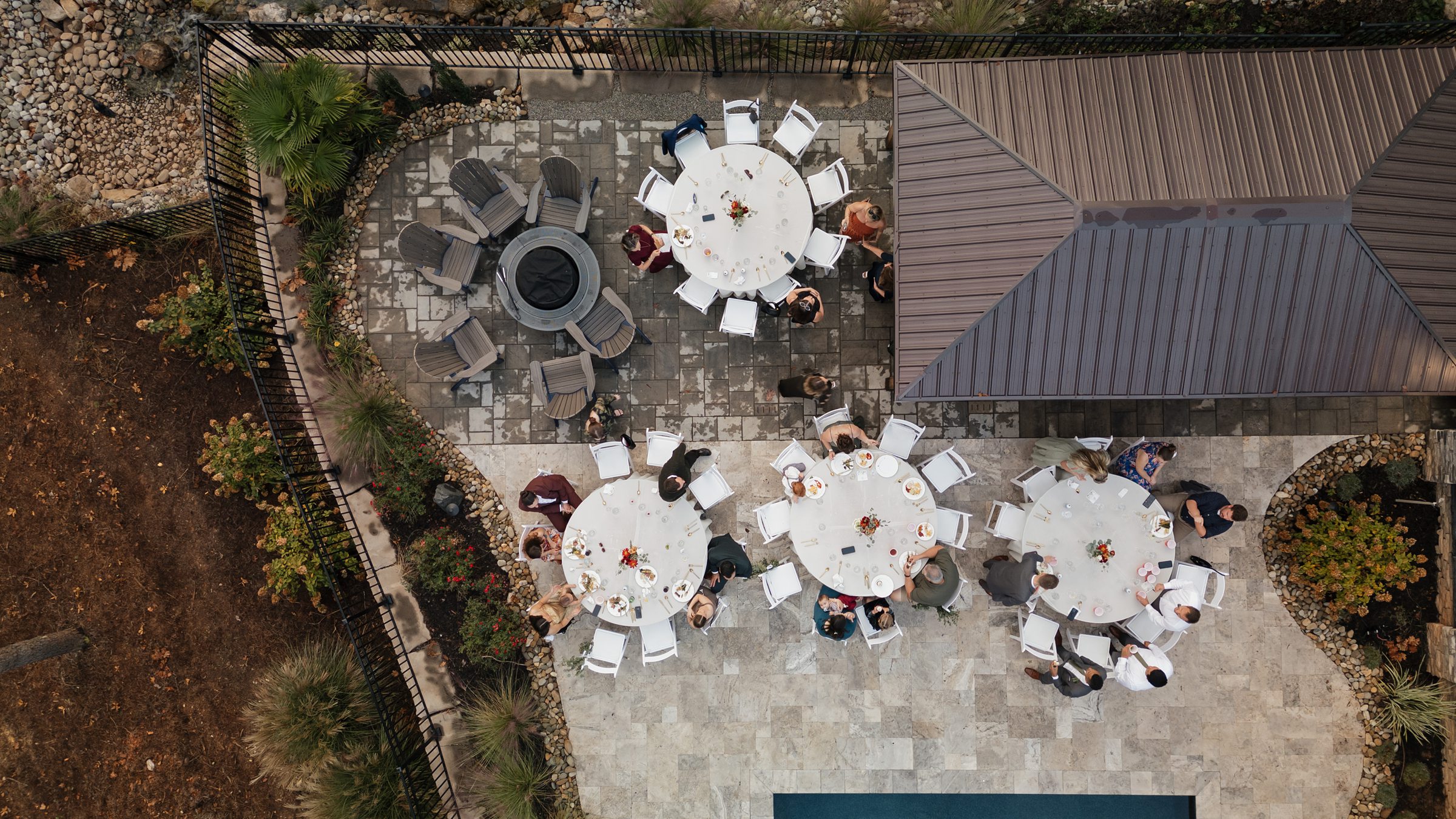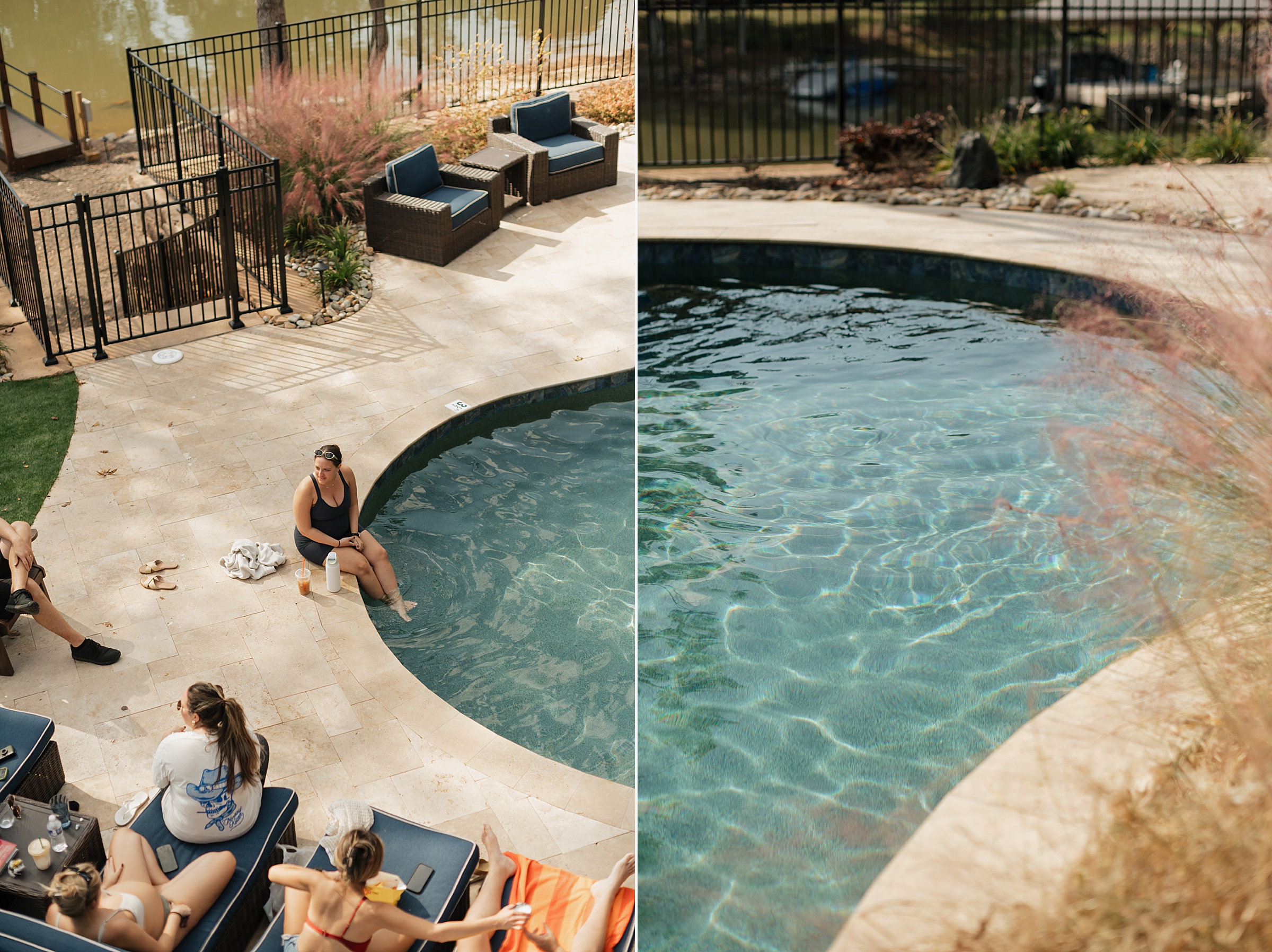 Dinner being served around one of the home’s pools created a relaxed, and elegant vibe under the evening sky. We were able to get some great drone shots of their first dance while the sun set over the lake, painting the water in golden light.