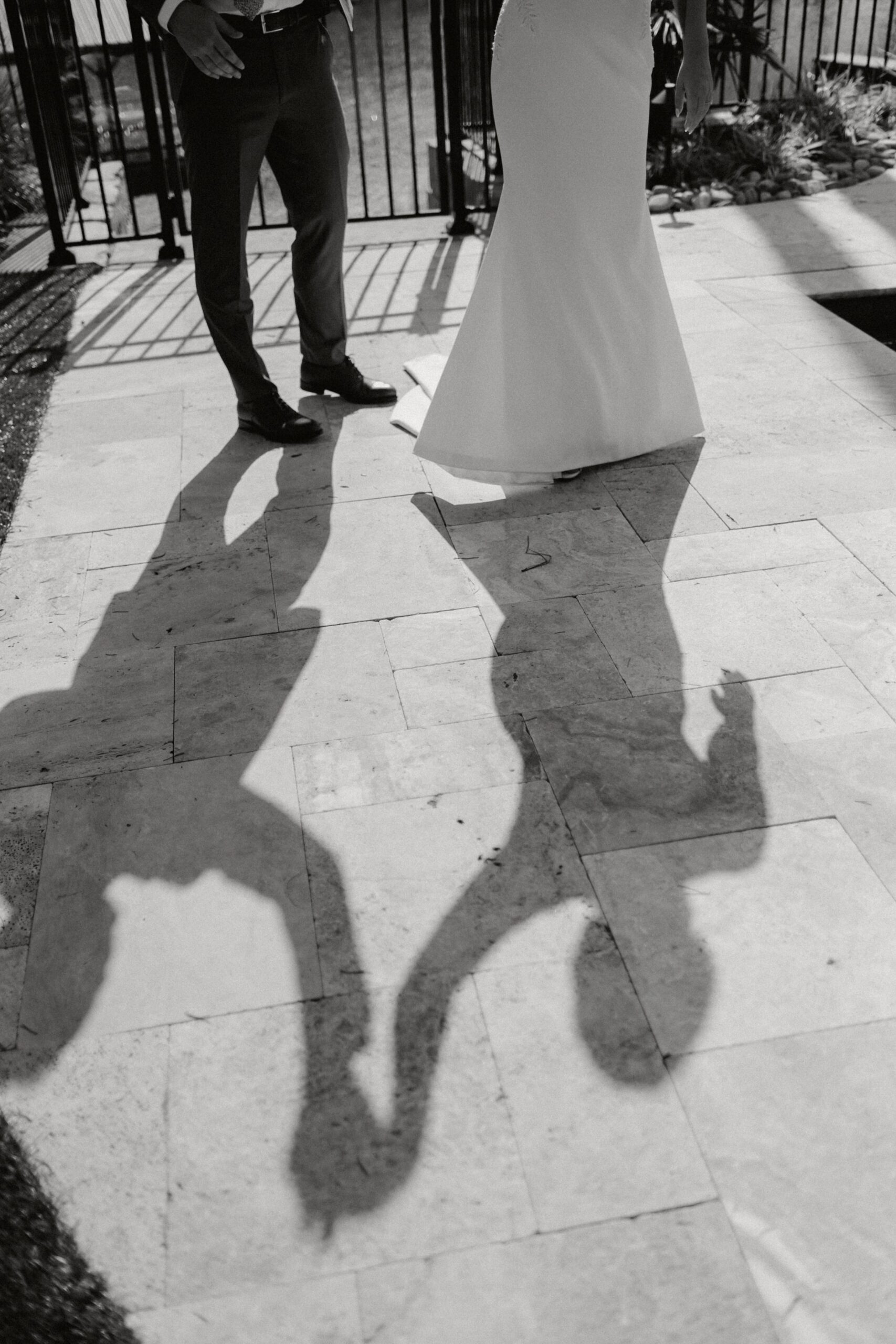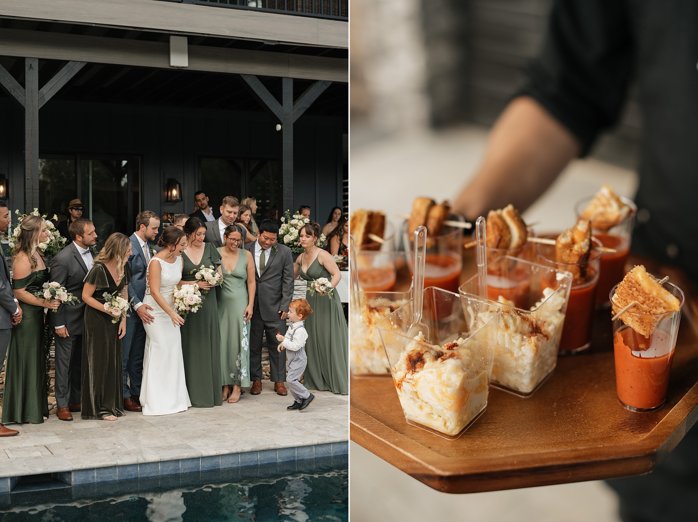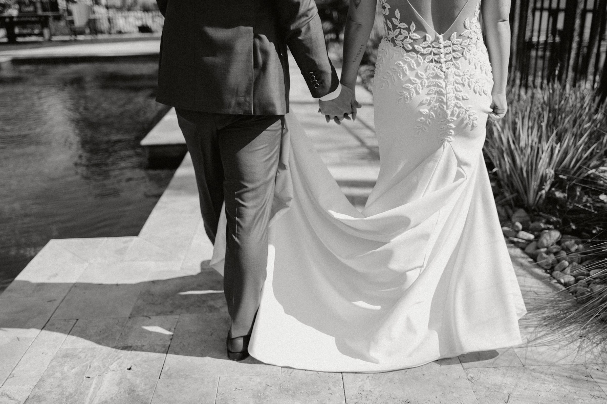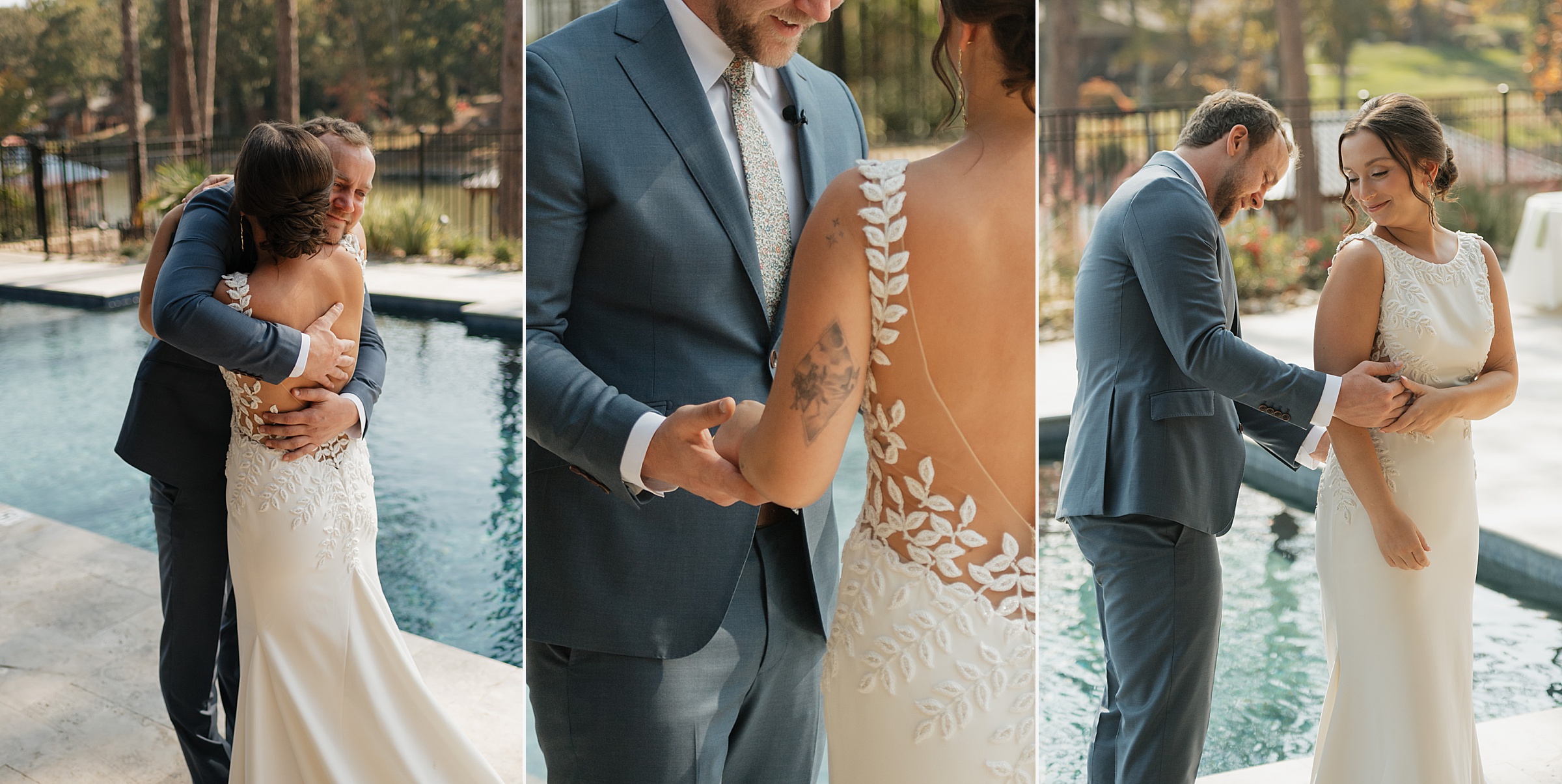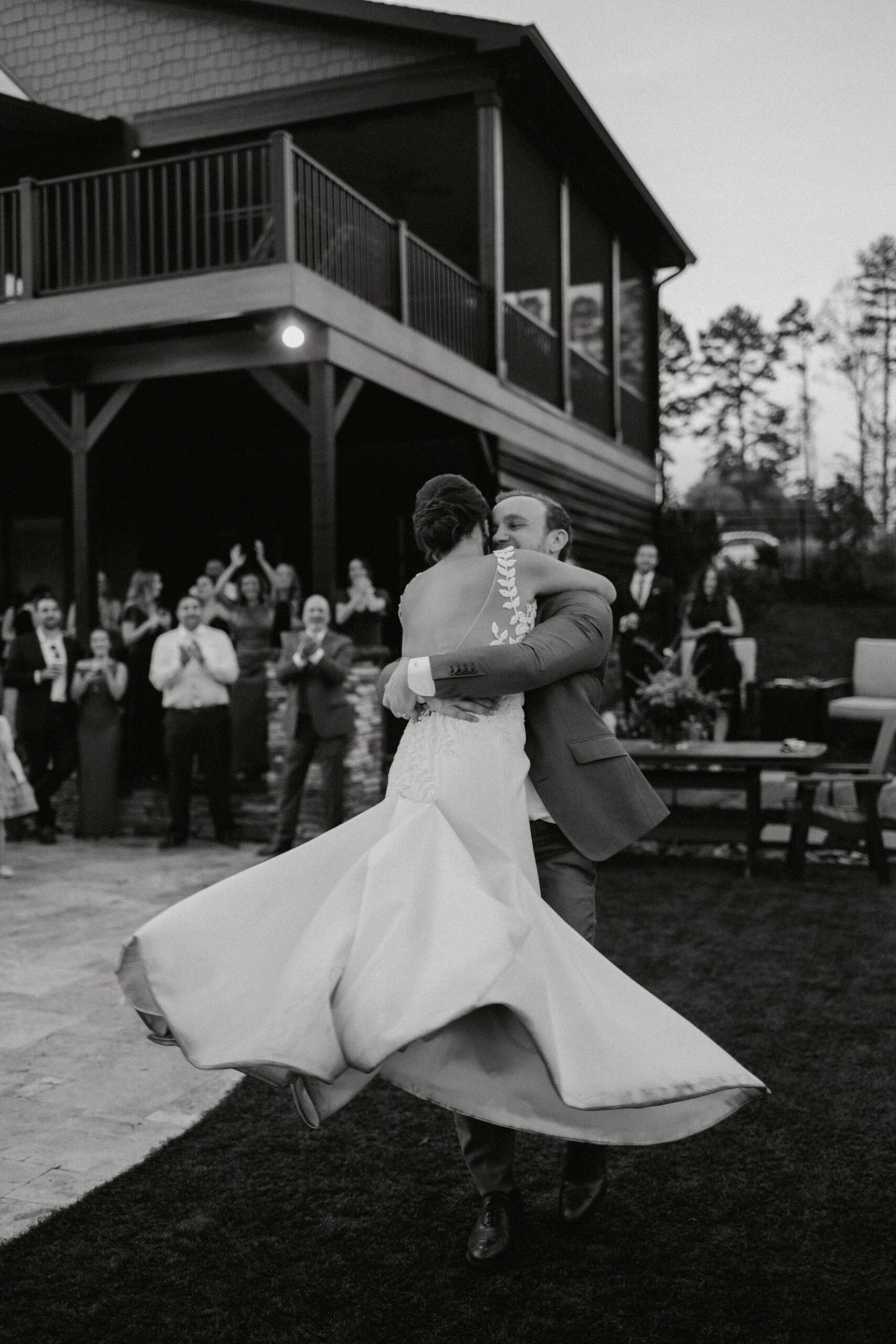 Dinner being served around one of the home’s pools created a relaxed, and elegant vibe under the evening sky. We were able to get some great drone shots of their first dance while the sun set over the lake, painting the water in golden light.