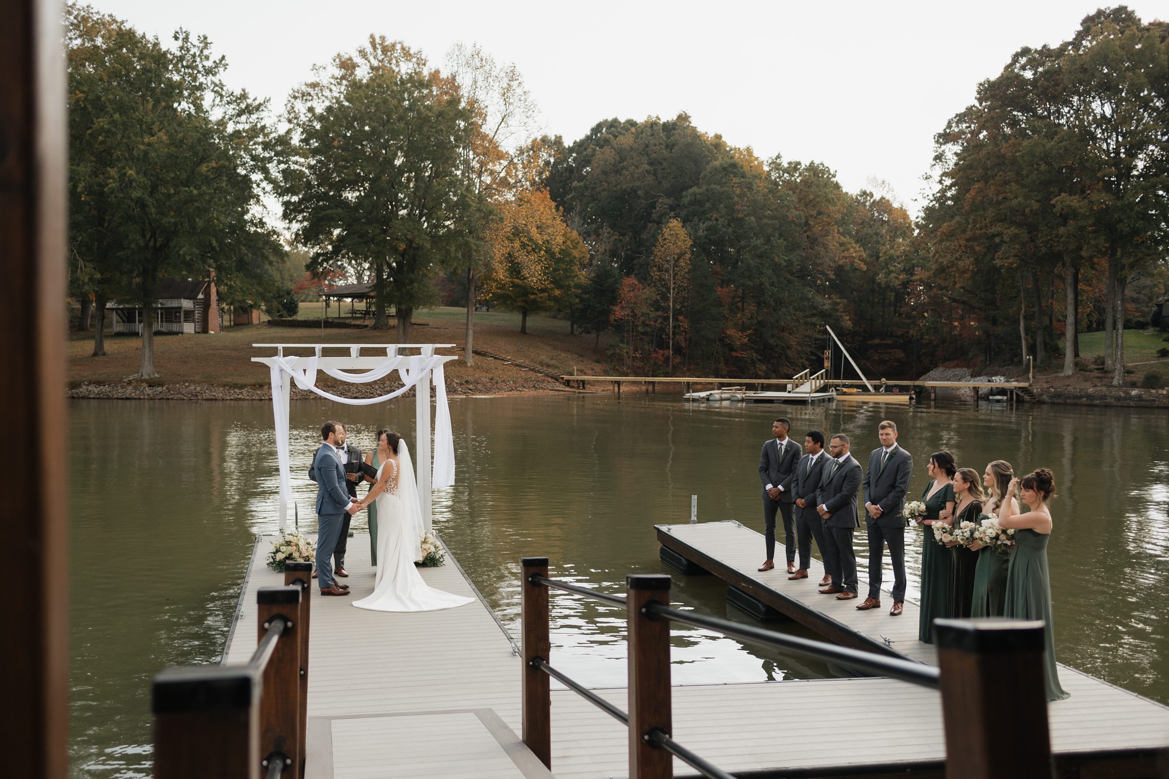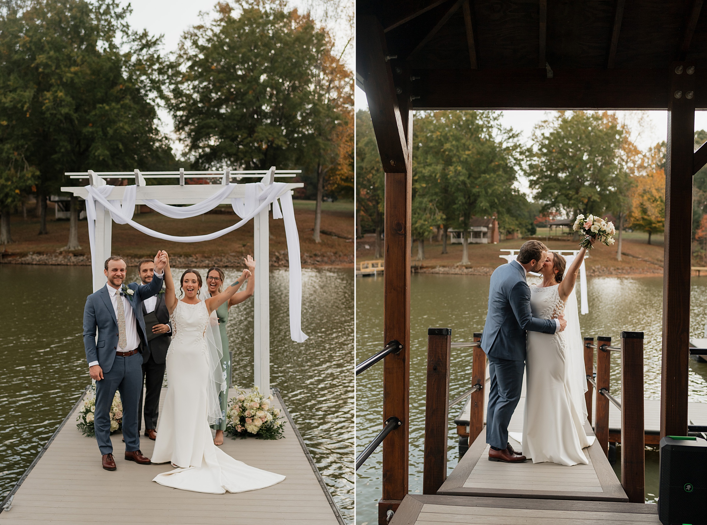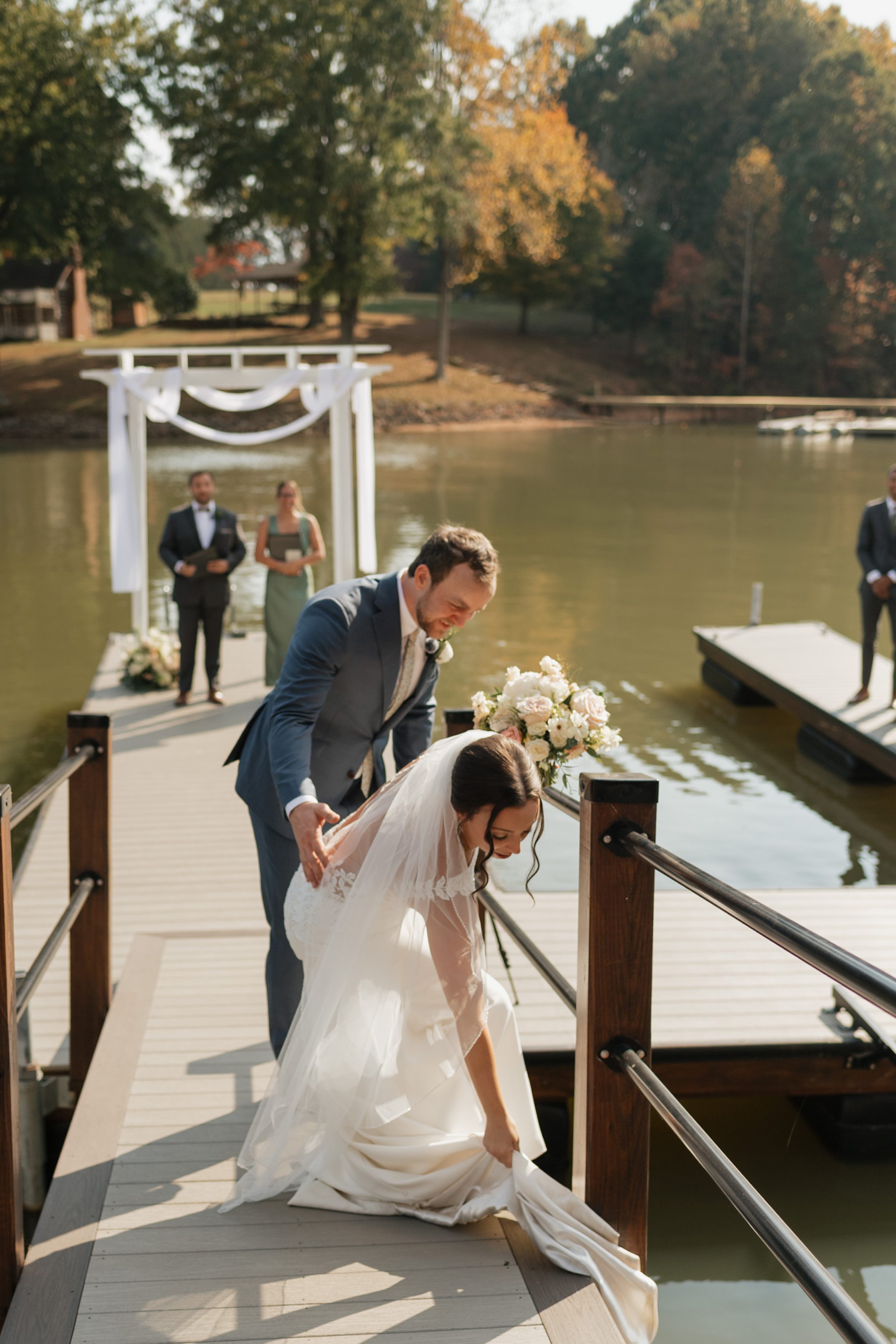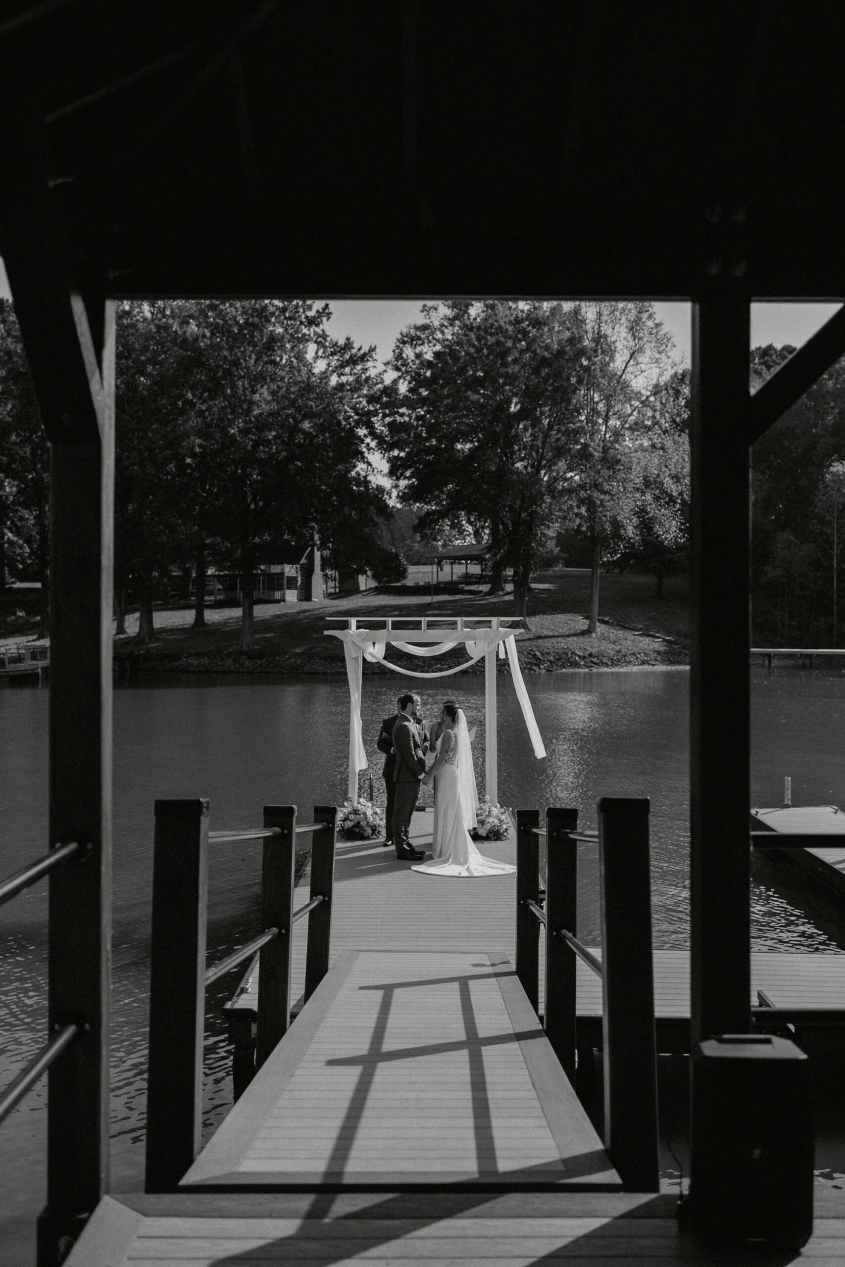 Their ceremony was truly one-of-a-kind. Jess and Ethan stood literally on top of Lake Norman itself—on a floating dock—while their guests watched from a covered dock about 20 feet away. Their wedding party stood on an adjacent dock, creating an intimate setting like no other. Their dear friends officiated the ceremony, filling it with meaningful moments, including a reading from The Fault in Our Stars, one of their favorite books.