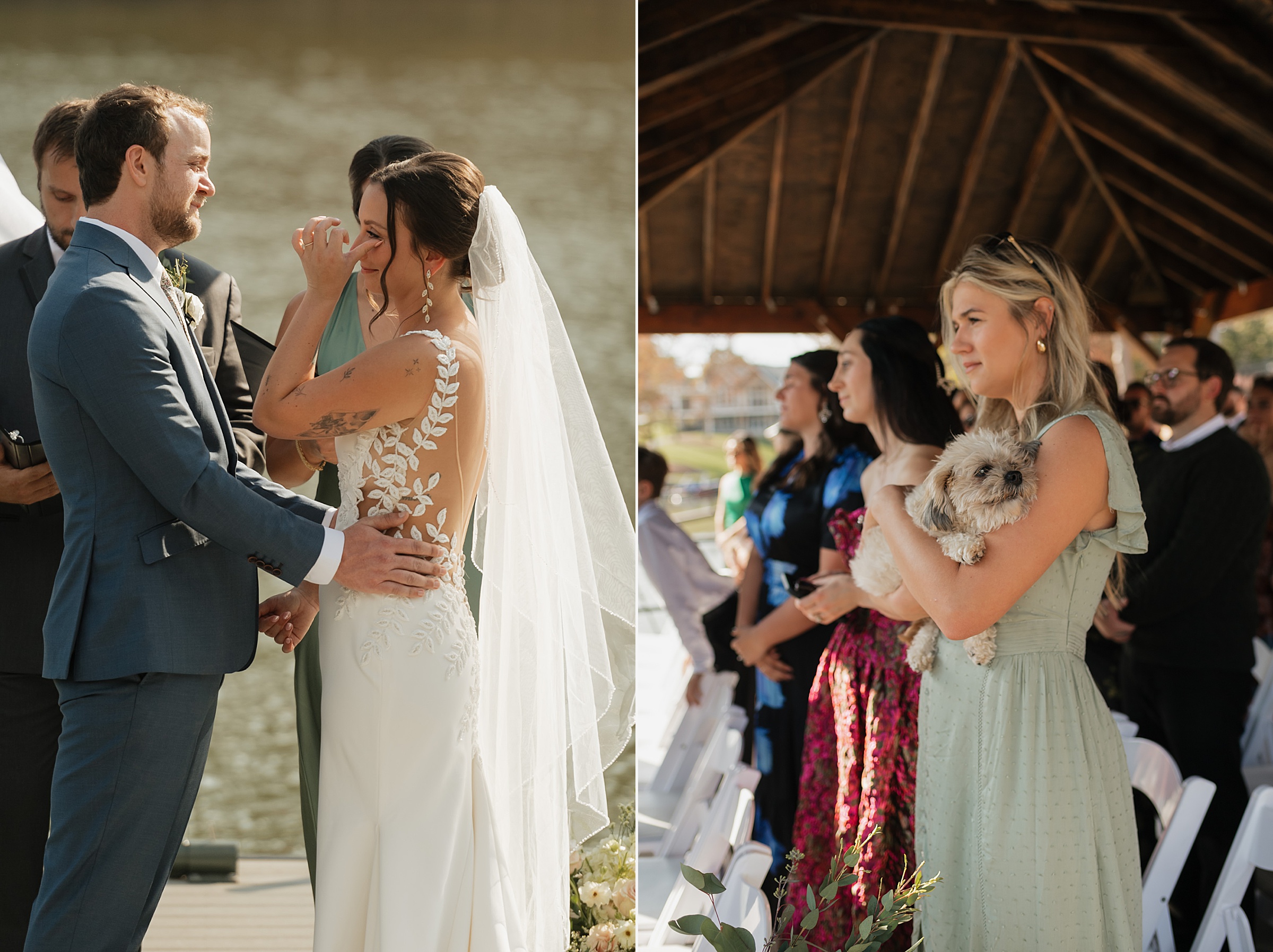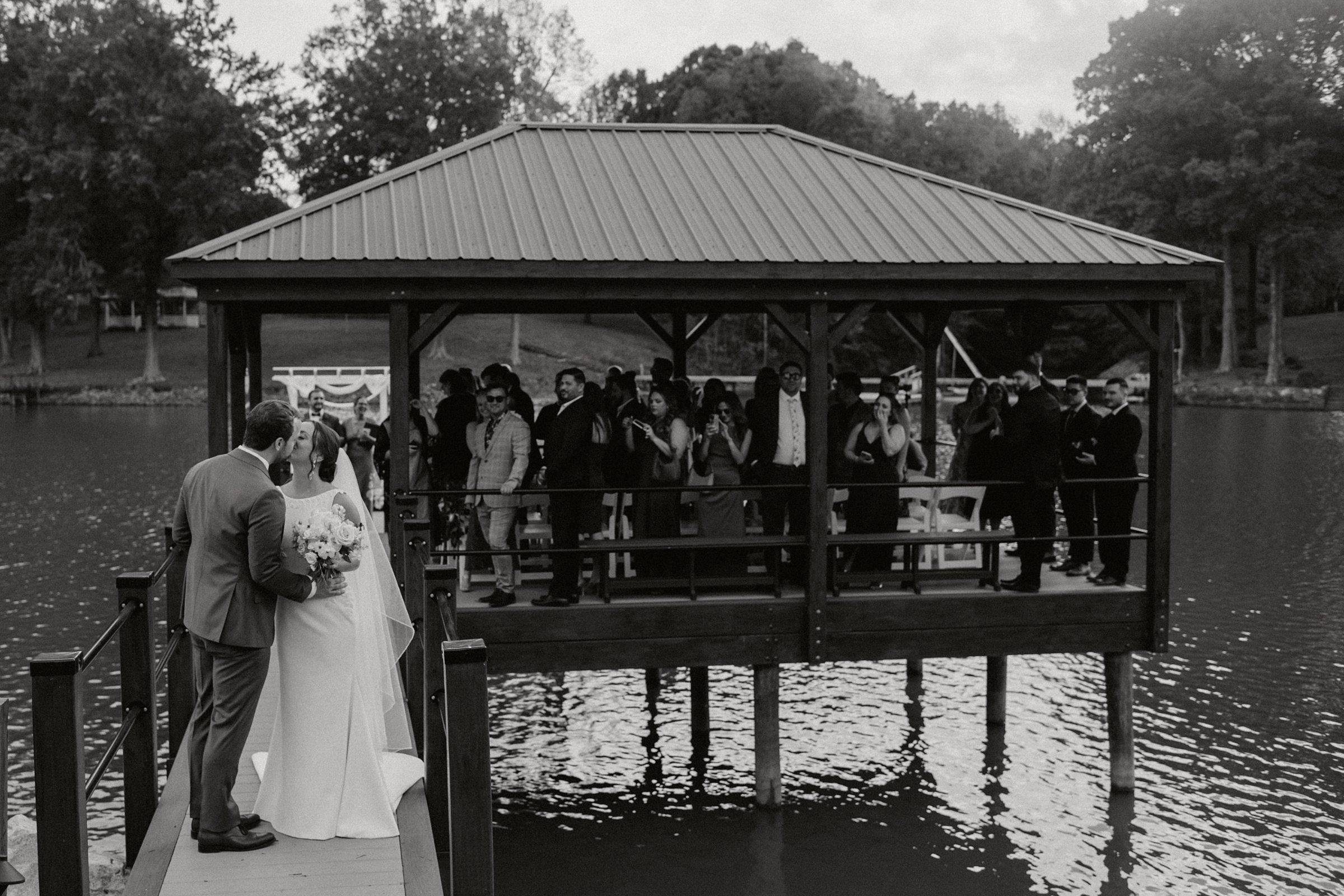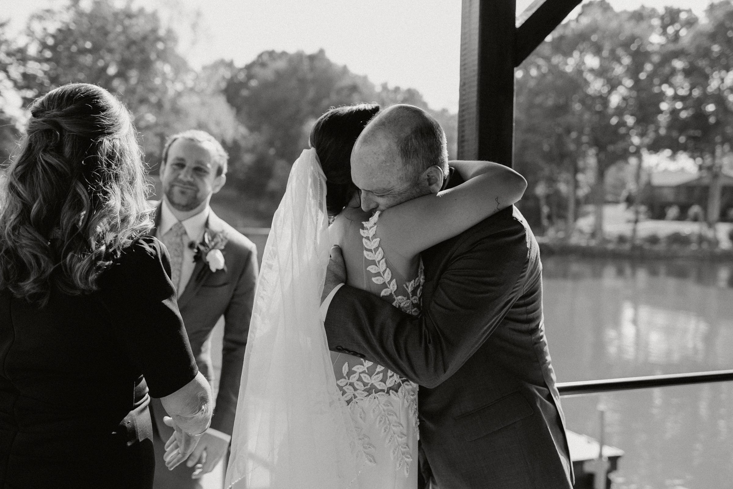 Their ceremony was truly one-of-a-kind. Jess and Ethan stood literally on top of Lake Norman itself—on a floating dock—while their guests watched from a covered dock about 20 feet away. Their wedding party stood on an adjacent dock, creating an intimate setting like no other. Their dear friends officiated the ceremony, filling it with meaningful moments, including a reading from The Fault in Our Stars, one of their favorite books.