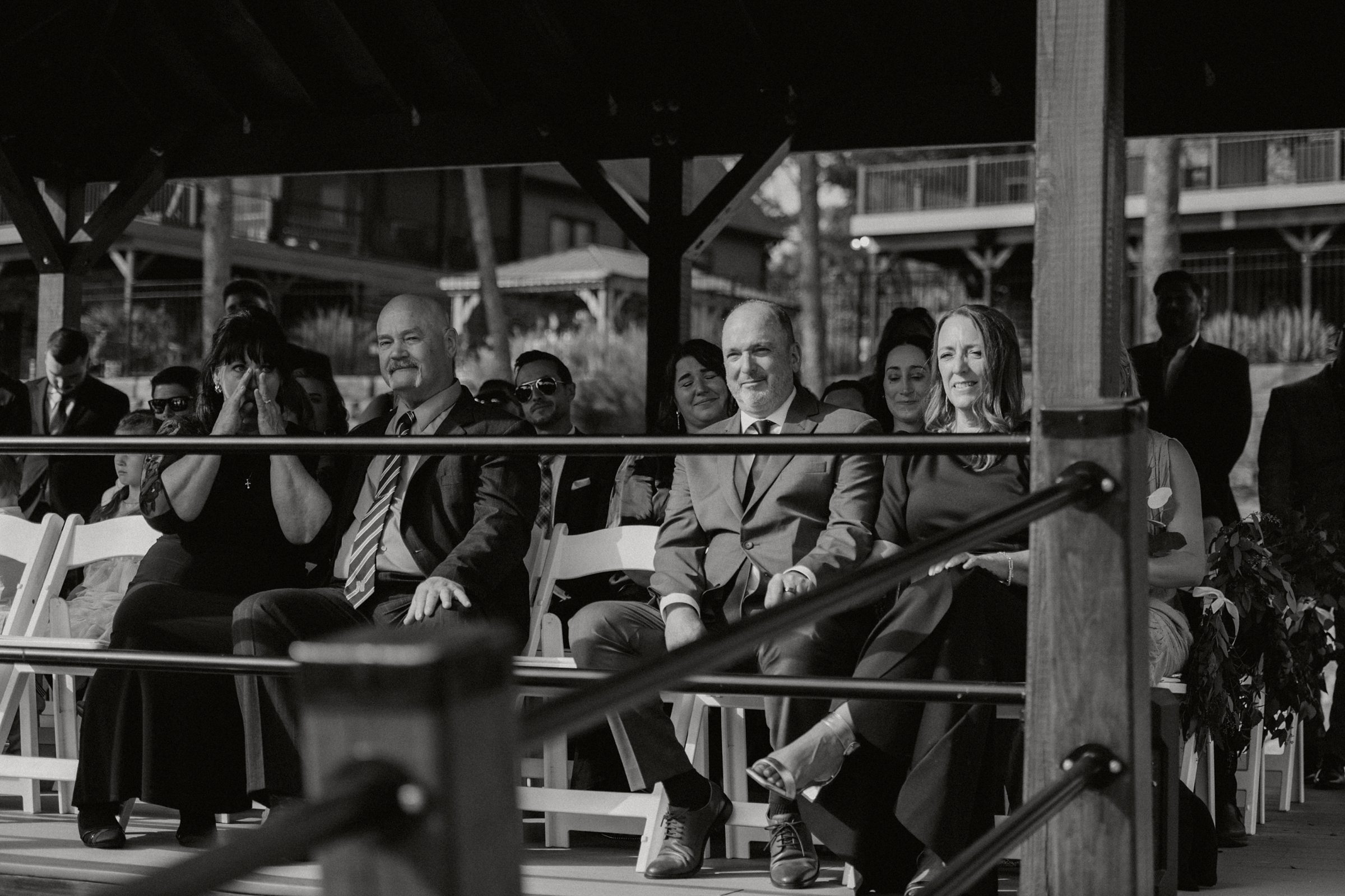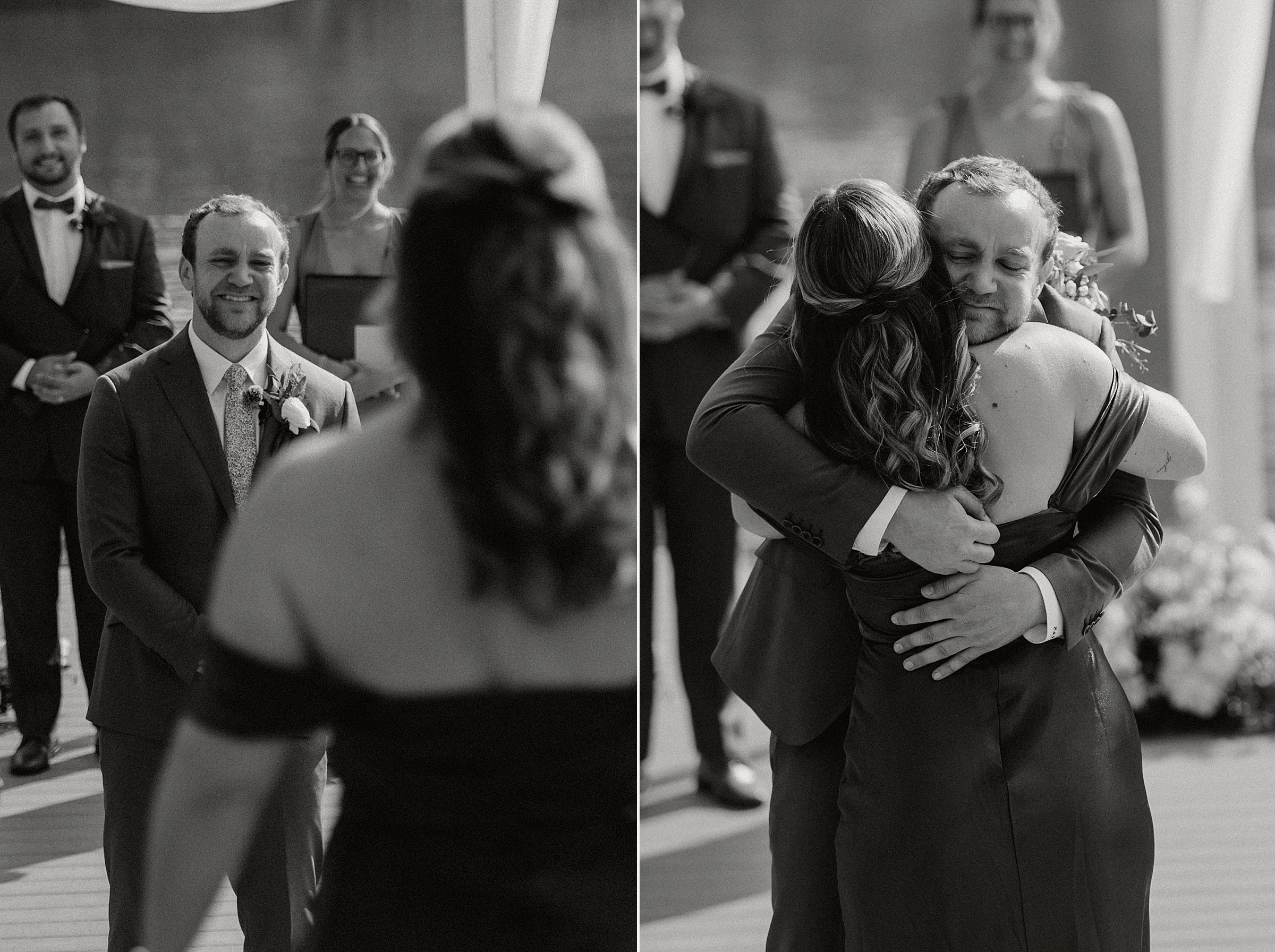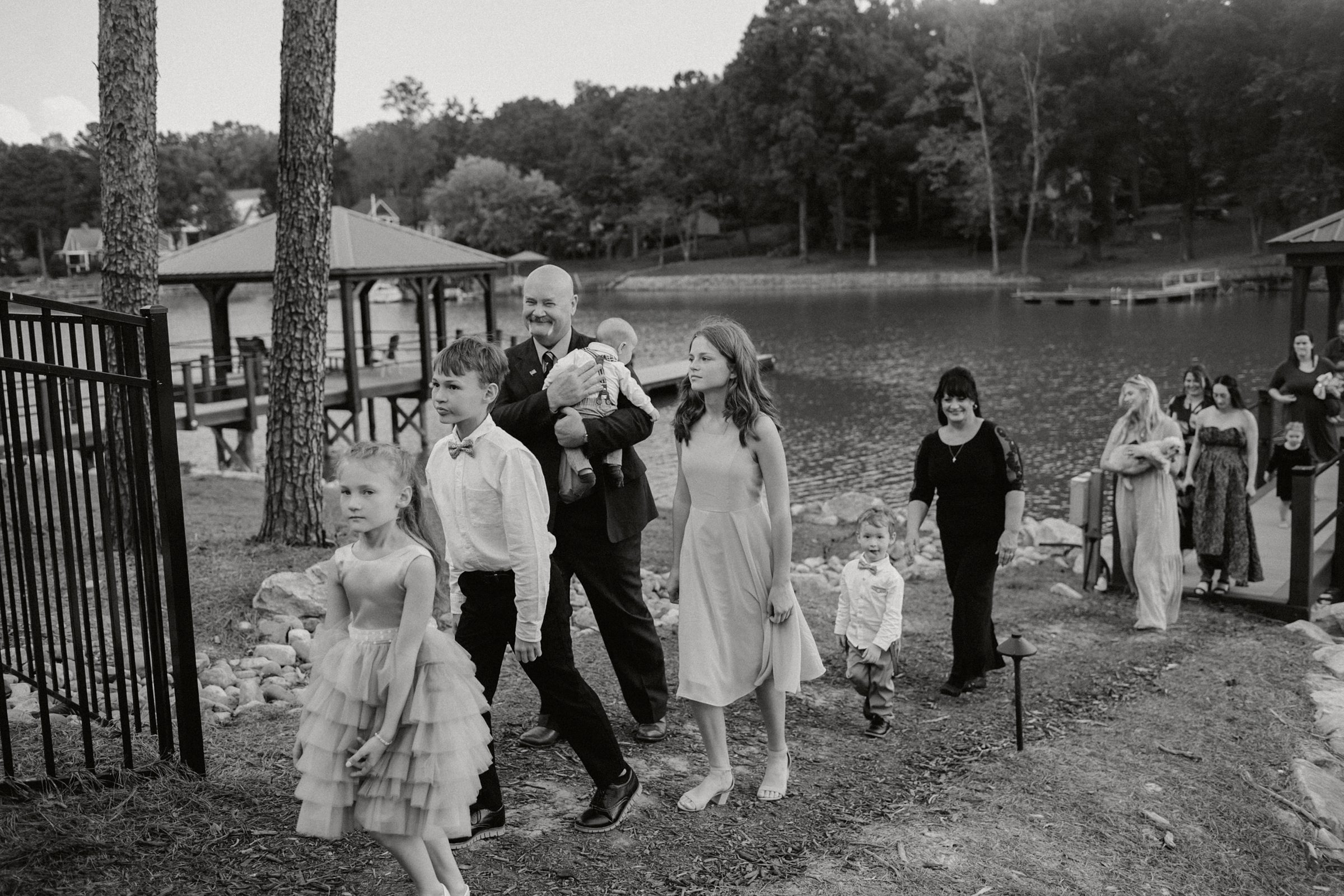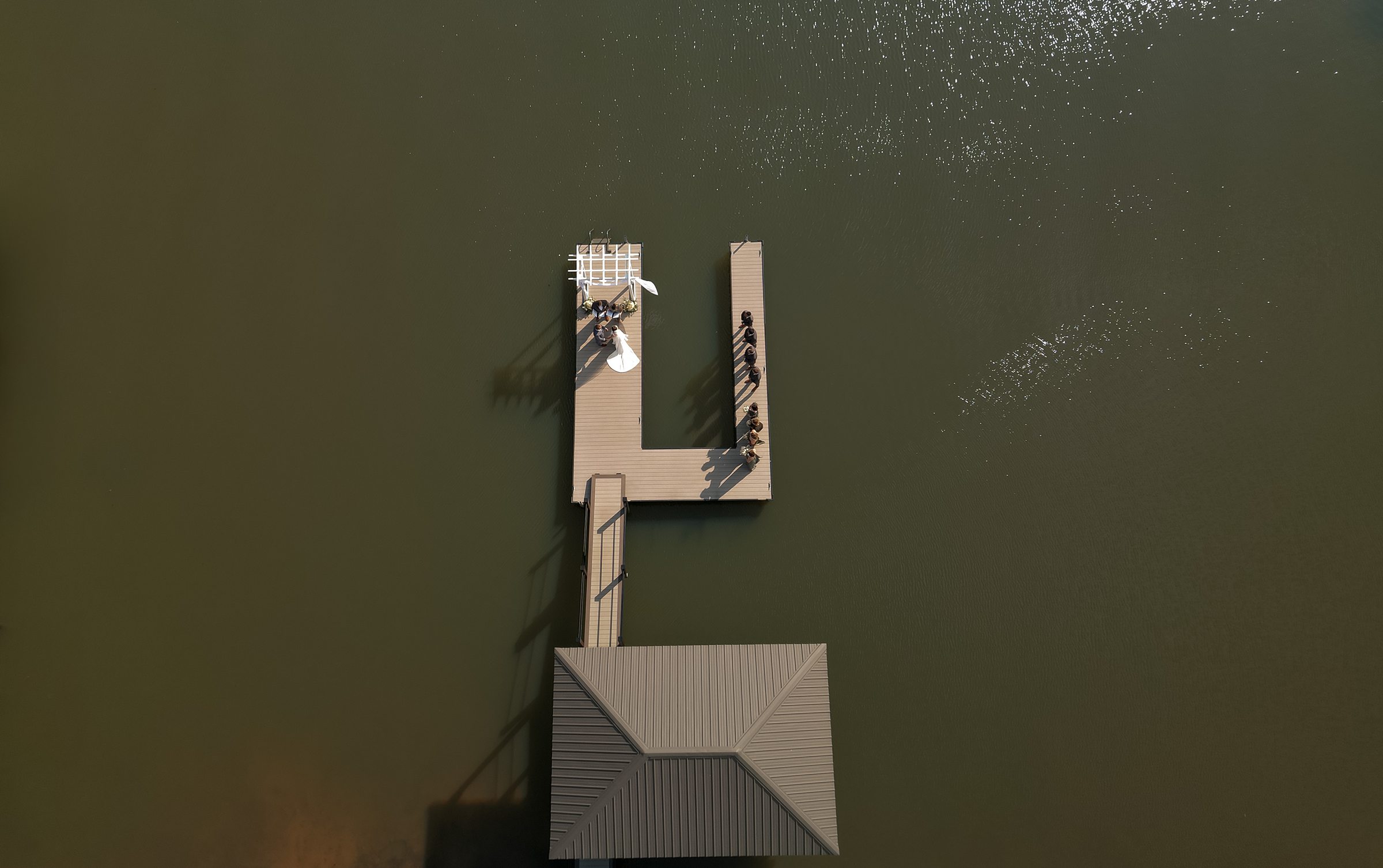 Their ceremony was truly one-of-a-kind. Jess and Ethan stood literally on top of Lake Norman itself—on a floating dock—while their guests watched from a covered dock about 20 feet away. Their wedding party stood on an adjacent dock, creating an intimate setting like no other. Their dear friends officiated the ceremony, filling it with meaningful moments, including a reading from The Fault in Our Stars, one of their favorite books.
