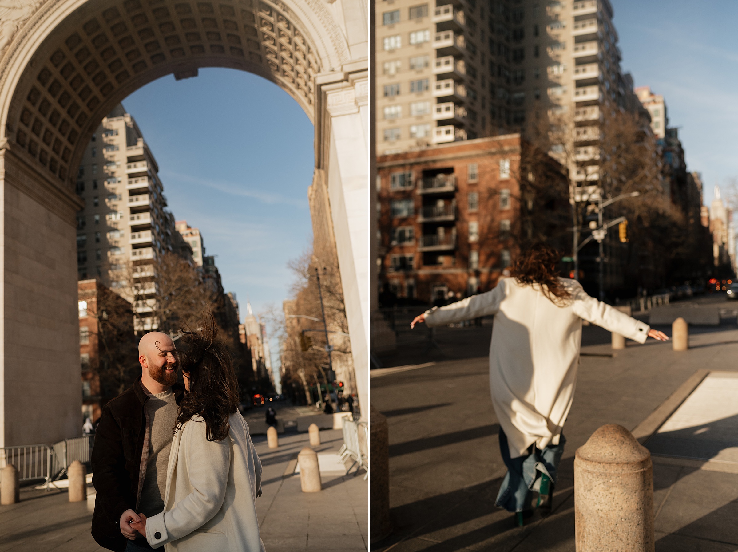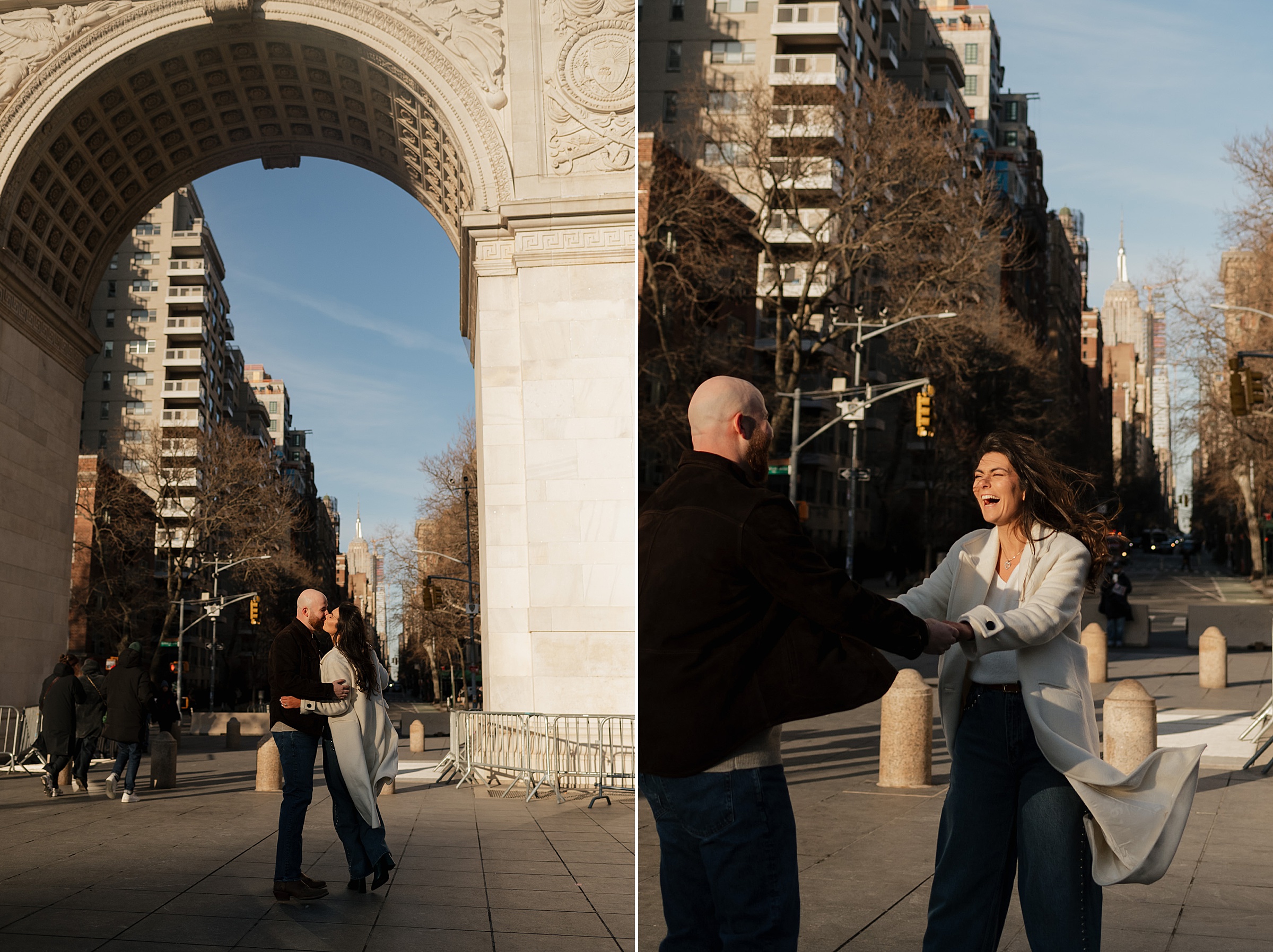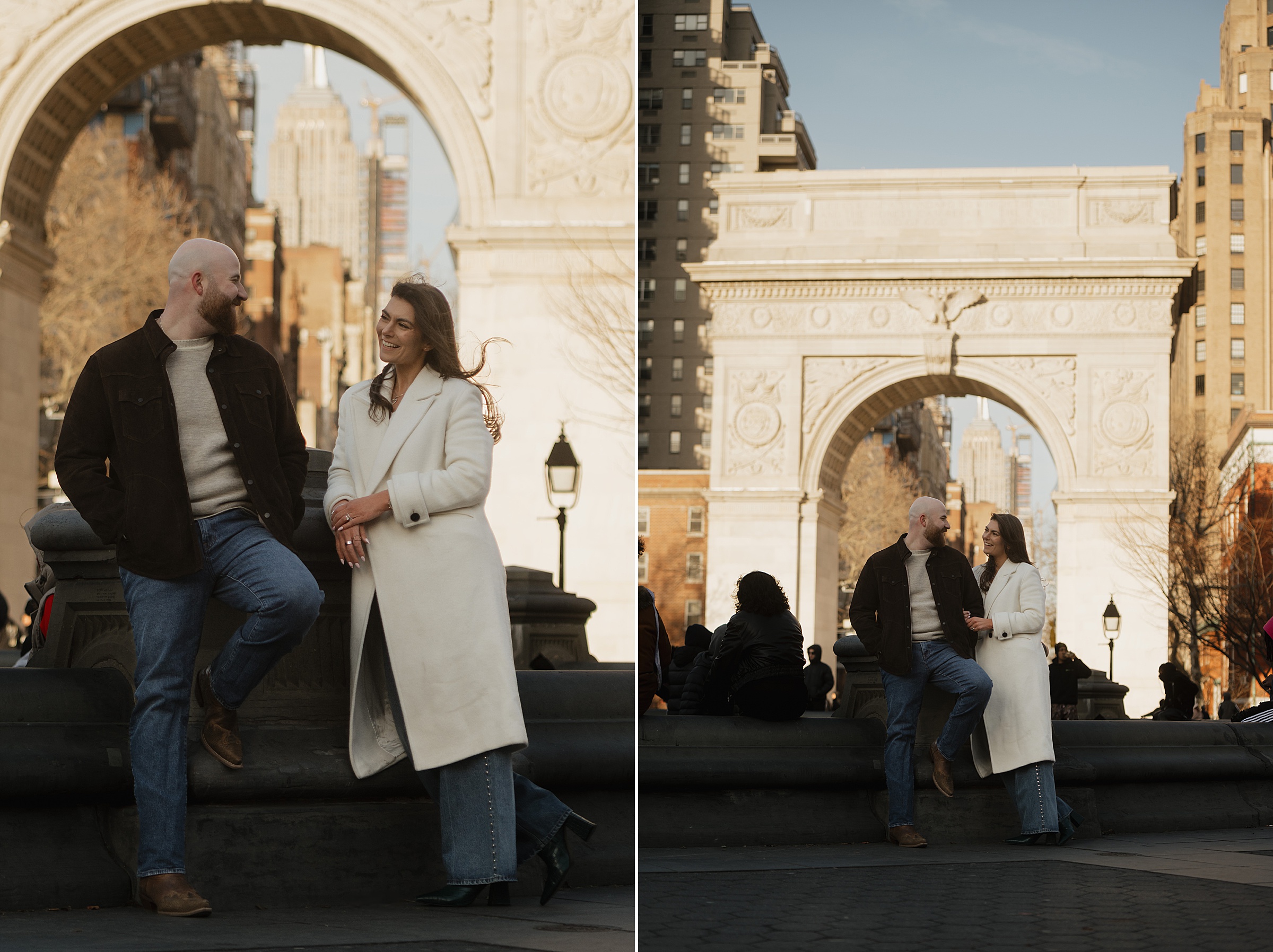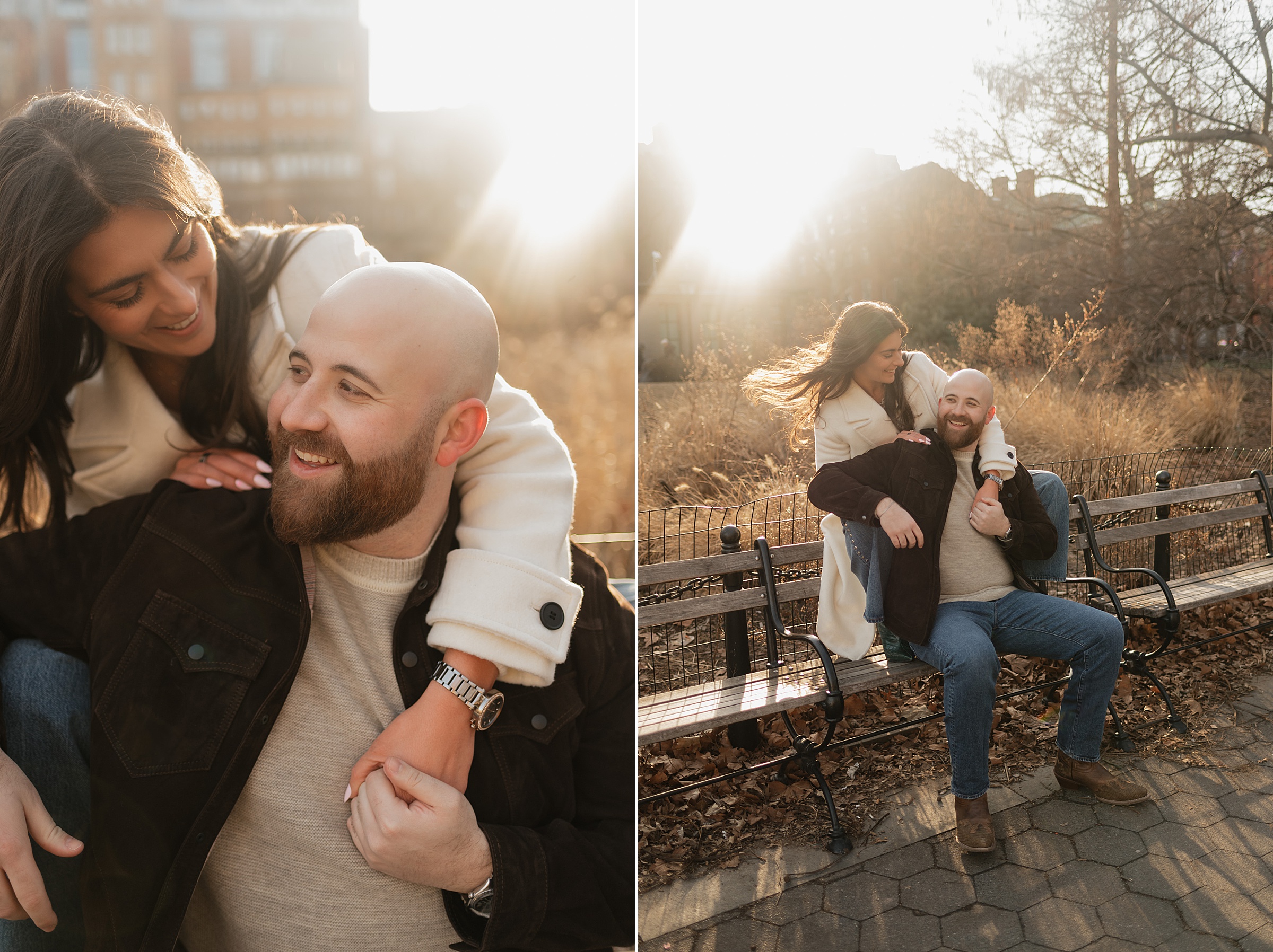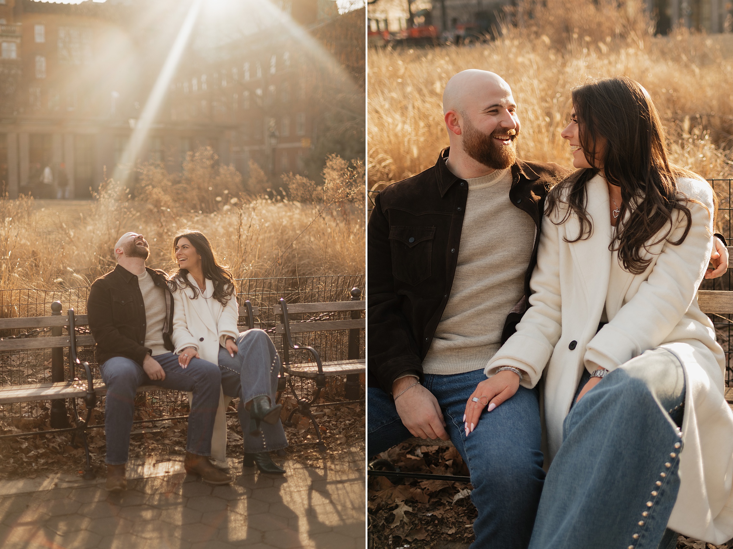 We continued our stroll through the winding streets until the unmistakable arch of Washington Square Park came into view. The park was alive with its usual charm, musicians playing, couples strolling, and the hum of New York energy all around. We found a quiet bench in the sunlight, the rays falling perfectly behind Molly and JB as they laughed and leaned into one another. These moments are our favorites, when couples forget about the camera and simply enjoy being together. It’s in those small, unposed exchanges that the best photos come to life.