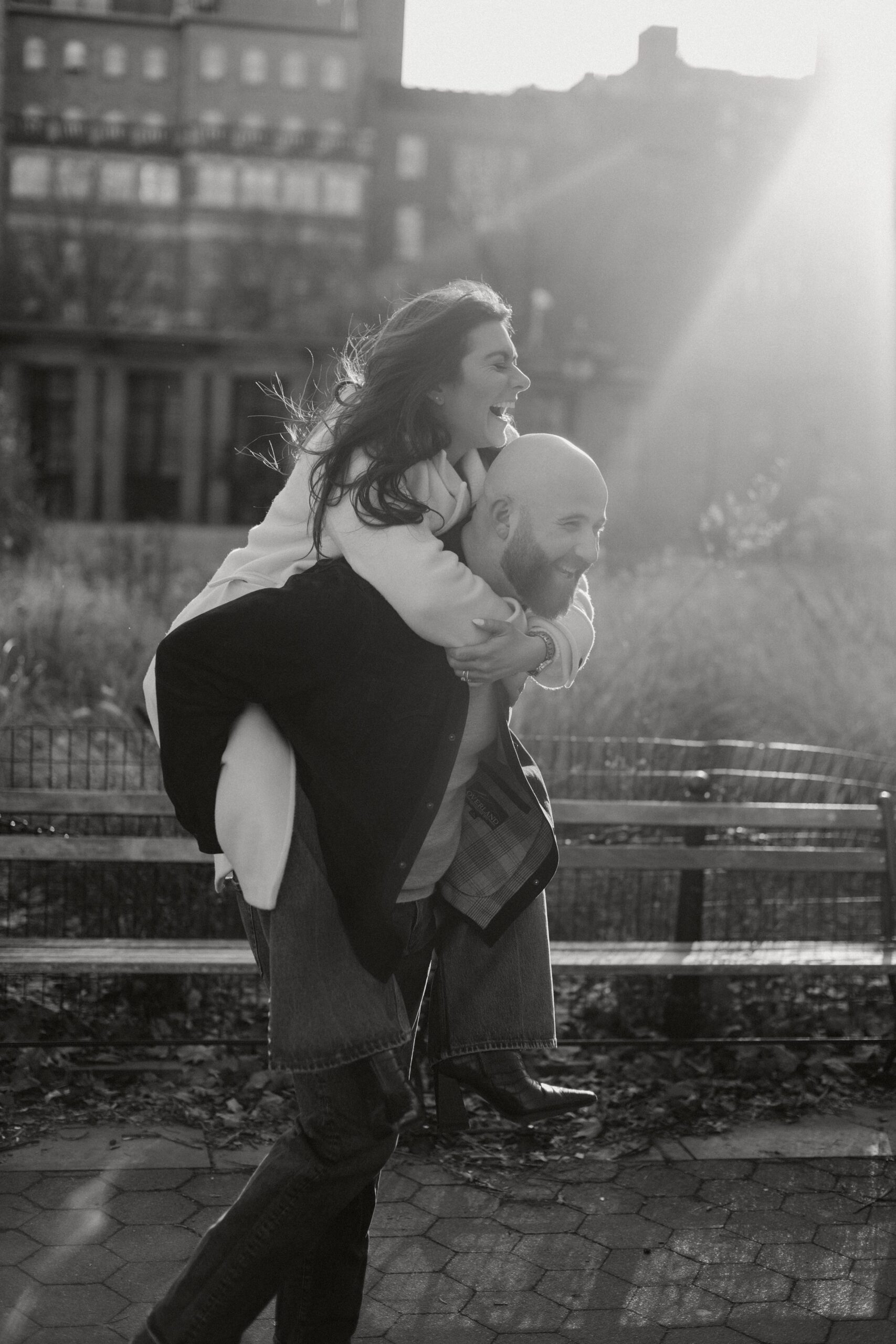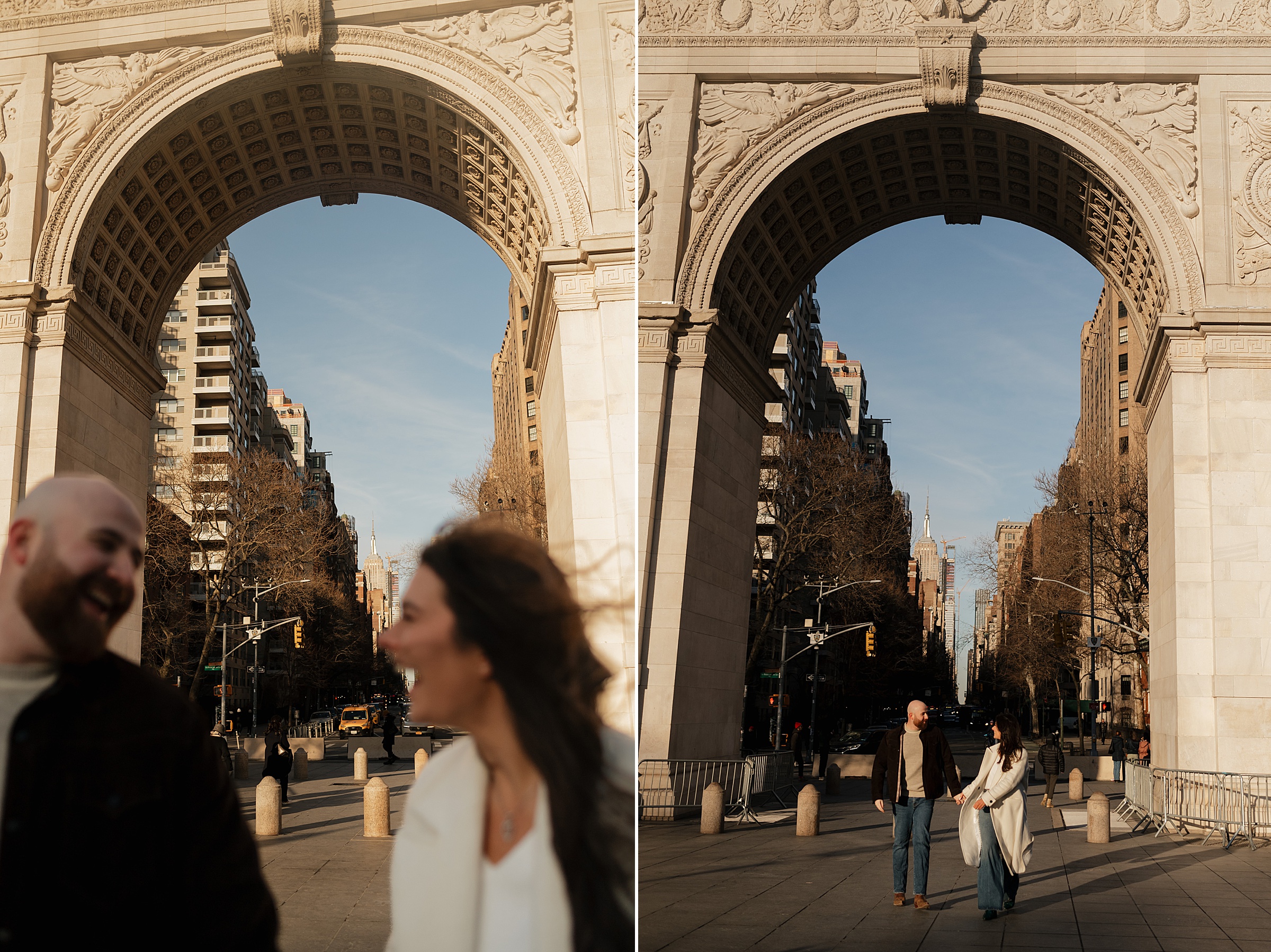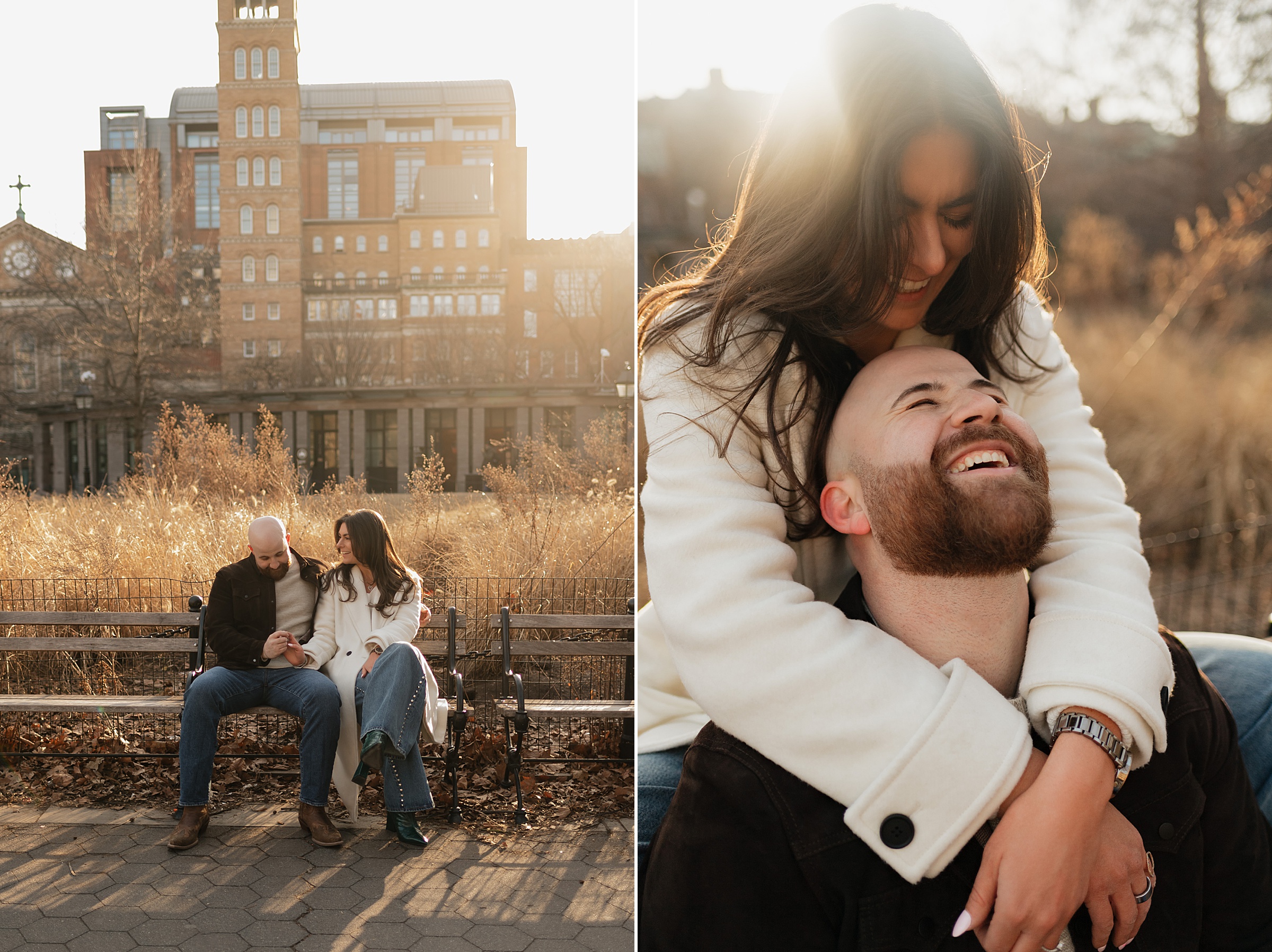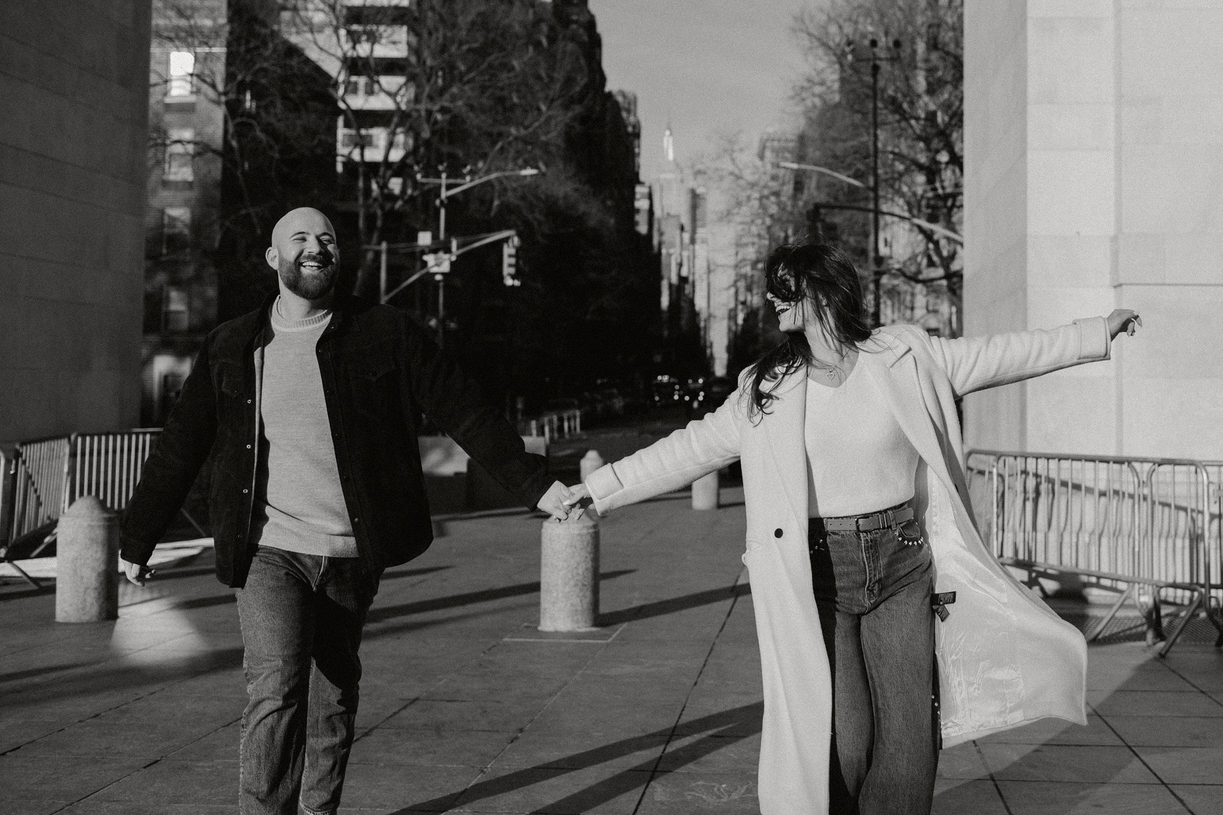 We continued our stroll through the winding streets until the unmistakable arch of Washington Square Park came into view. The park was alive with its usual charm, musicians playing, couples strolling, and the hum of New York energy all around. We found a quiet bench in the sunlight, the rays falling perfectly behind Molly and JB as they laughed and leaned into one another. These moments are our favorites, when couples forget about the camera and simply enjoy being together. It’s in those small, unposed exchanges that the best photos come to life.