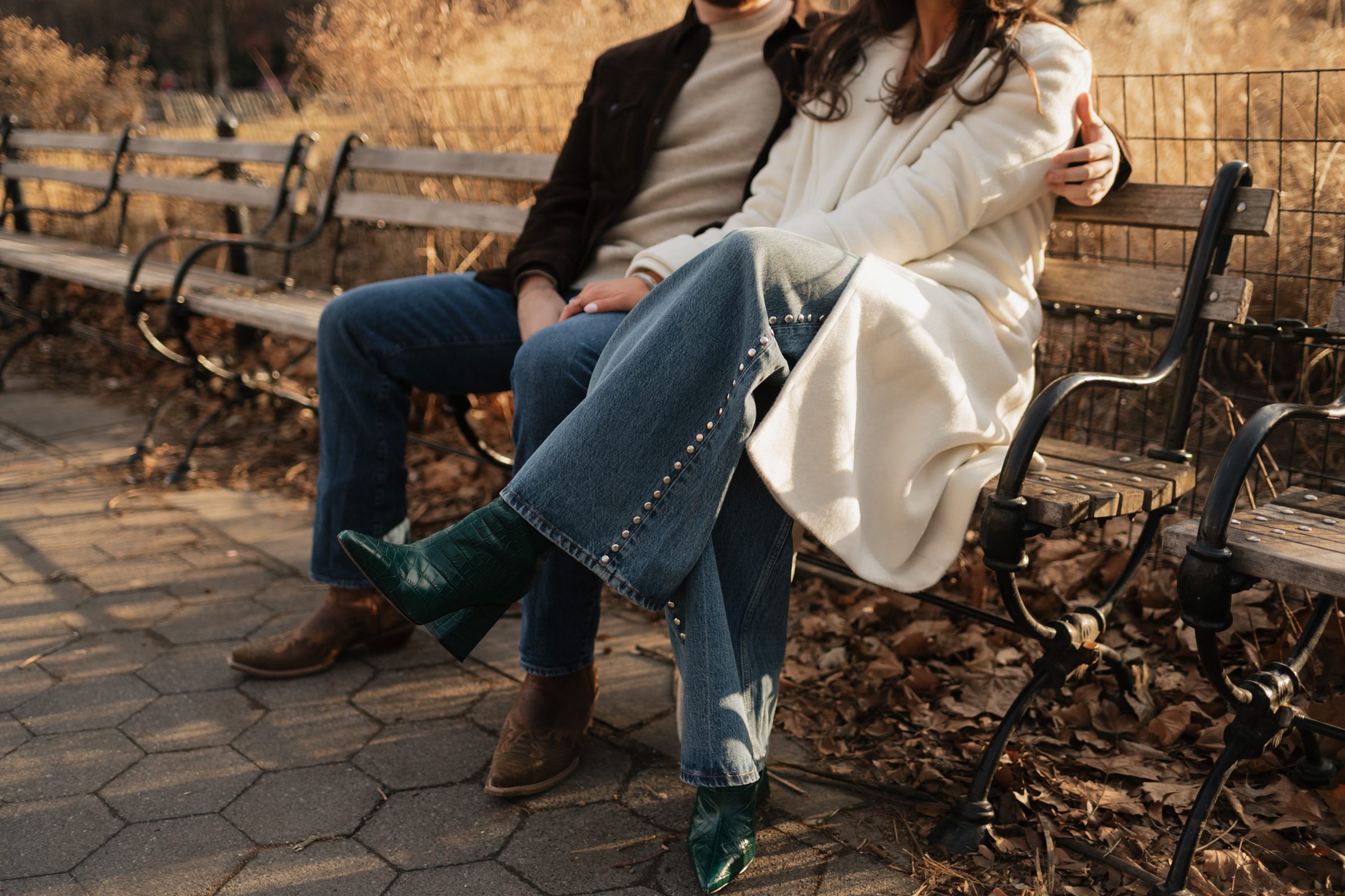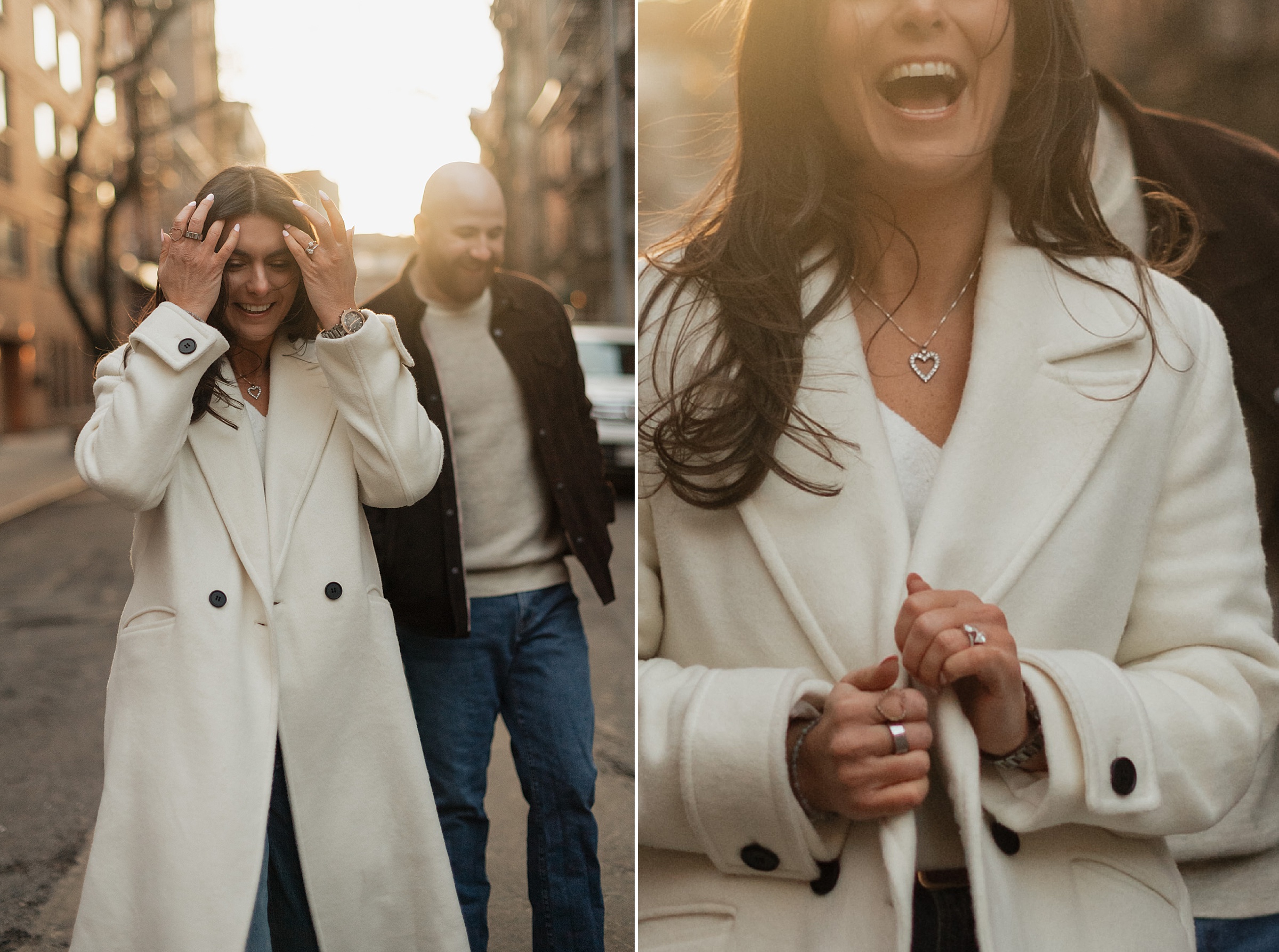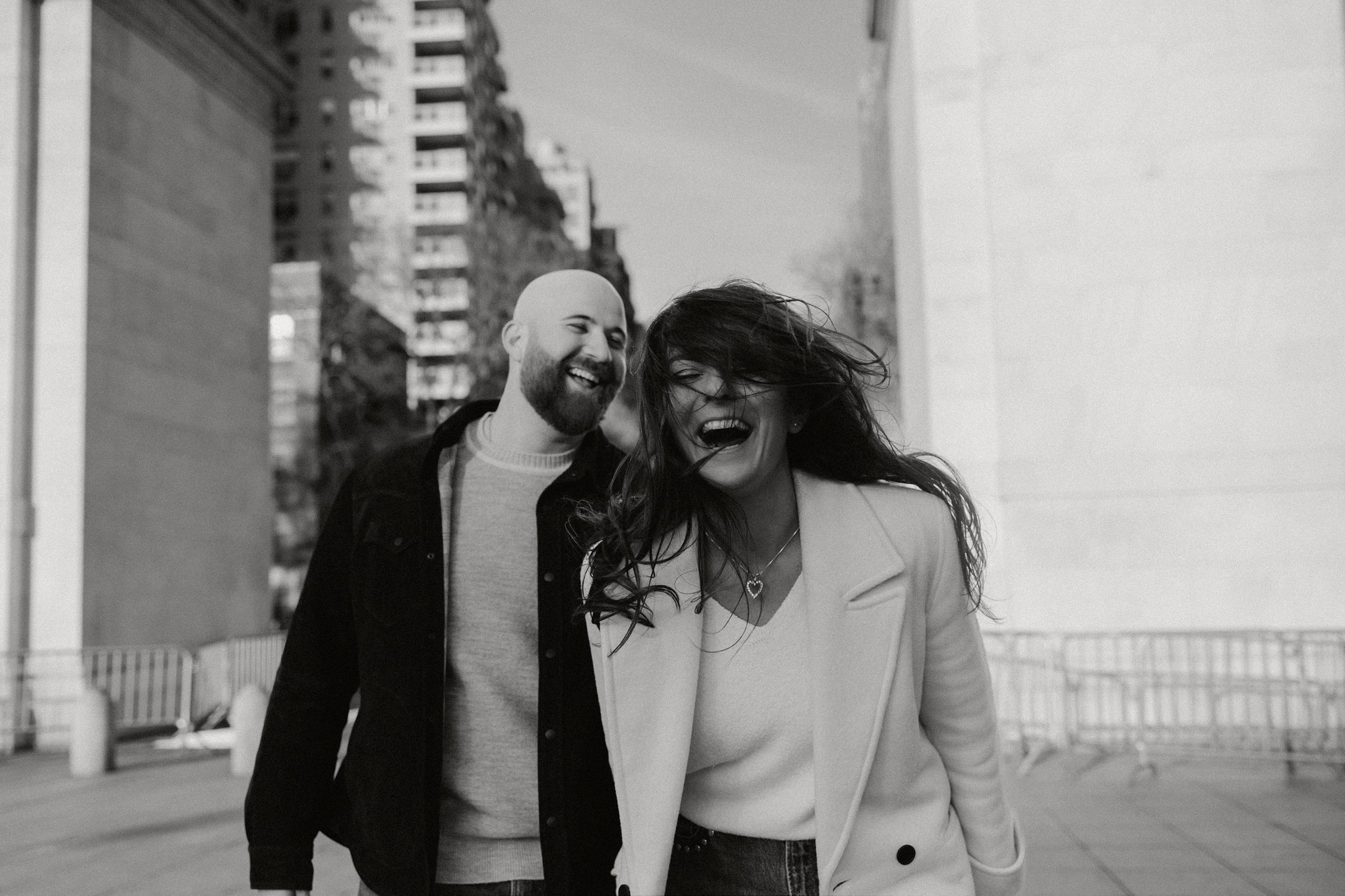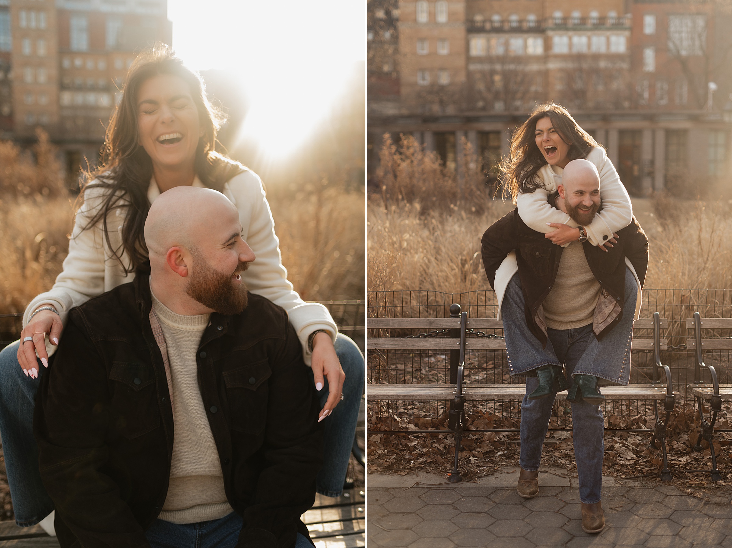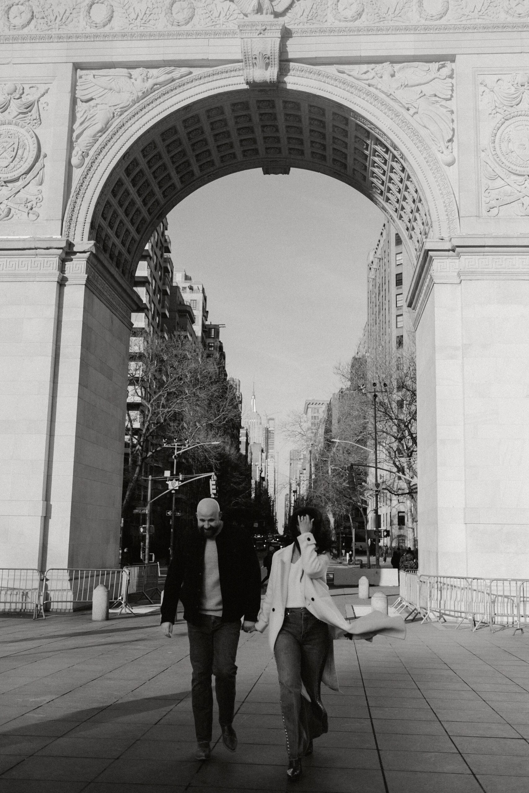 We continued our stroll through the winding streets until the unmistakable arch of Washington Square Park came into view. The park was alive with its usual charm, musicians playing, couples strolling, and the hum of New York energy all around. We found a quiet bench in the sunlight, the rays falling perfectly behind Molly and JB as they laughed and leaned into one another. These moments are our favorites, when couples forget about the camera and simply enjoy being together. It’s in those small, unposed exchanges that the best photos come to life.