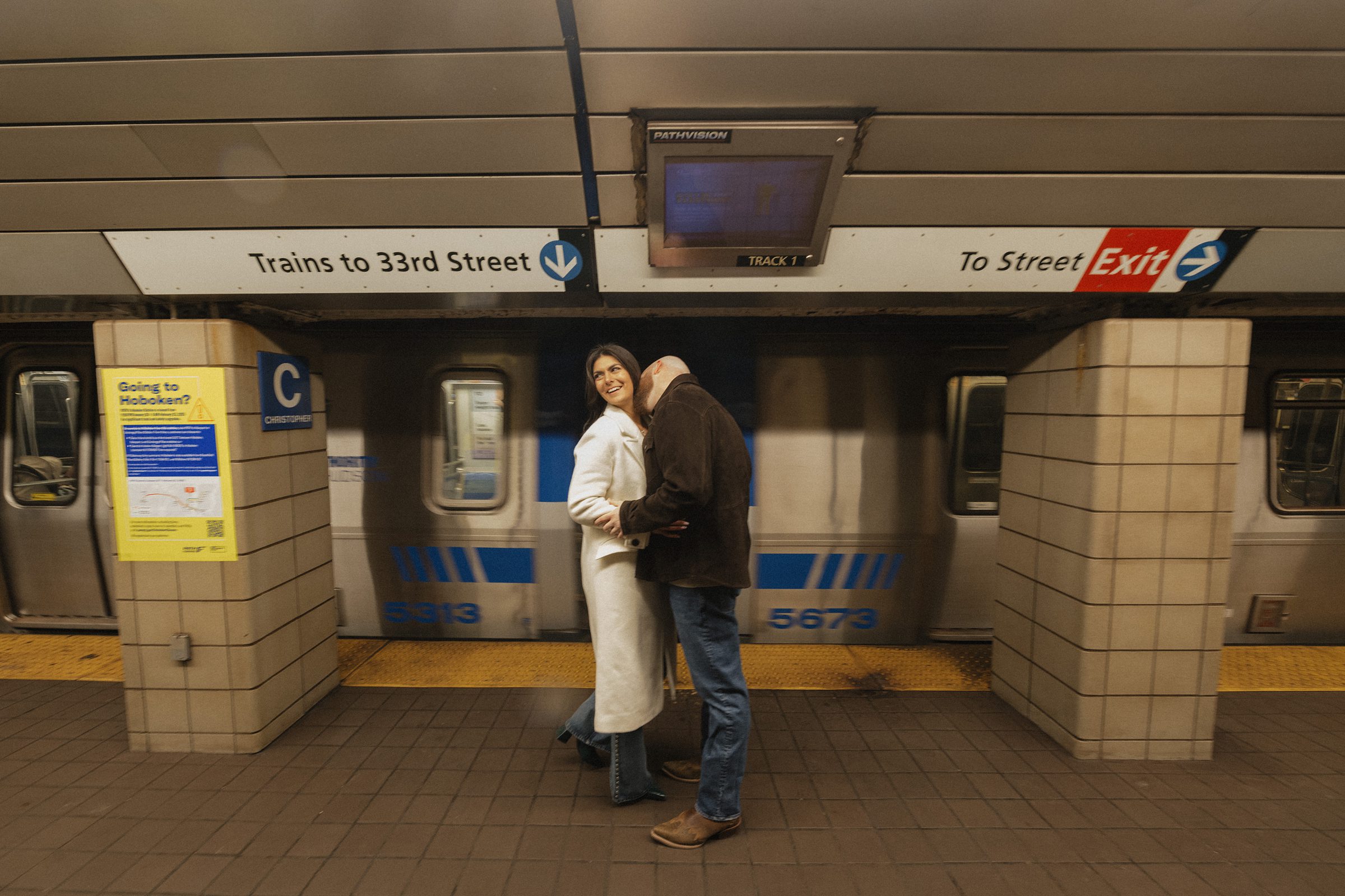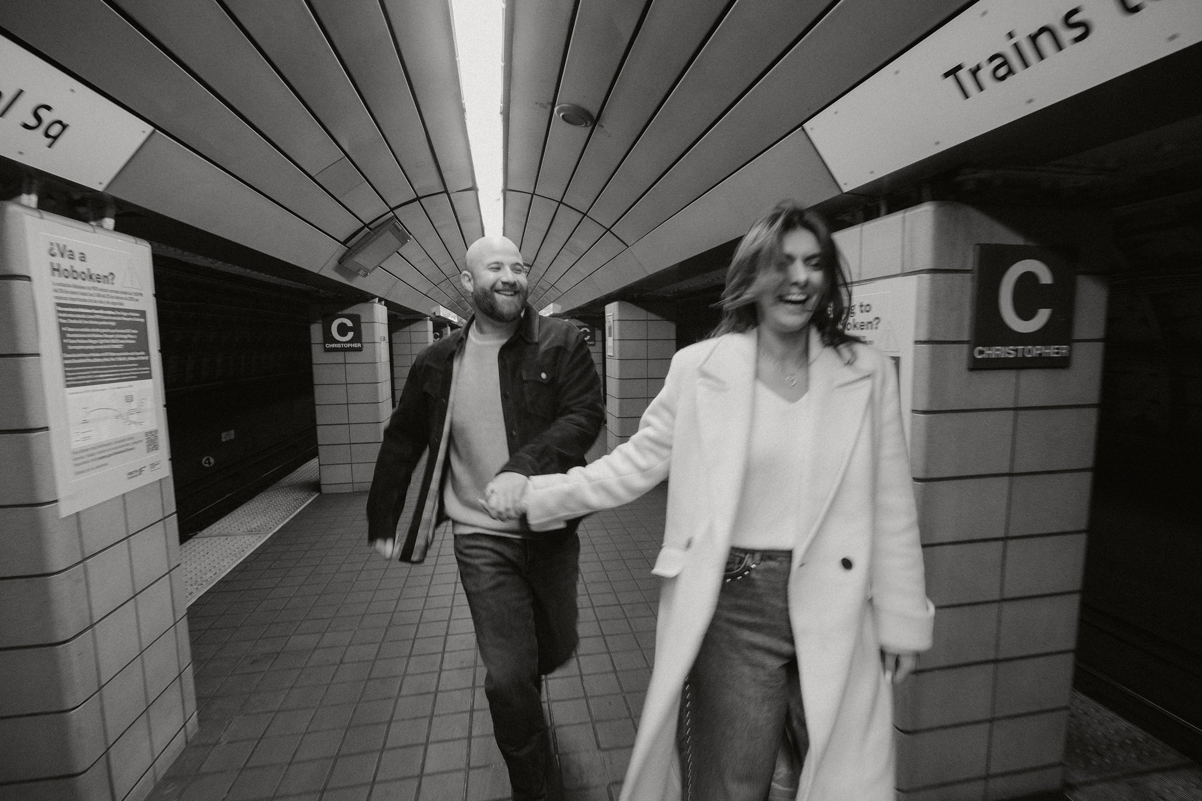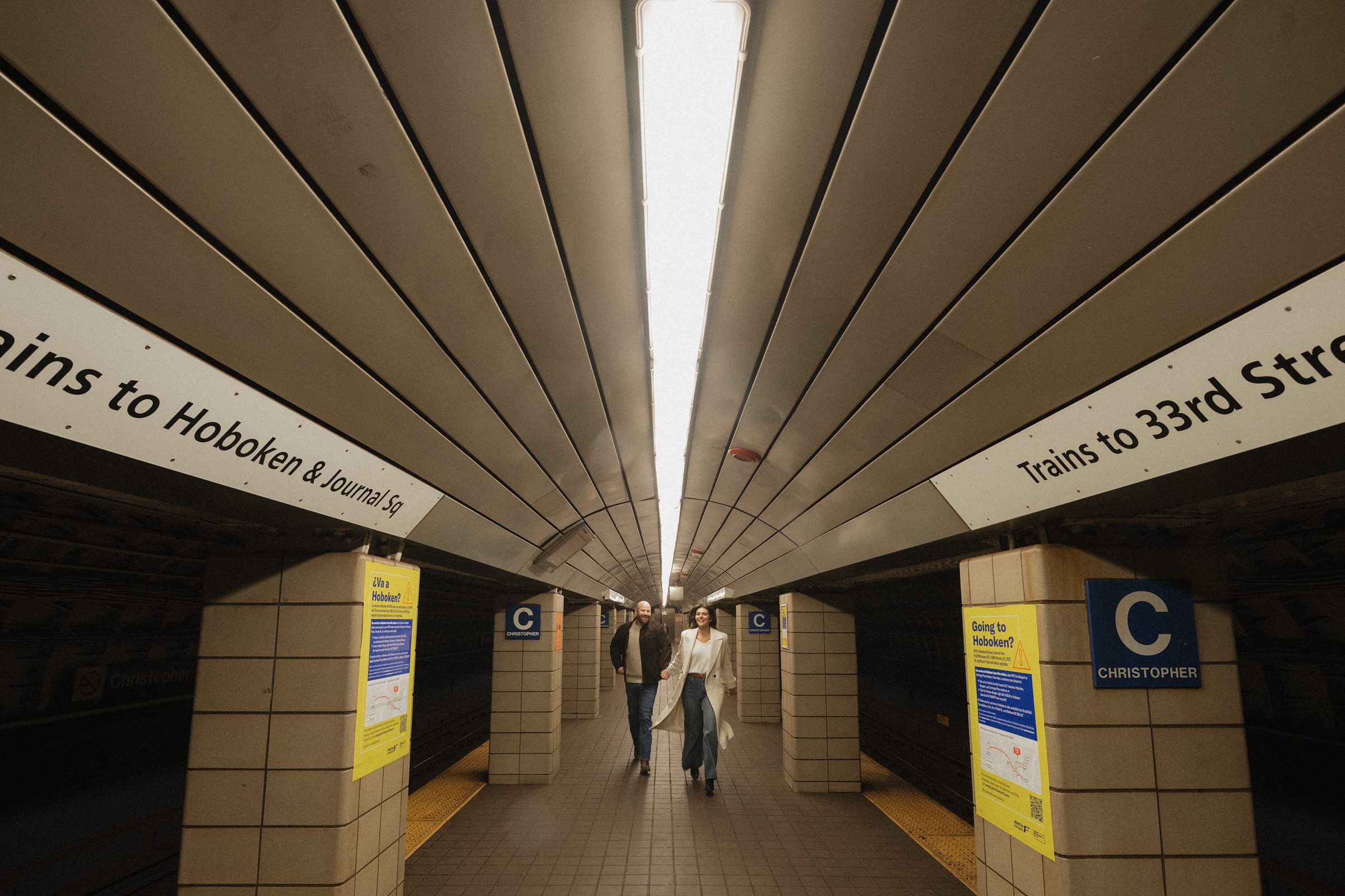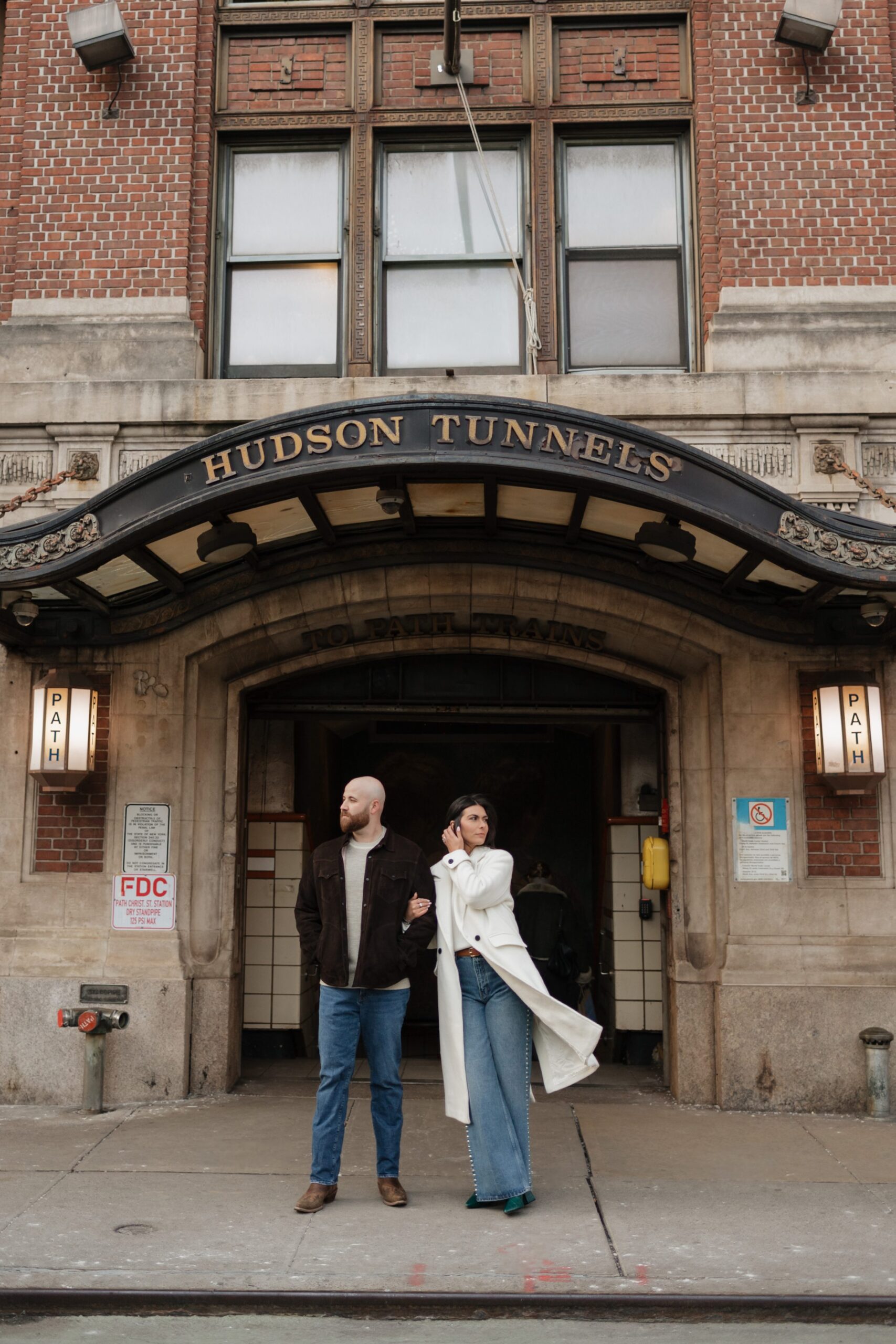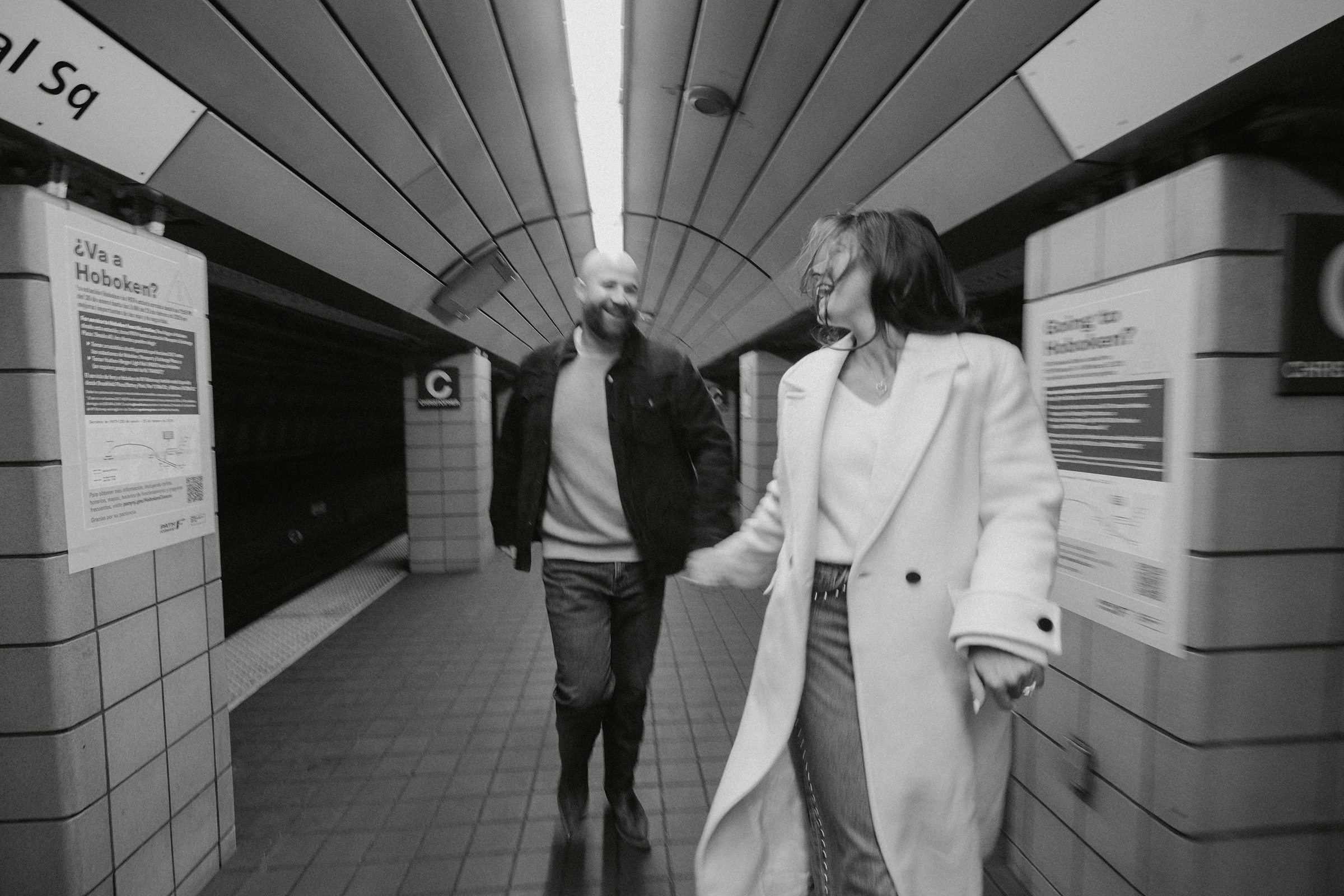When you start an engagement session at the Hudson Tunnel in West Village in New York City, you know it’s going to be a good day. Molly and JB took the train over from their Hoboken apartment, and met us at the Christopher Street Station where our shoot began. Right under the streets of West Village. We kicked things off with some beautiful slow-exposure shots, capturing the rush of trains and the motion of New Yorkers weaving past. It was the perfect mix of city energy and romantic anticipation.