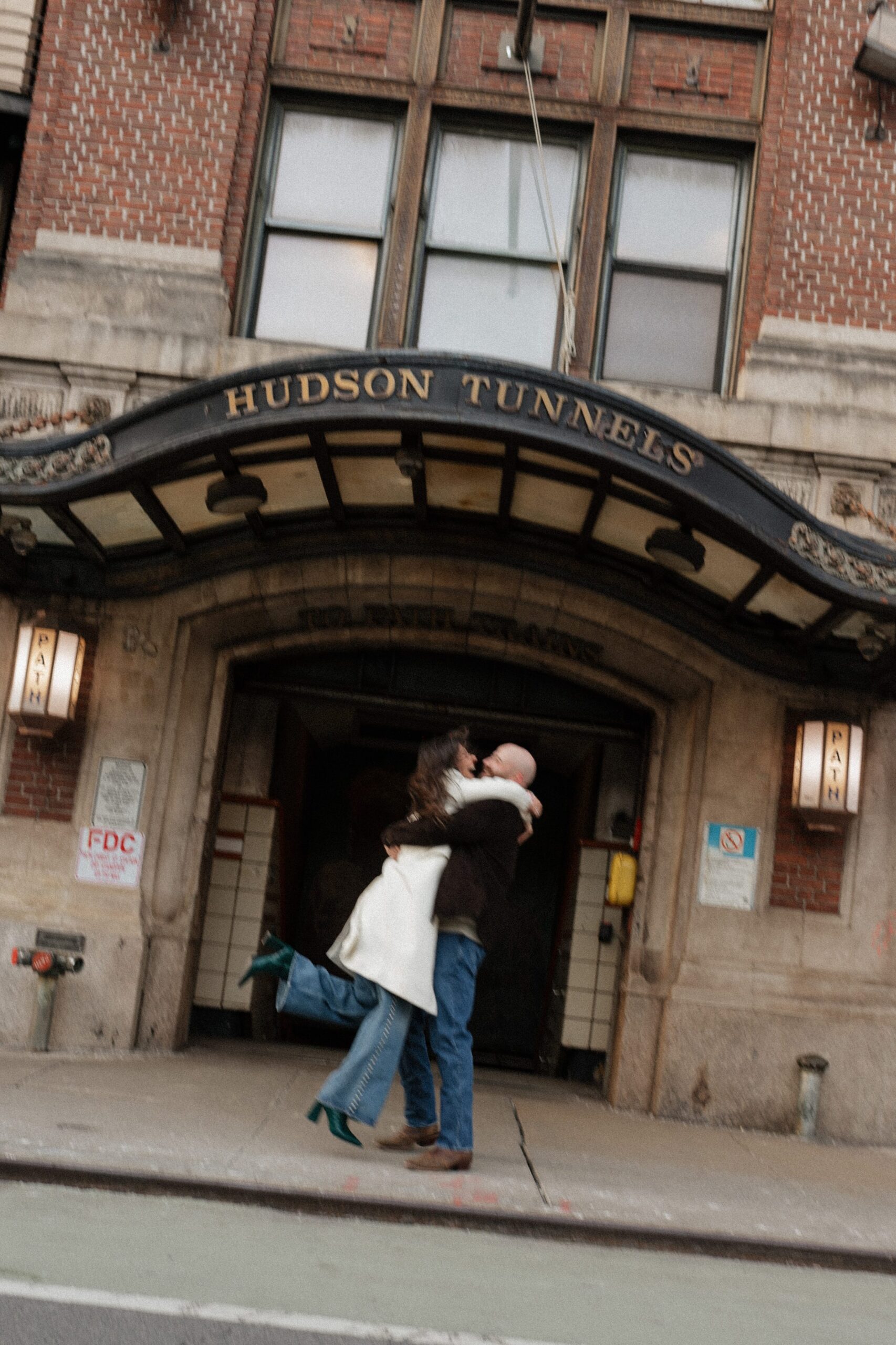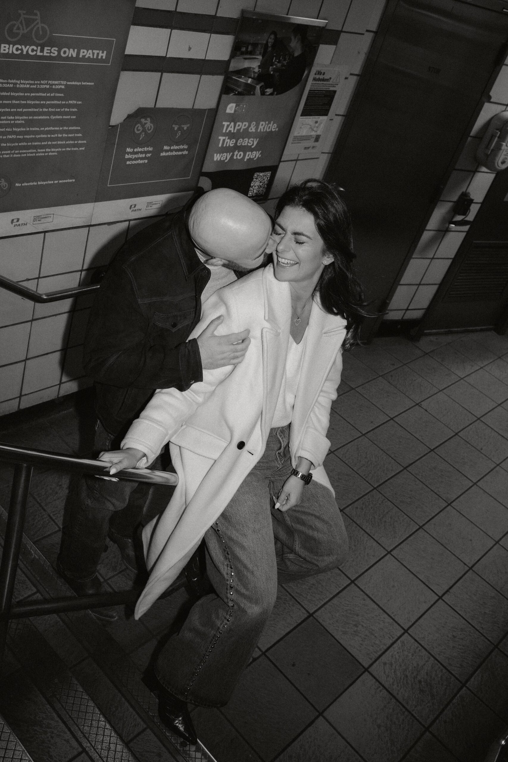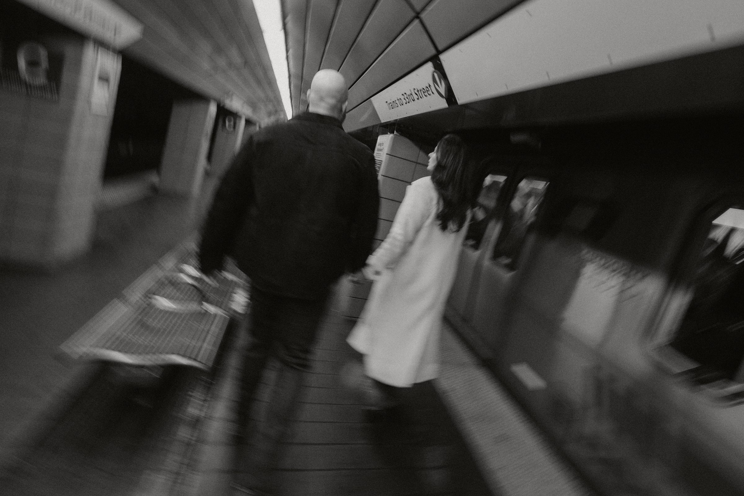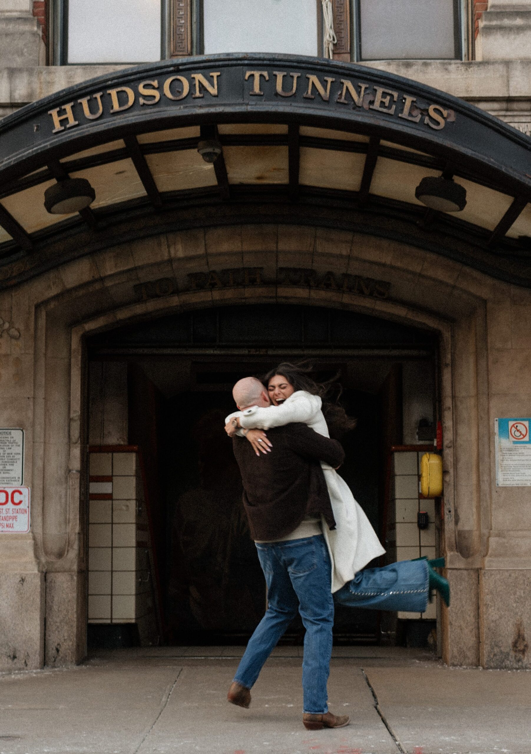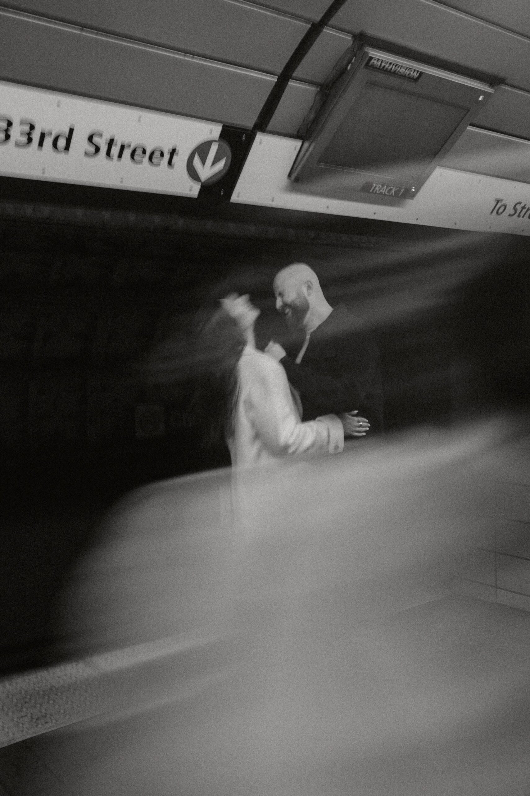 When you start an engagement session at the Hudson Tunnel in West Village in New York City, you know it’s going to be a good day. Molly and JB took the train over from their Hoboken apartment, and met us at the Christopher Street Station where our shoot began. Right under the streets of West Village. We kicked things off with some beautiful slow-exposure shots, capturing the rush of trains and the motion of New Yorkers weaving past. It was the perfect mix of city energy and romantic anticipation.