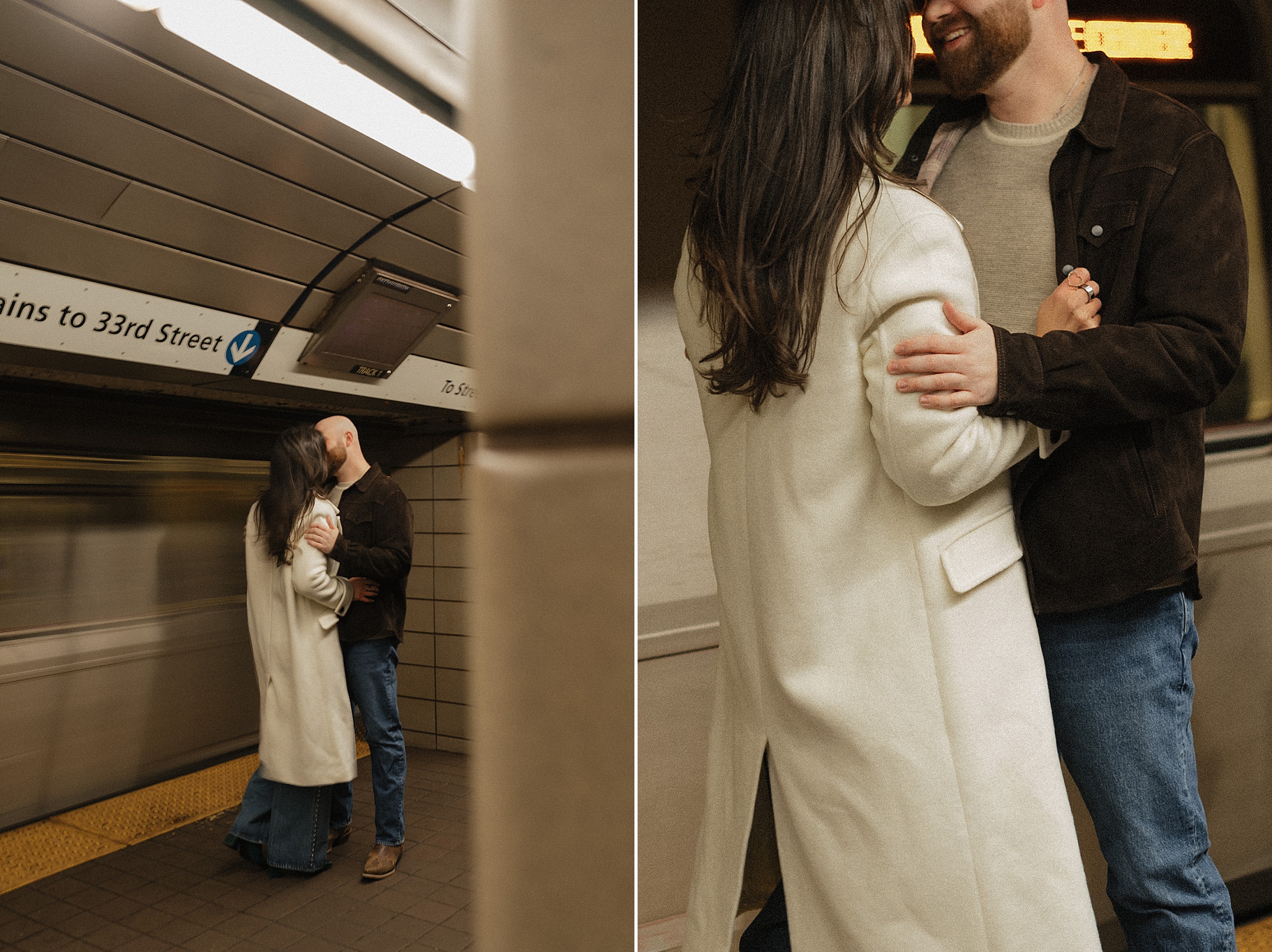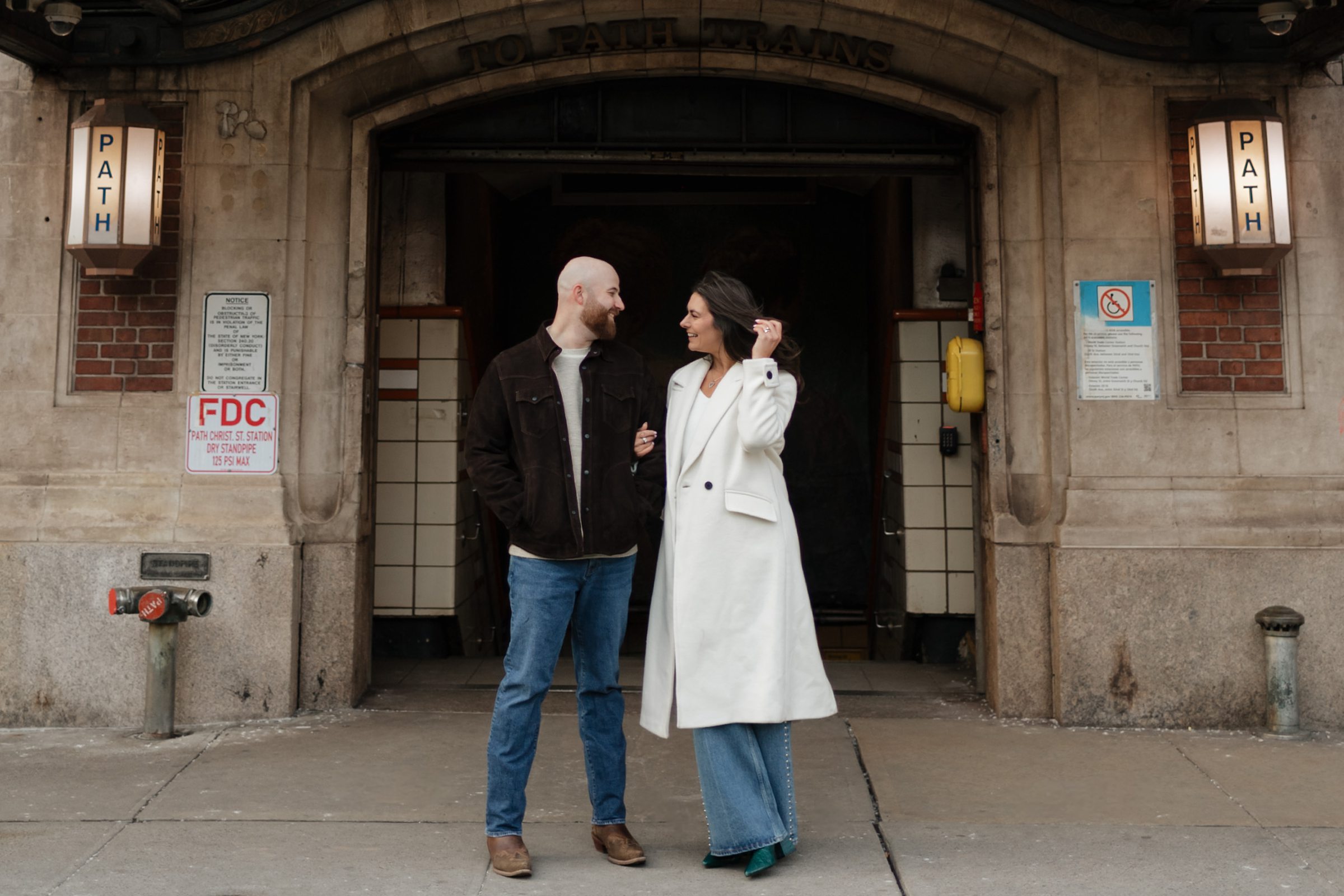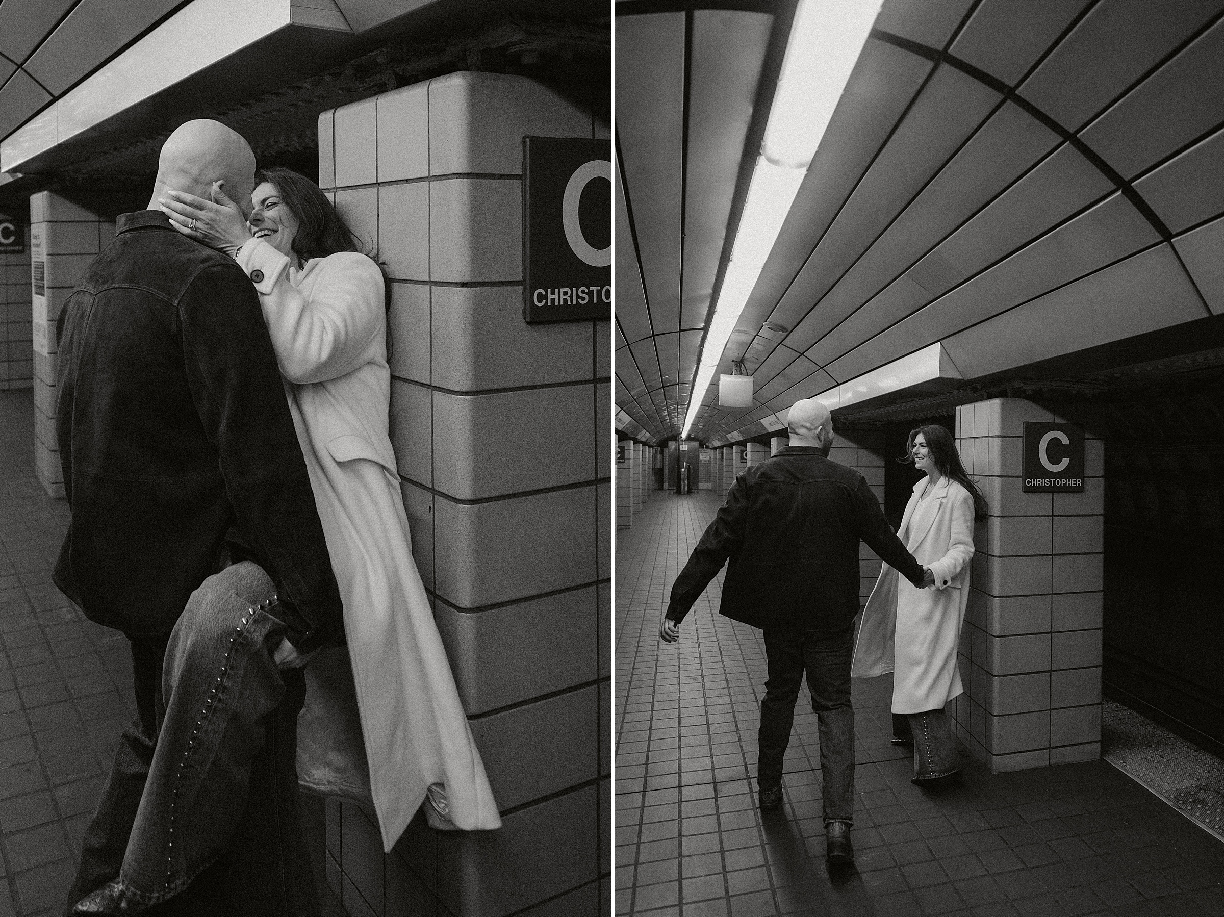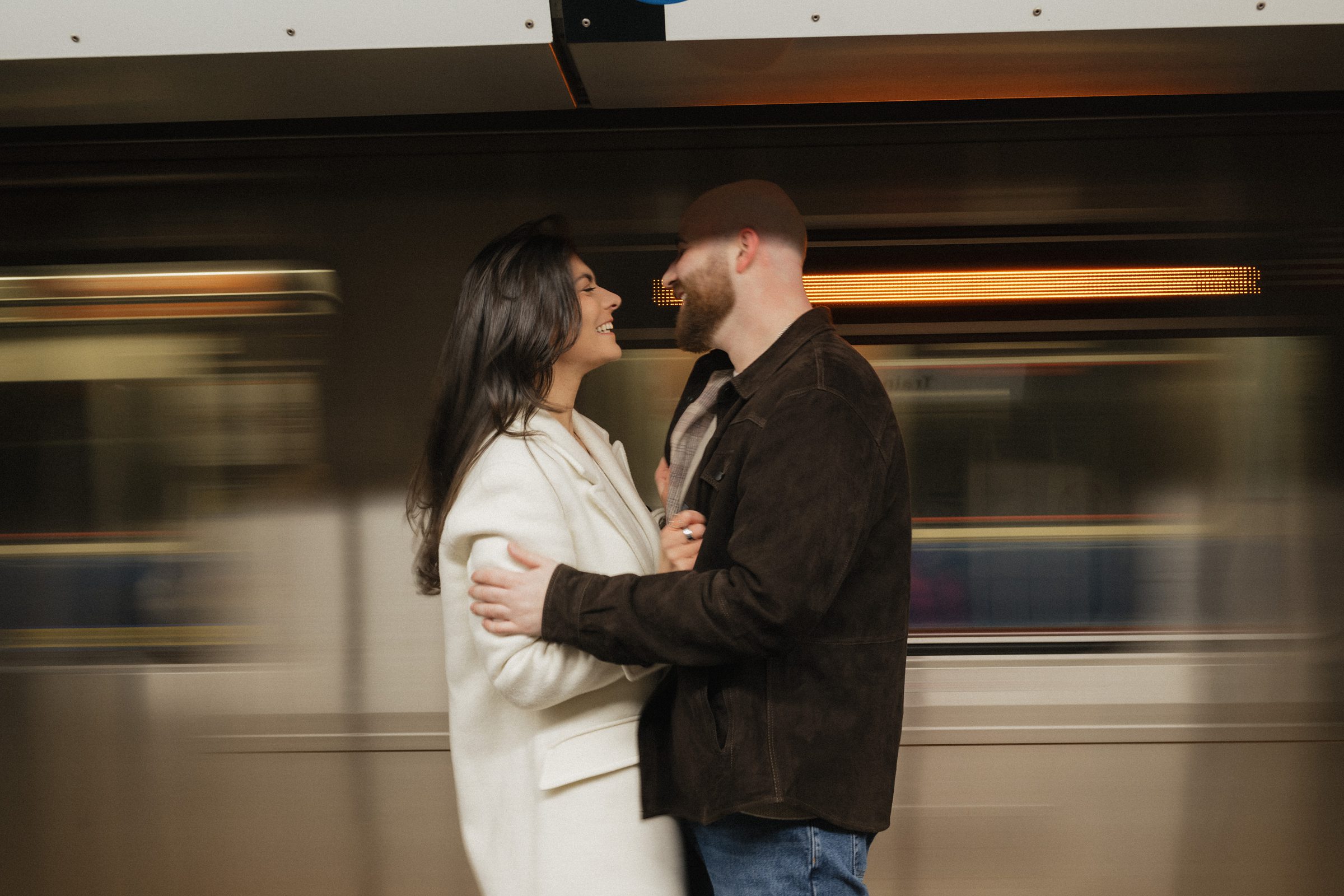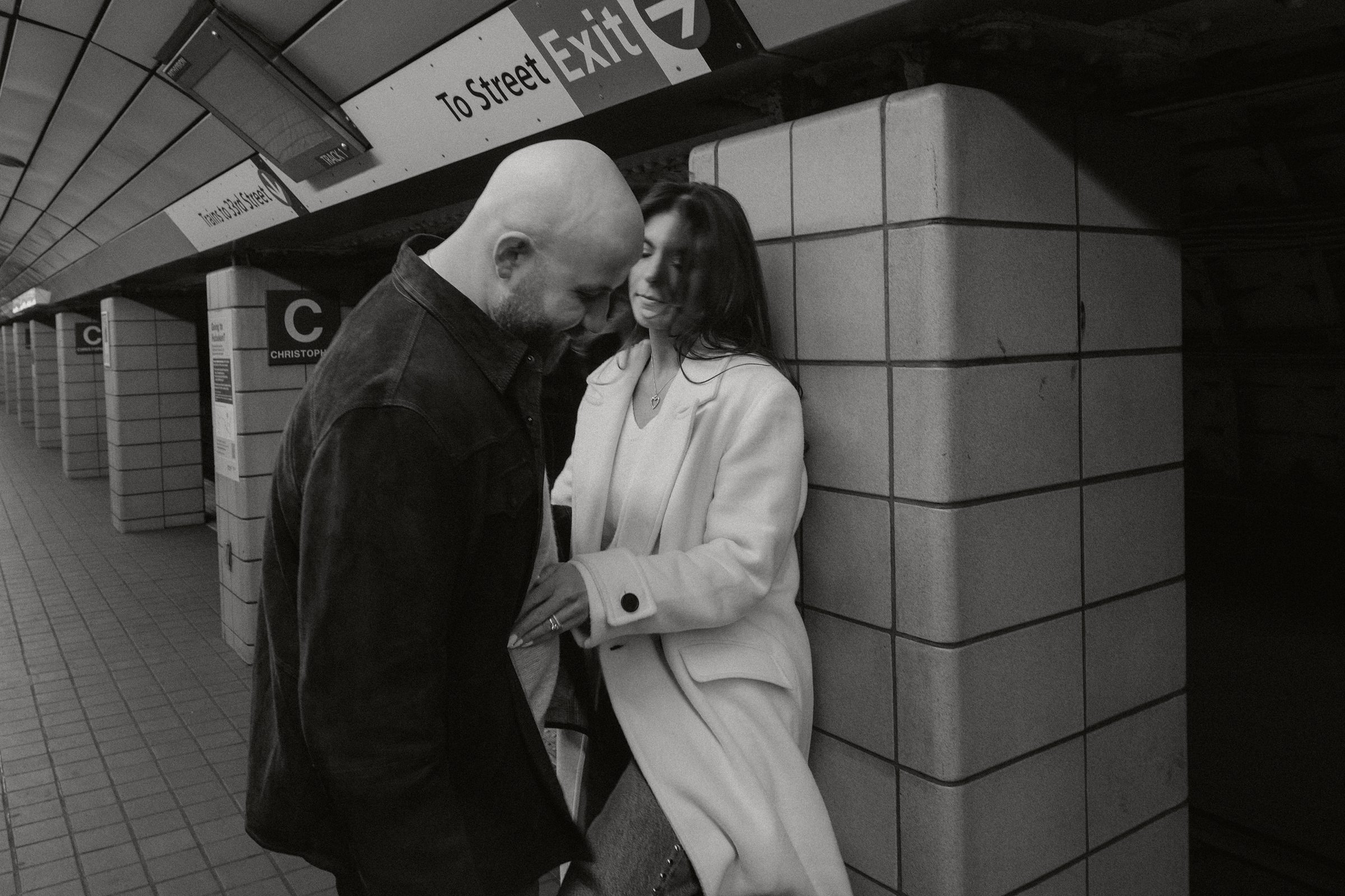 When you start an engagement session at the Hudson Tunnel in West Village in New York City, you know it’s going to be a good day. Molly and JB took the train over from their Hoboken apartment, and met us at the Christopher Street Station where our shoot began. Right under the streets of West Village. We kicked things off with some beautiful slow-exposure shots, capturing the rush of trains and the motion of New Yorkers weaving past. It was the perfect mix of city energy and romantic anticipation.