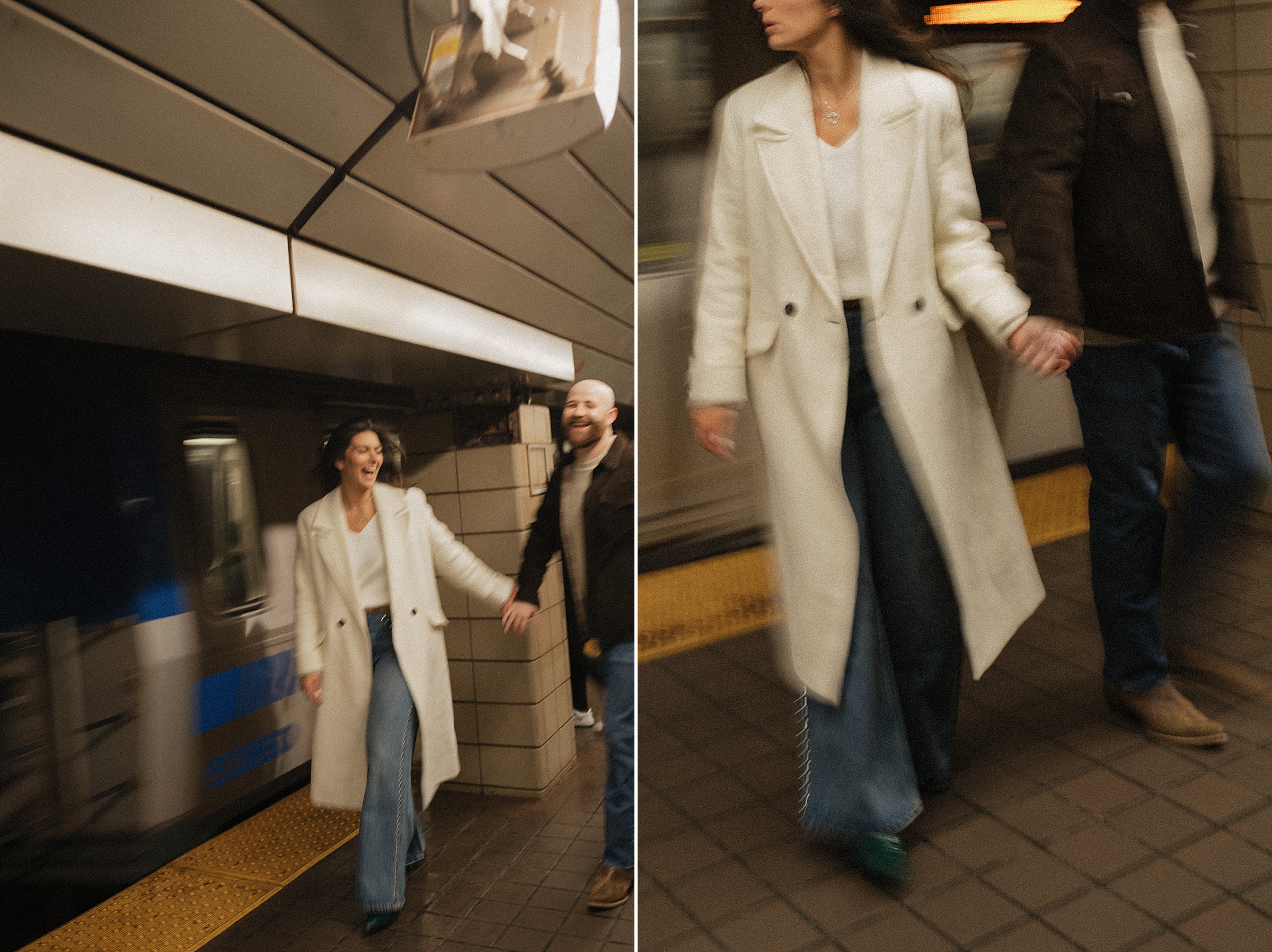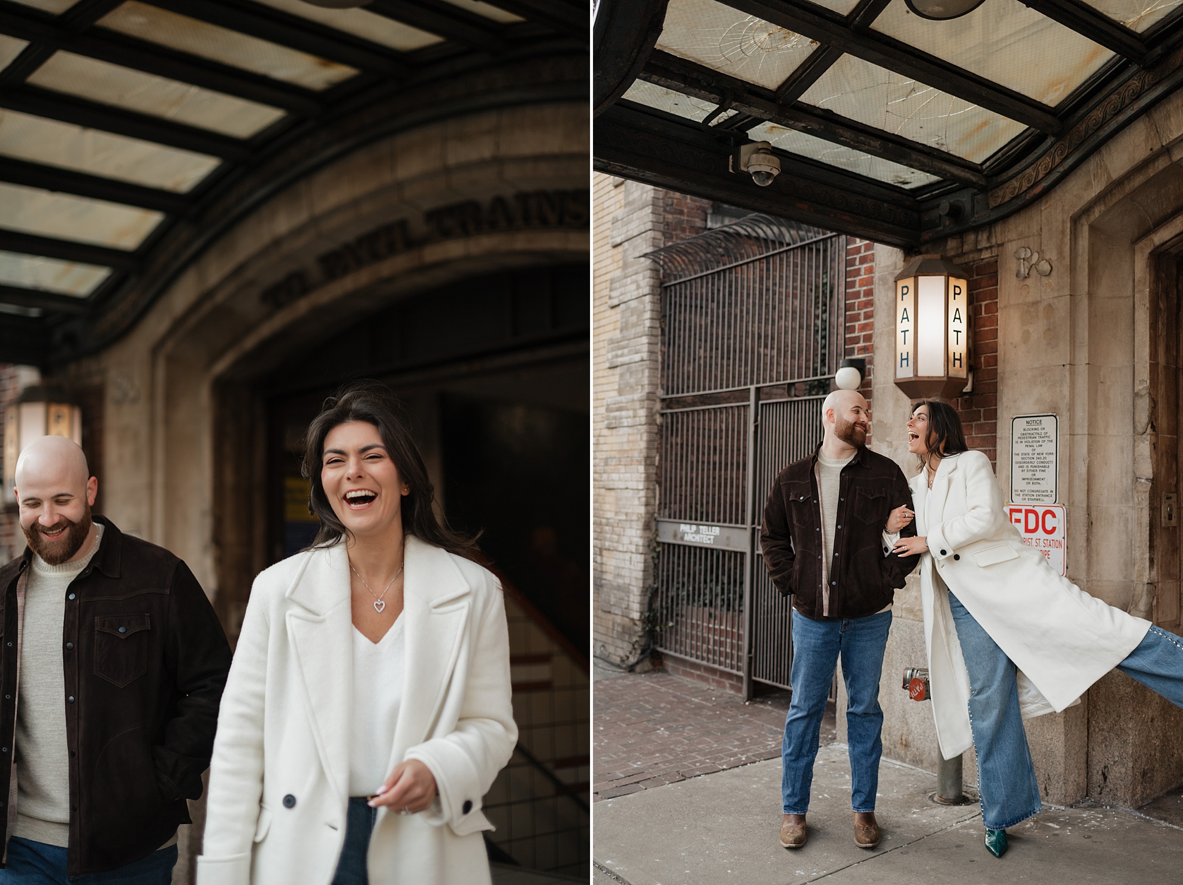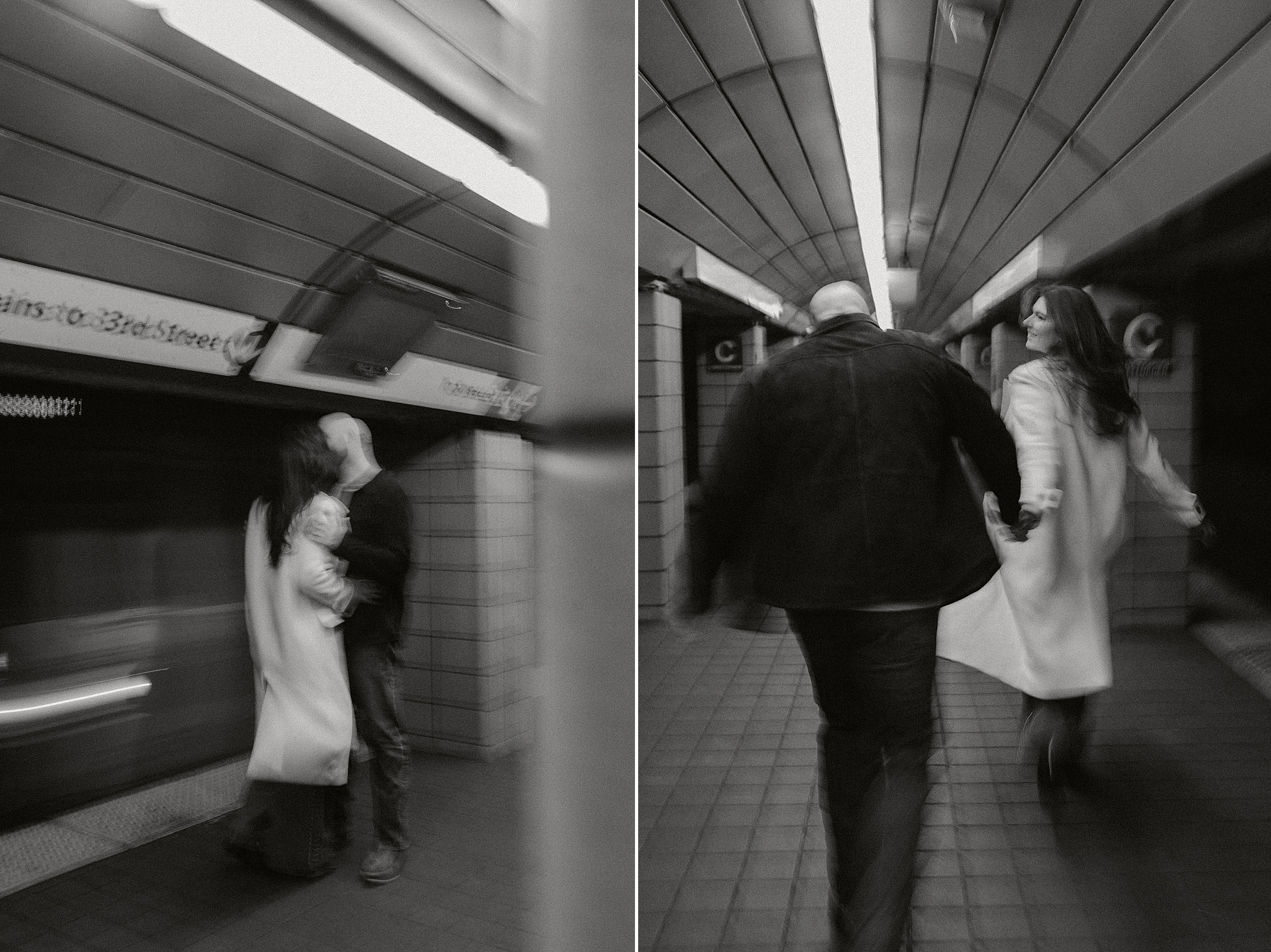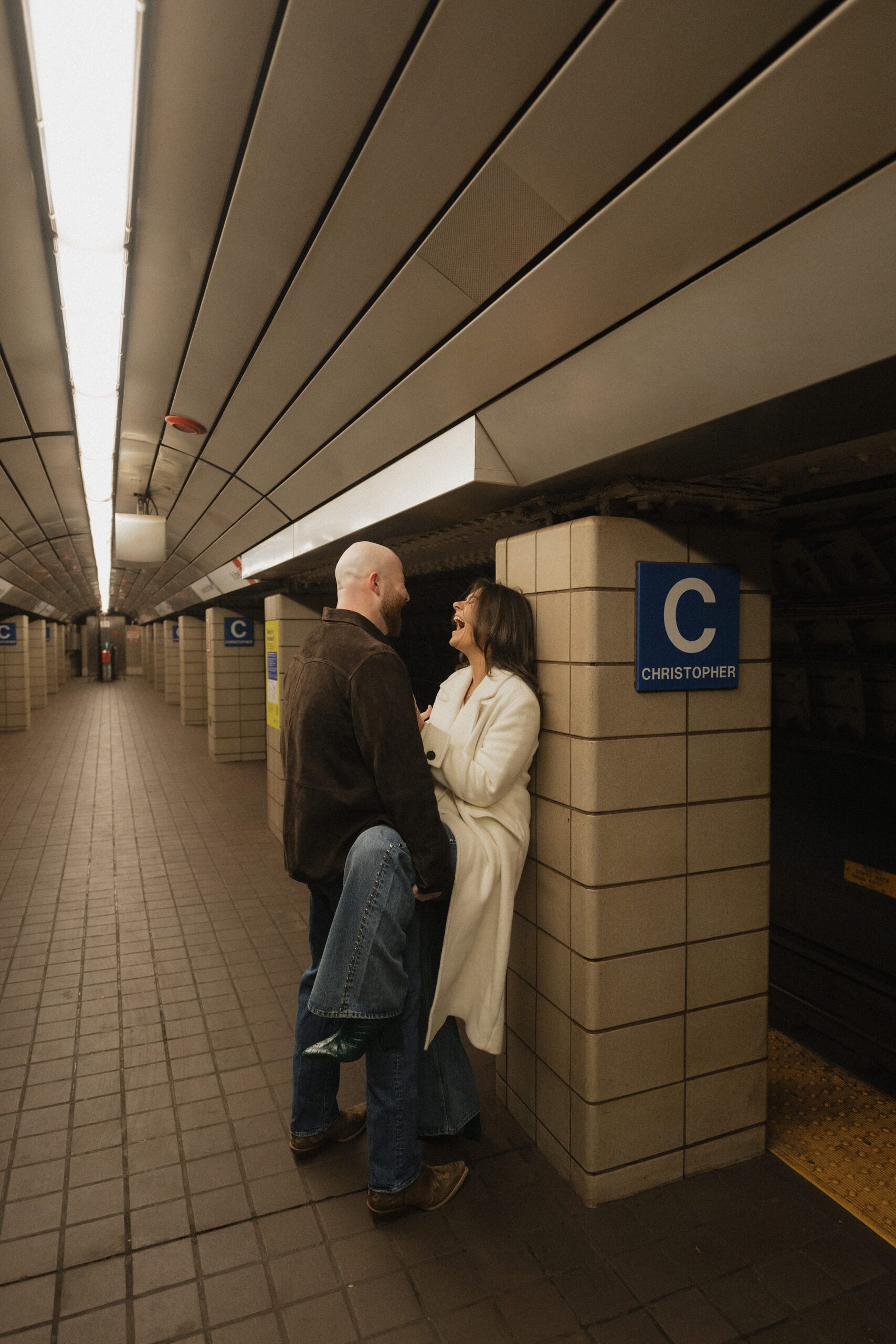 When you start an engagement session at the Hudson Tunnel in West Village in New York City, you know it’s going to be a good day. Molly and JB took the train over from their Hoboken apartment, and met us at the Christopher Street Station where our shoot began. Right under the streets of West Village. We kicked things off with some beautiful slow-exposure shots, capturing the rush of trains and the motion of New Yorkers weaving past. It was the perfect mix of city energy and romantic anticipation.