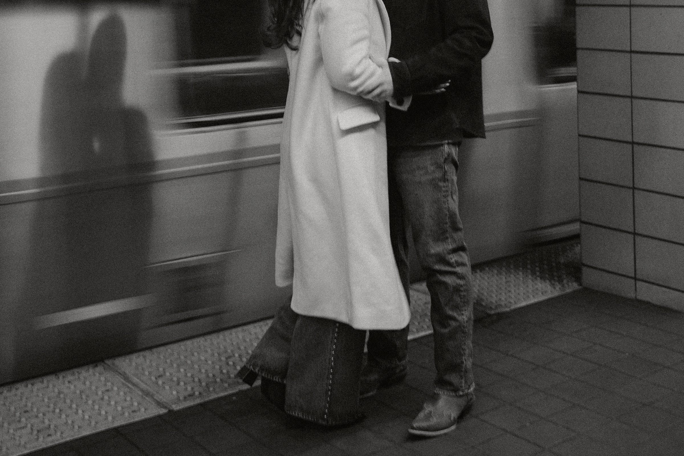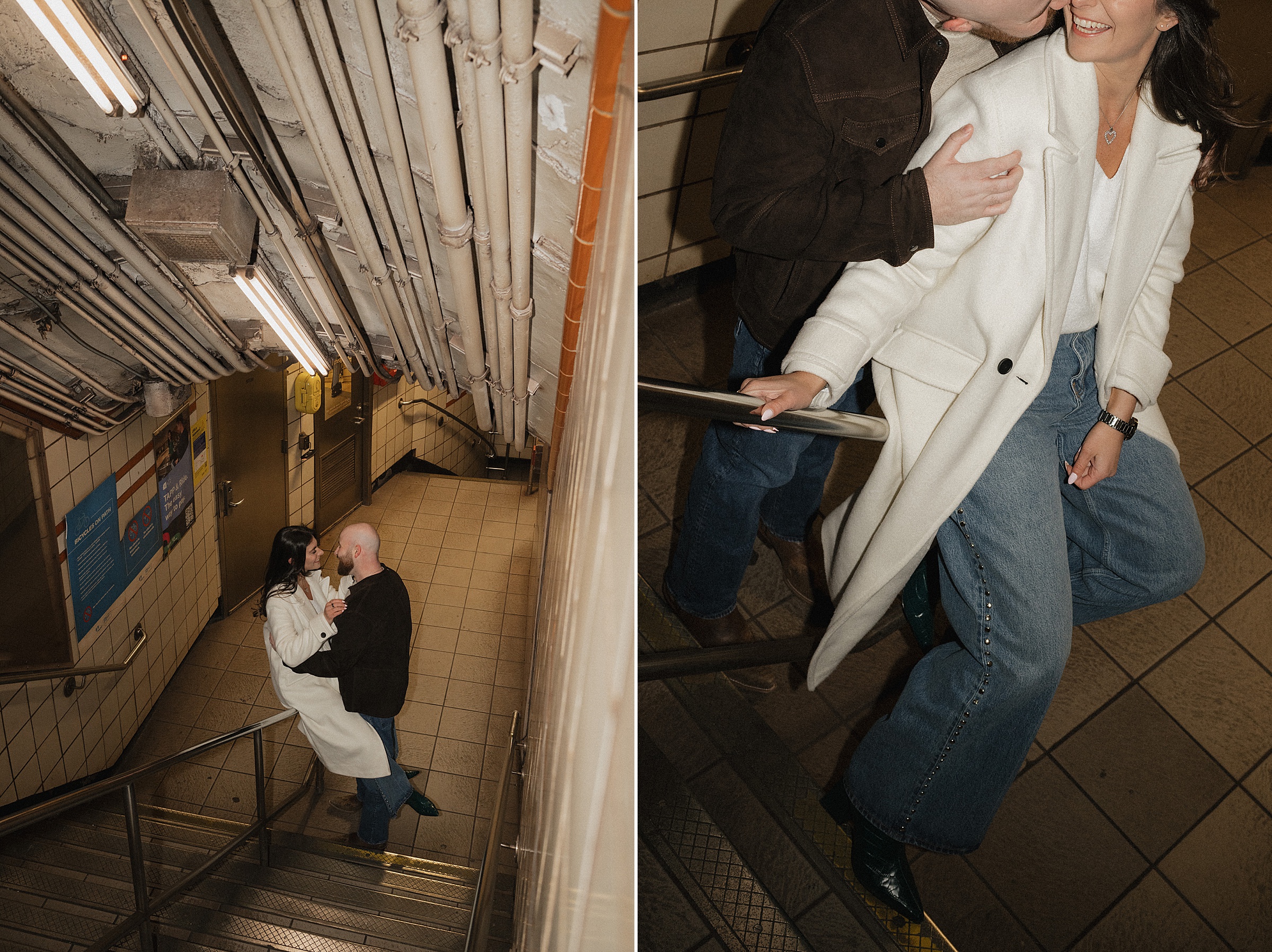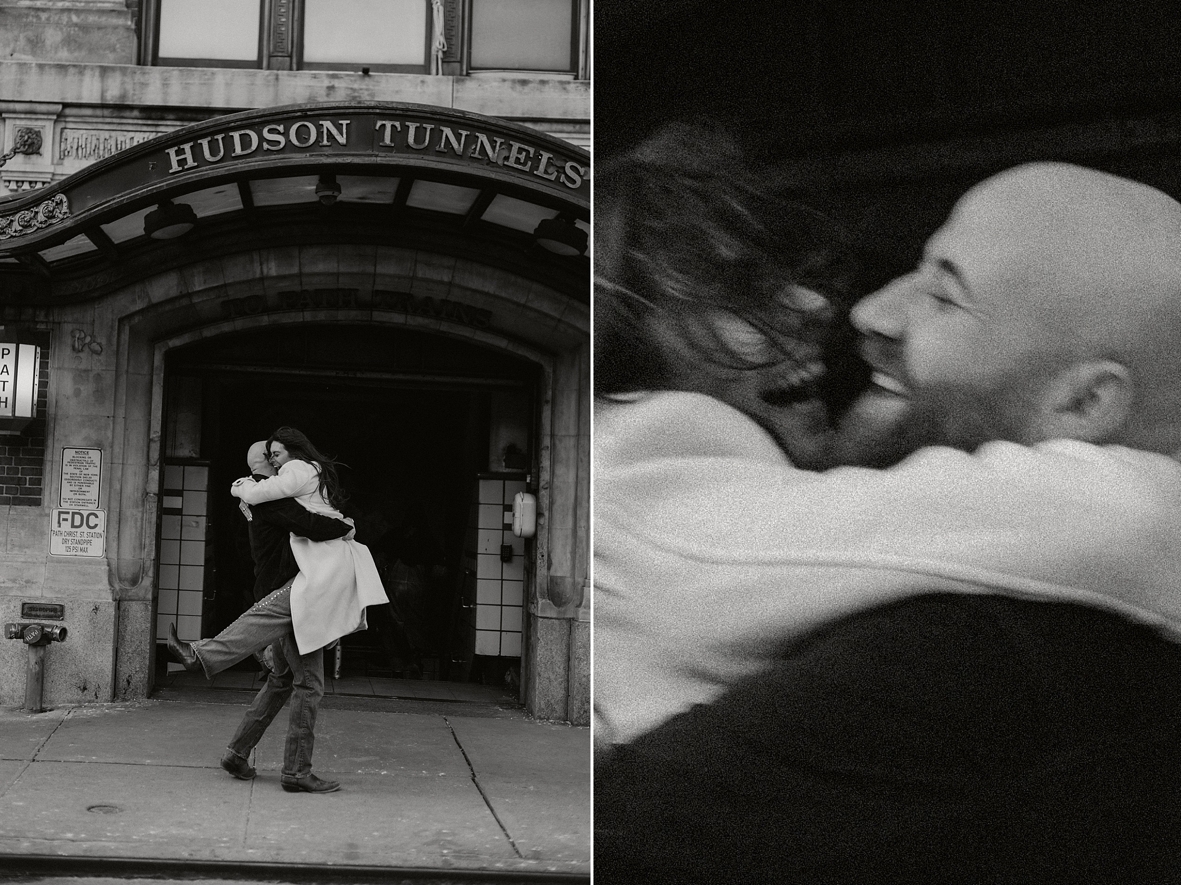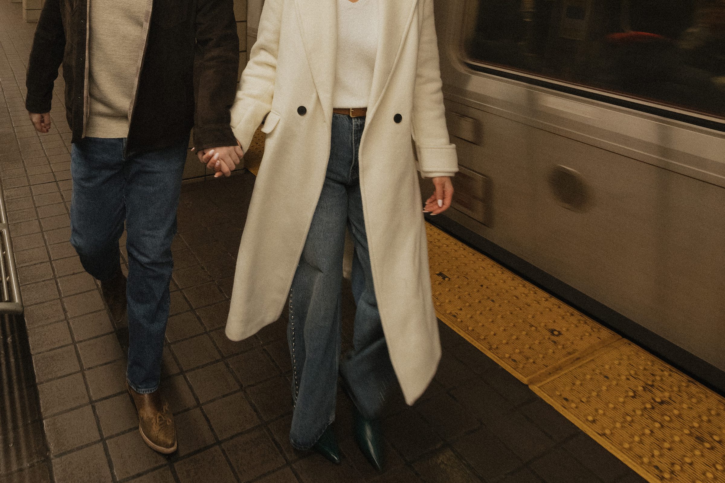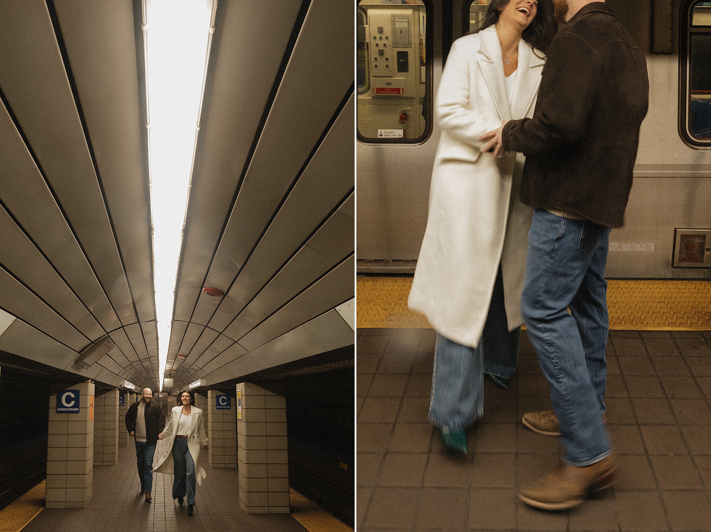 When you start an engagement session at the Hudson Tunnel in West Village in New York City, you know it’s going to be a good day. Molly and JB took the train over from their Hoboken apartment, and met us at the Christopher Street Station where our shoot began. Right under the streets of West Village. We kicked things off with some beautiful slow-exposure shots, capturing the rush of trains and the motion of New Yorkers weaving past. It was the perfect mix of city energy and romantic anticipation.