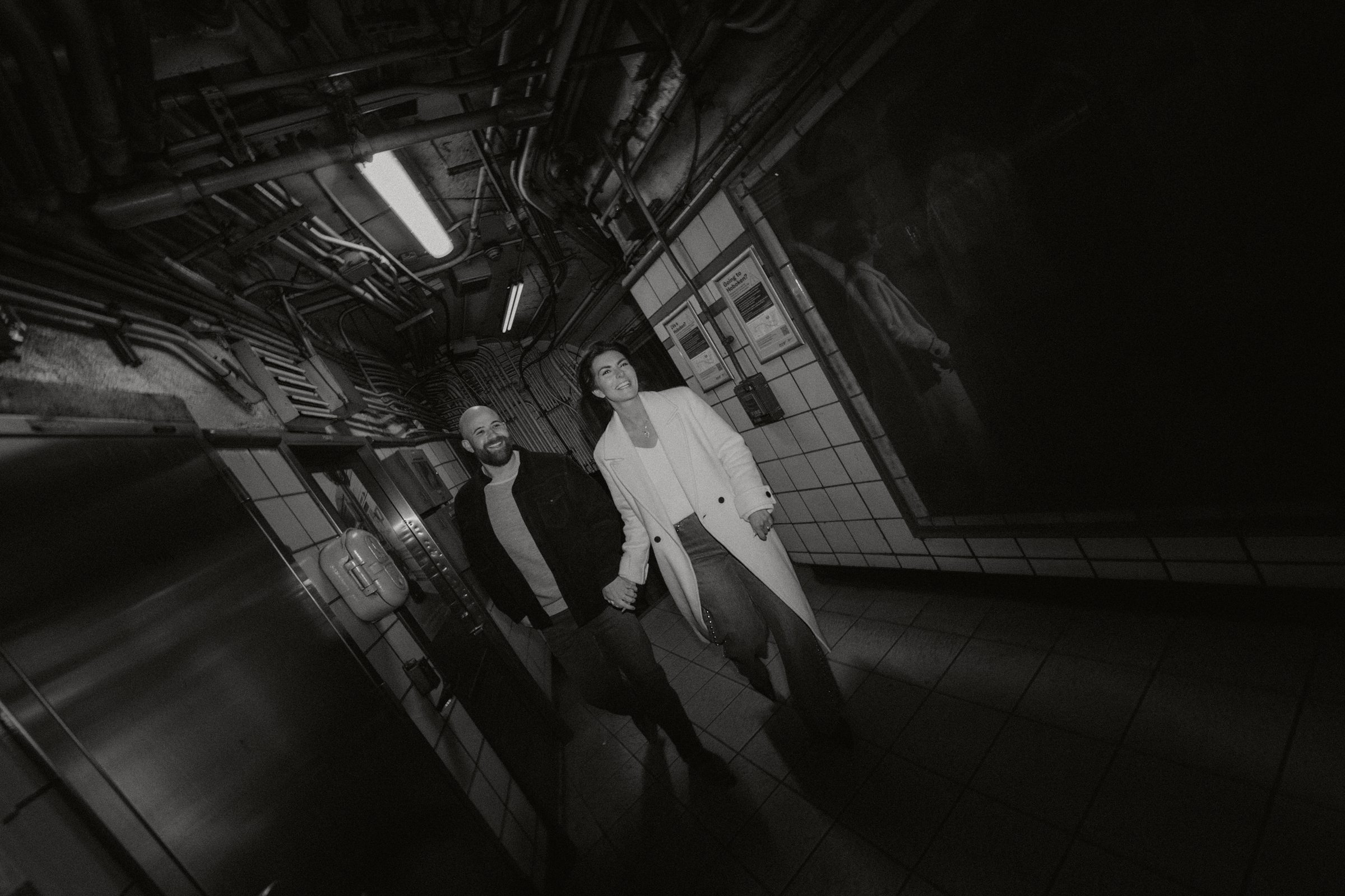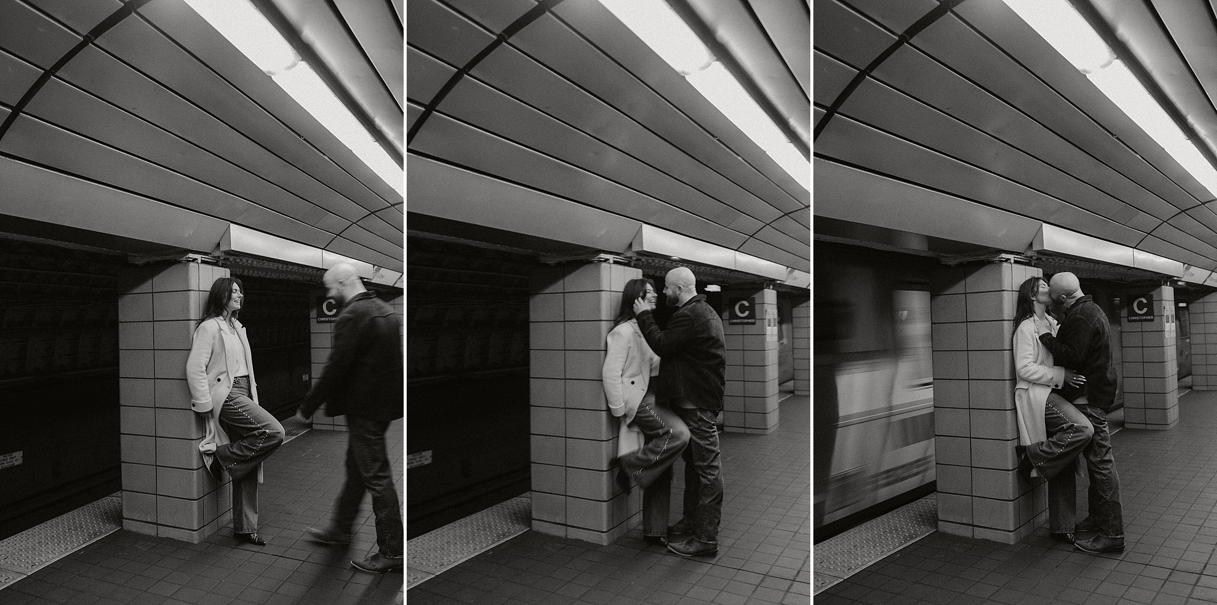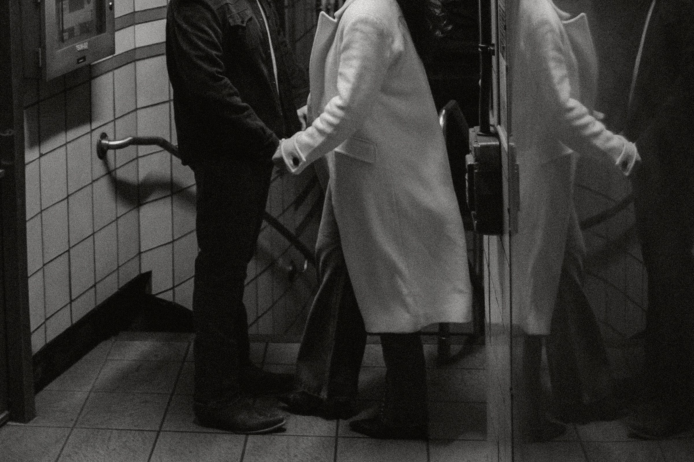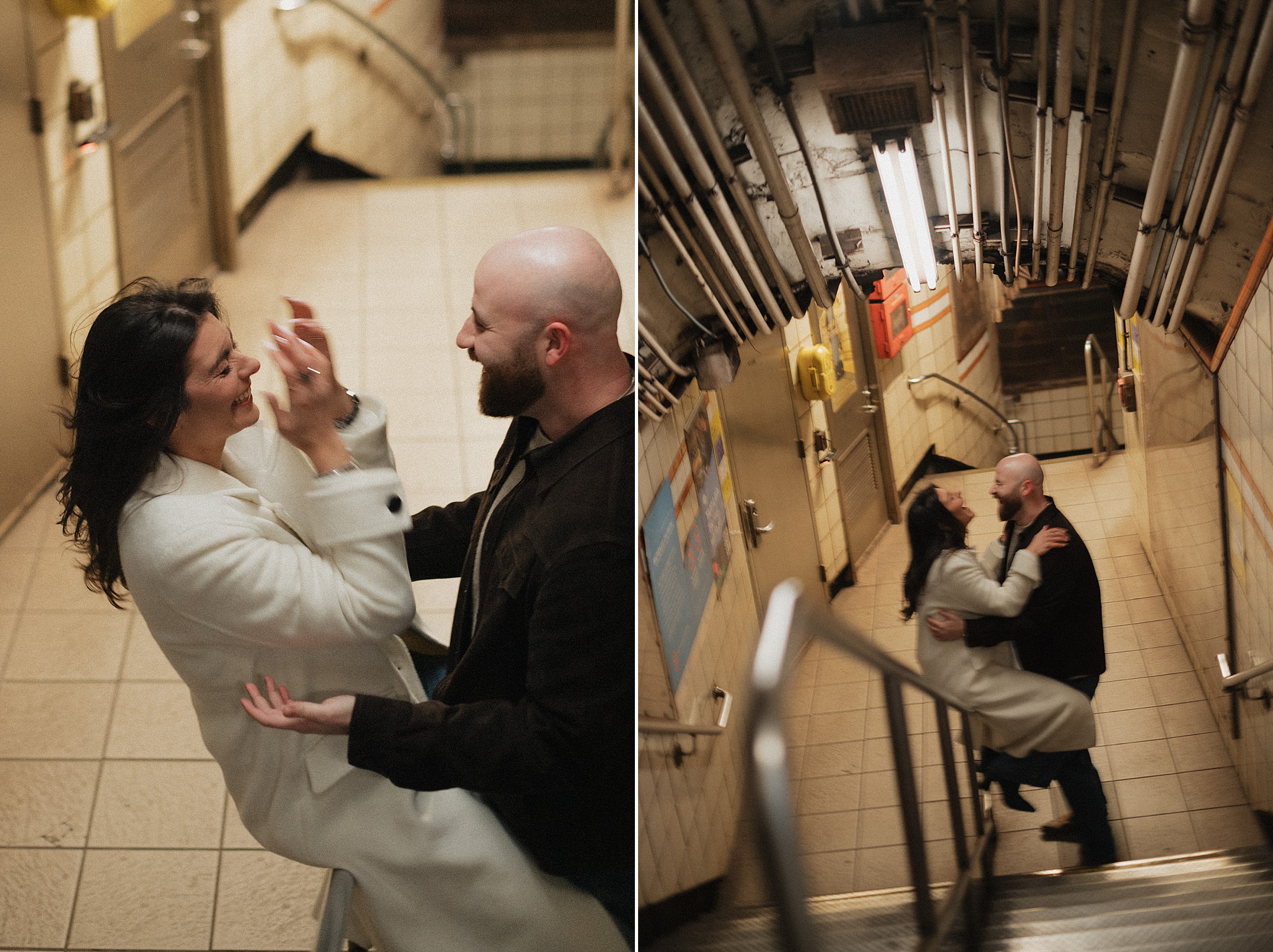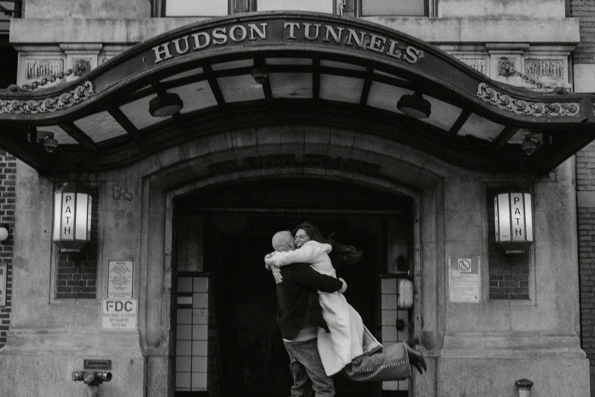 When you start an engagement session at the Hudson Tunnel in West Village in New York City, you know it’s going to be a good day. Molly and JB took the train over from their Hoboken apartment, and met us at the Christopher Street Station where our shoot began. Right under the streets of West Village. We kicked things off with some beautiful slow-exposure shots, capturing the rush of trains and the motion of New Yorkers weaving past. It was the perfect mix of city energy and romantic anticipation.