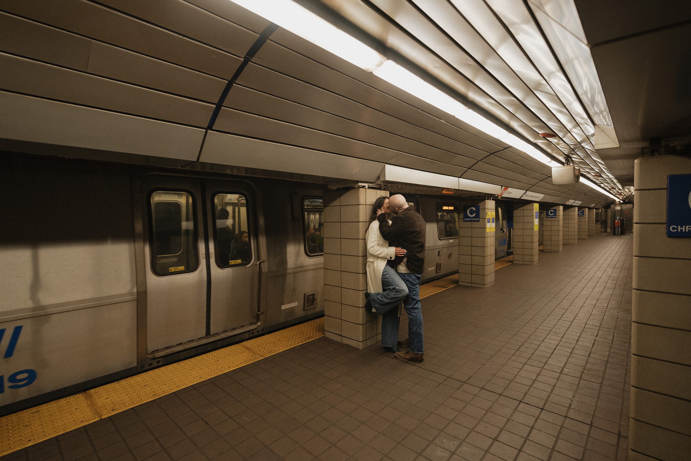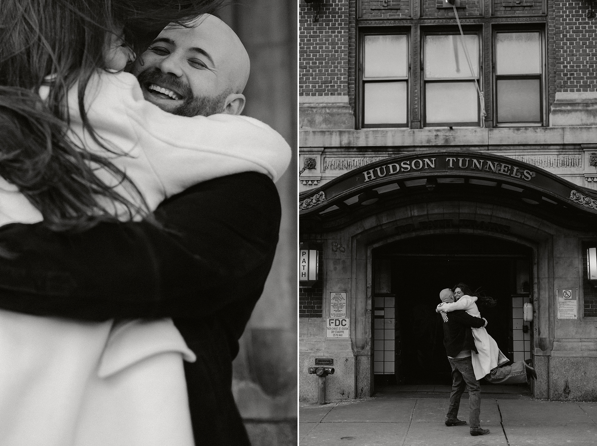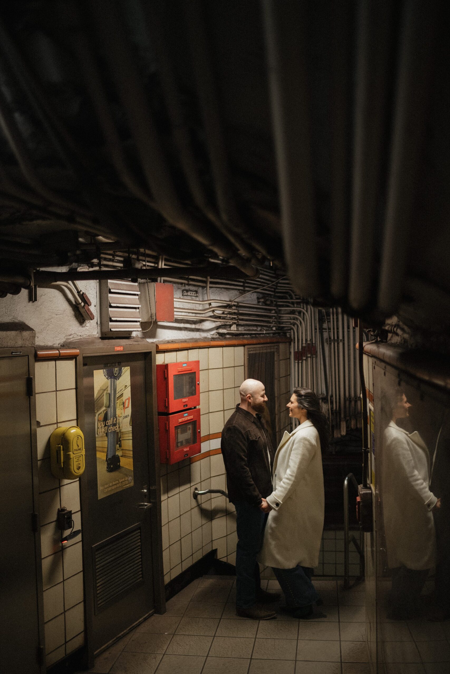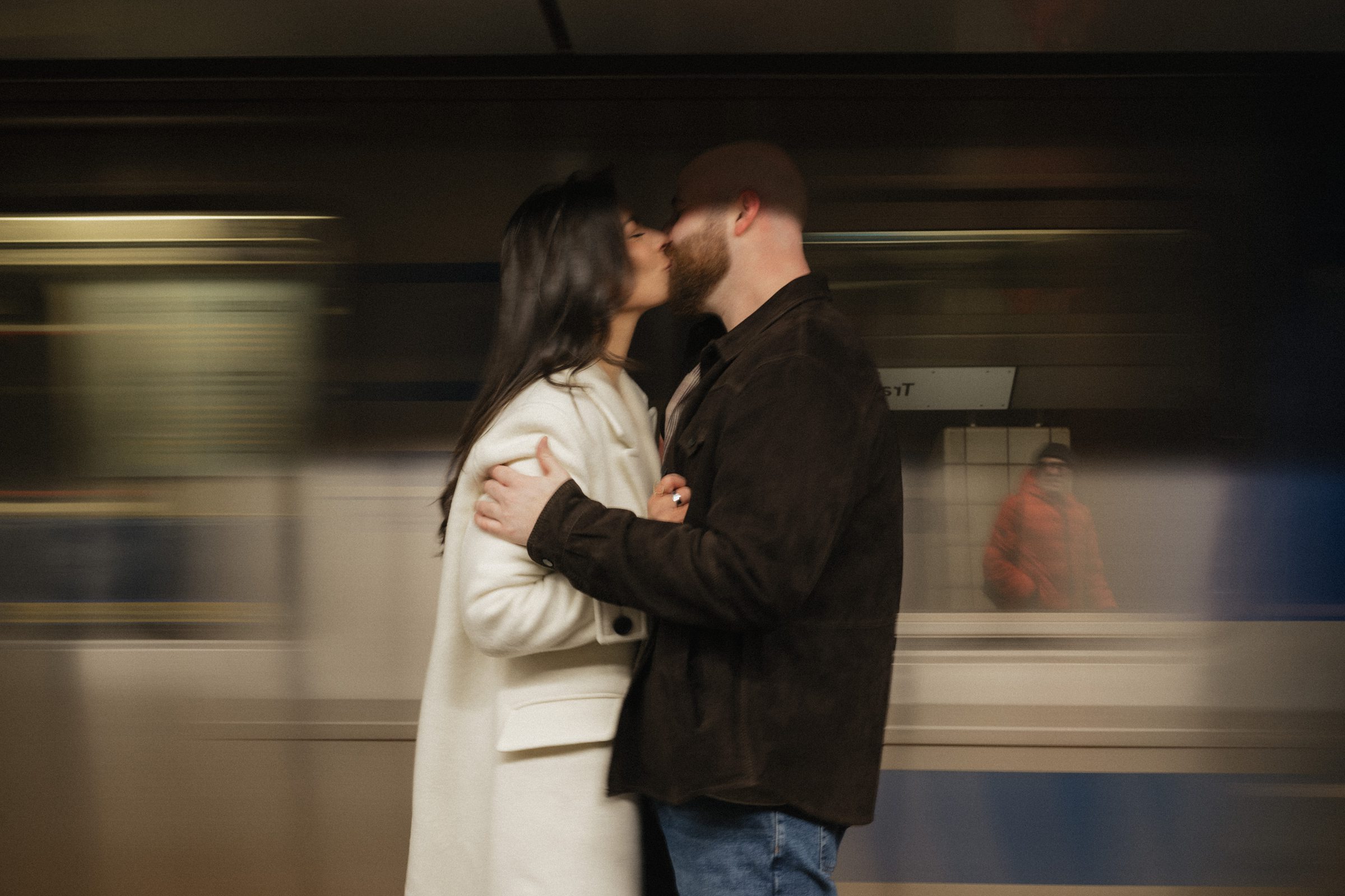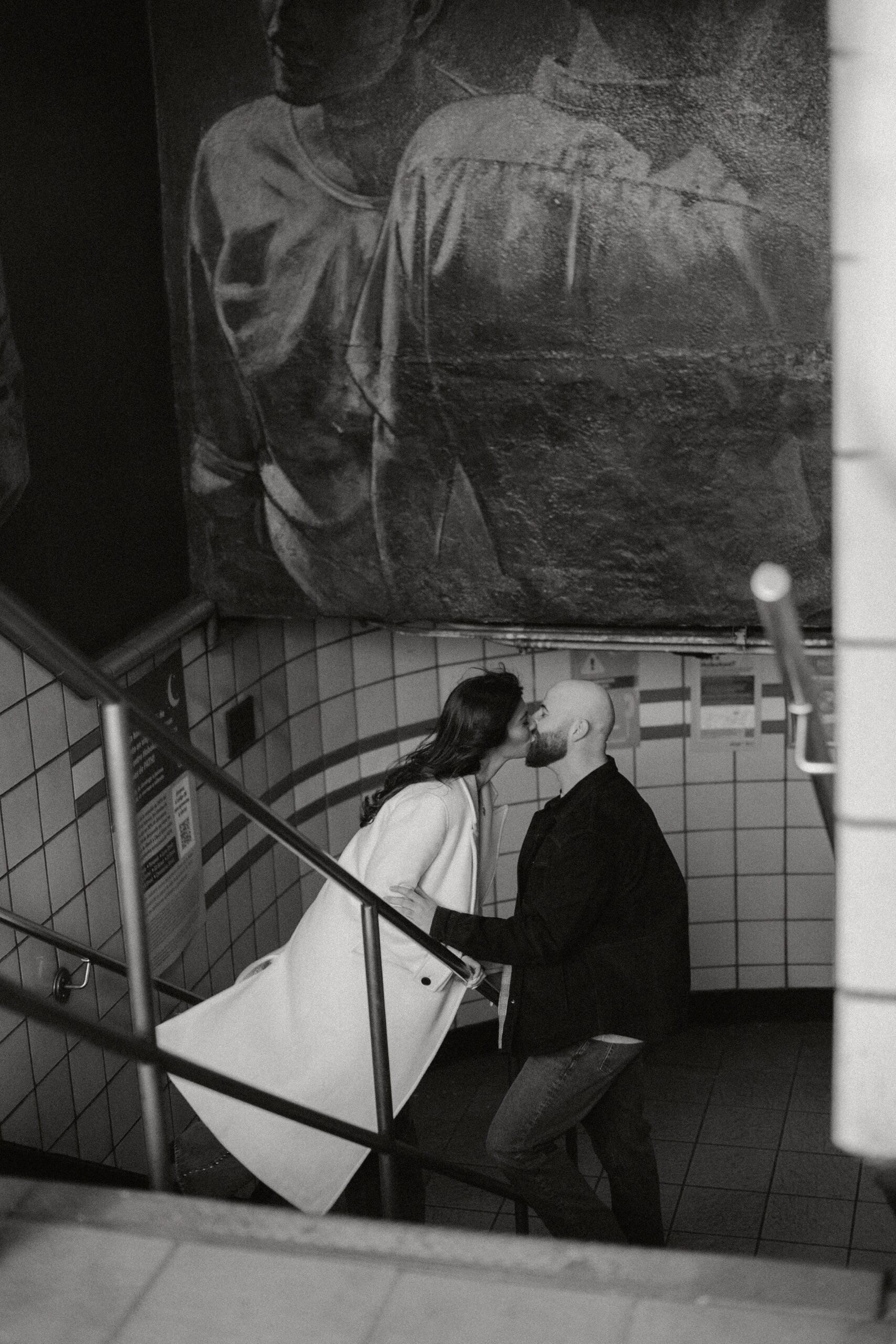 When you start an engagement session at the Hudson Tunnel in West Village in New York City, you know it’s going to be a good day. Molly and JB took the train over from their Hoboken apartment, and met us at the Christopher Street Station where our shoot began. Right under the streets of West Village. We kicked things off with some beautiful slow-exposure shots, capturing the rush of trains and the motion of New Yorkers weaving past. It was the perfect mix of city energy and romantic anticipation.