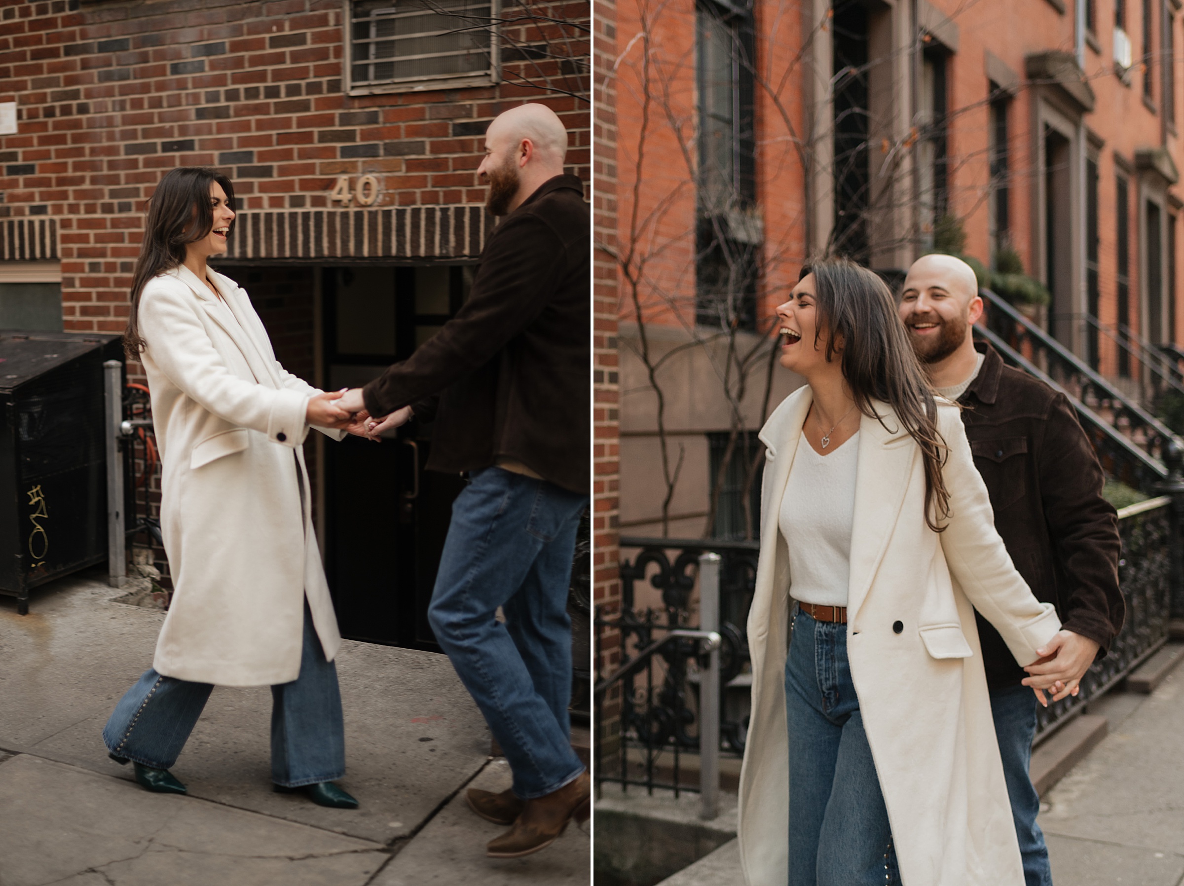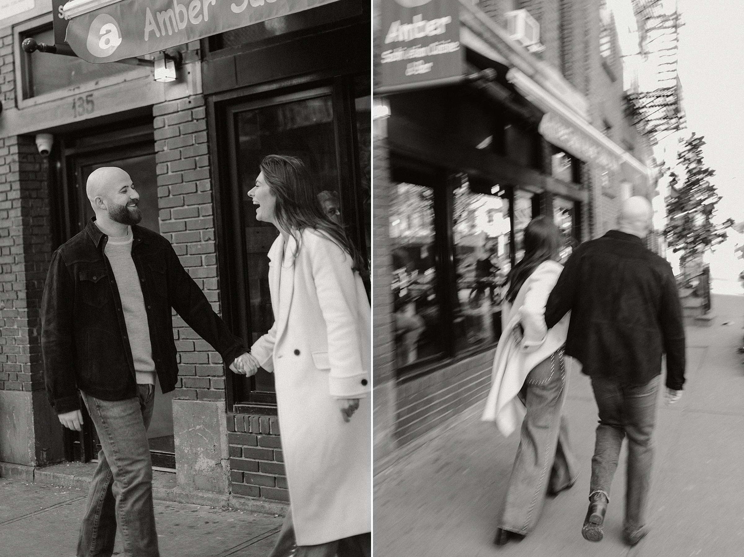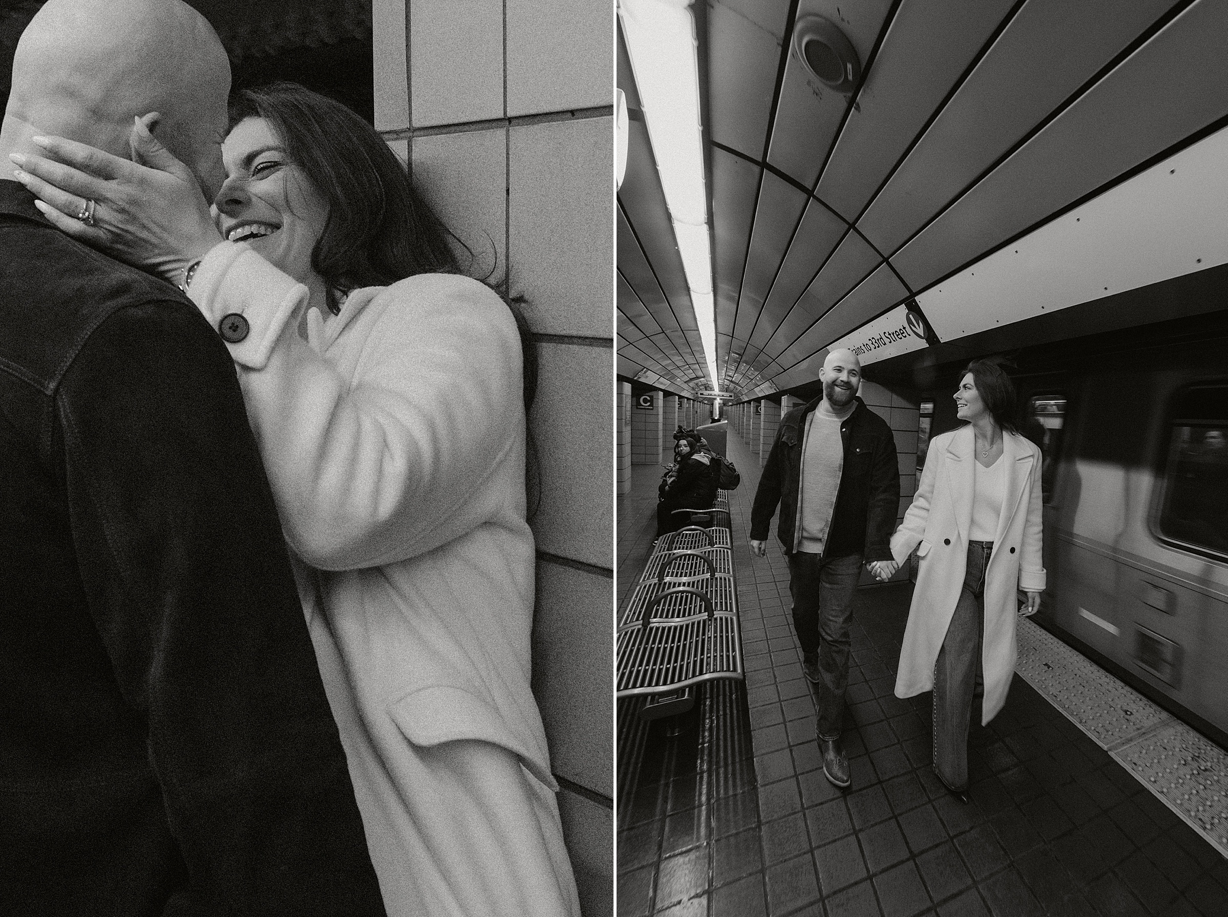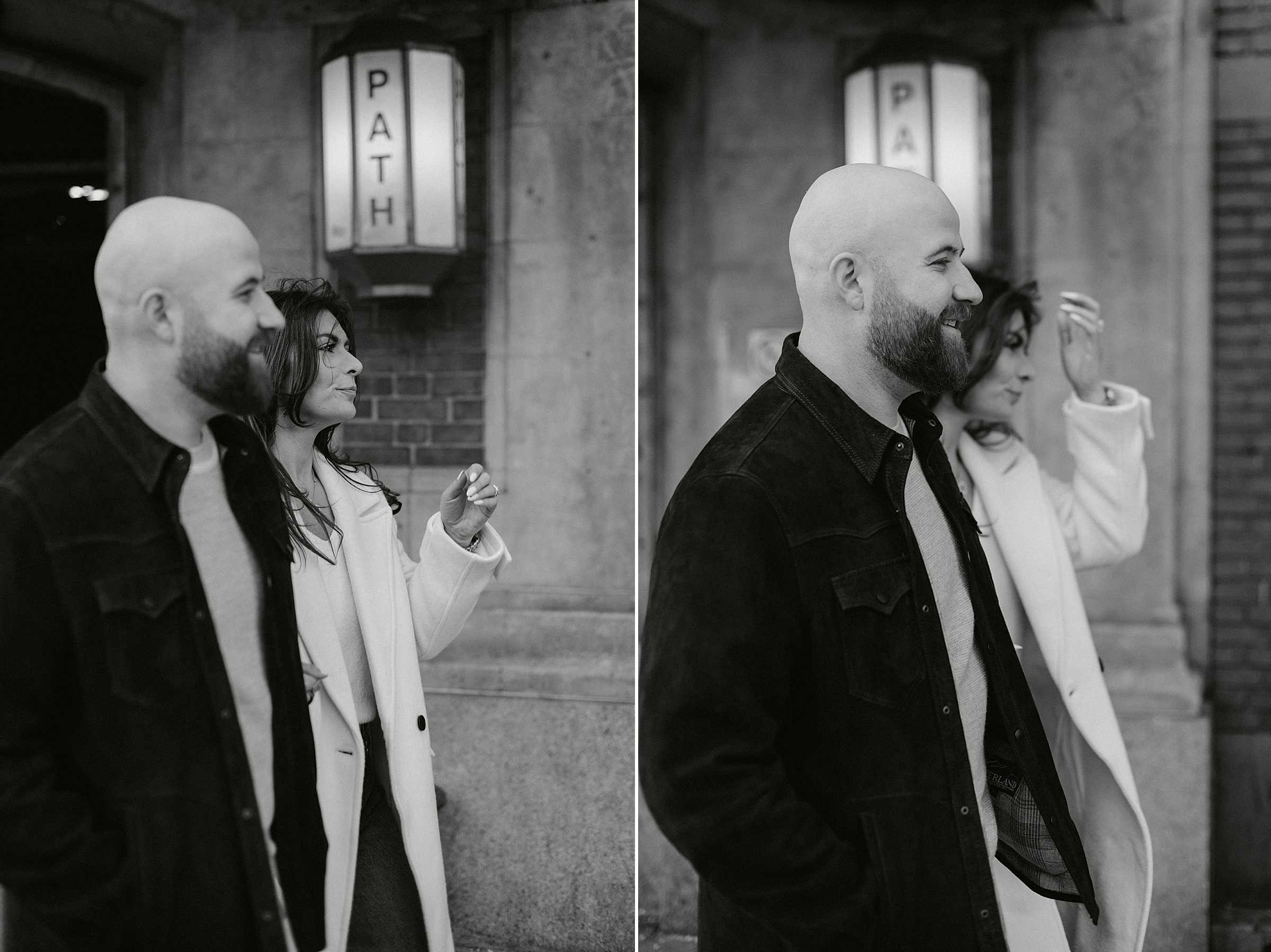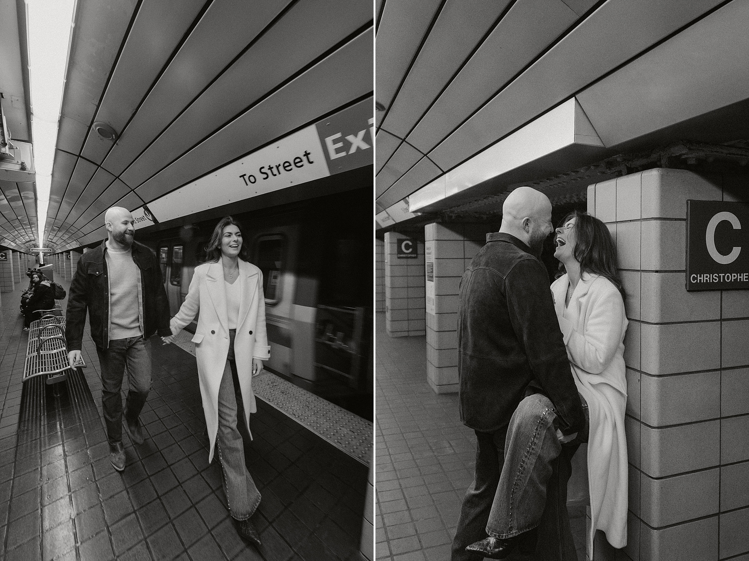 When you start an engagement session at the Hudson Tunnel in West Village in New York City, you know it’s going to be a good day. Molly and JB took the train over from their Hoboken apartment, and met us at the Christopher Street Station where our shoot began. Right under the streets of West Village. We kicked things off with some beautiful slow-exposure shots, capturing the rush of trains and the motion of New Yorkers weaving past. It was the perfect mix of city energy and romantic anticipation.